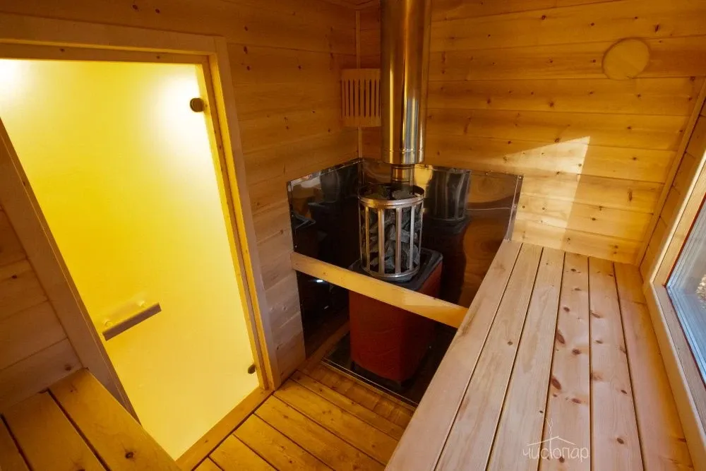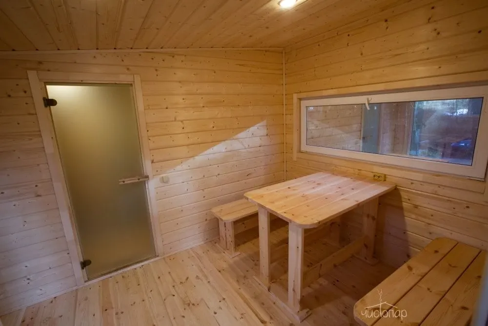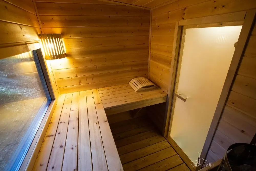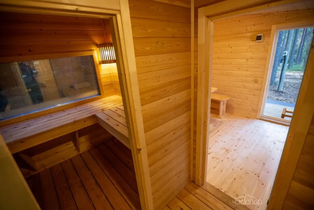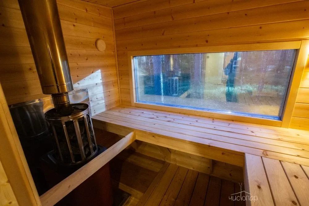 На территории комплекса находится русская баня, парилка в бане с панорамным окном с видом на лес.