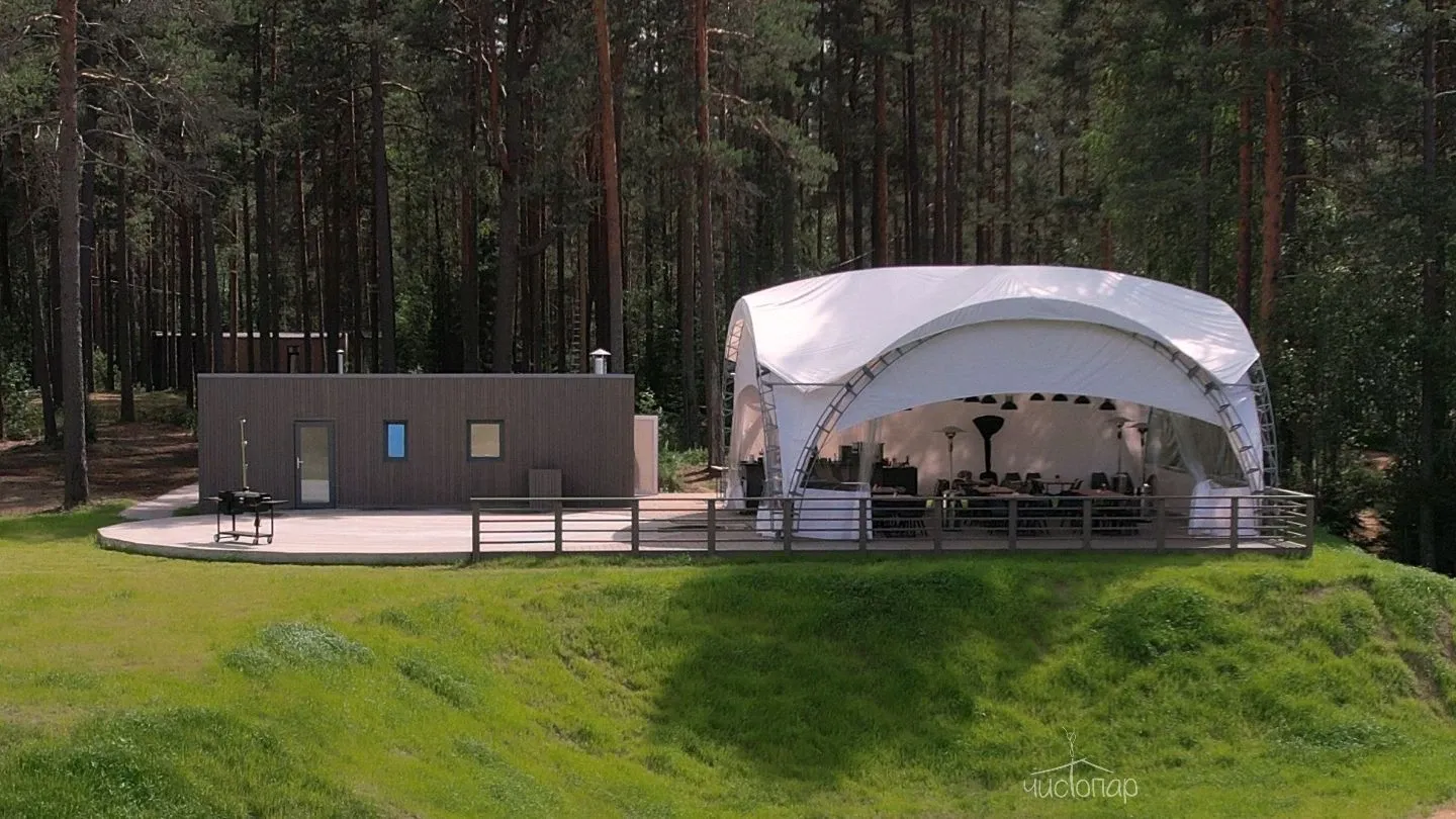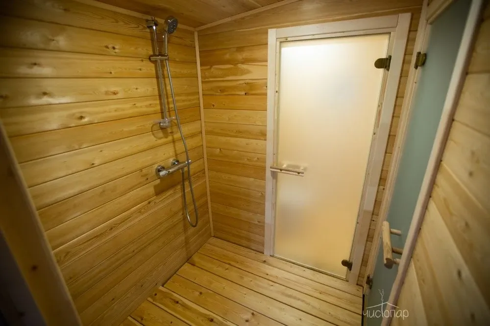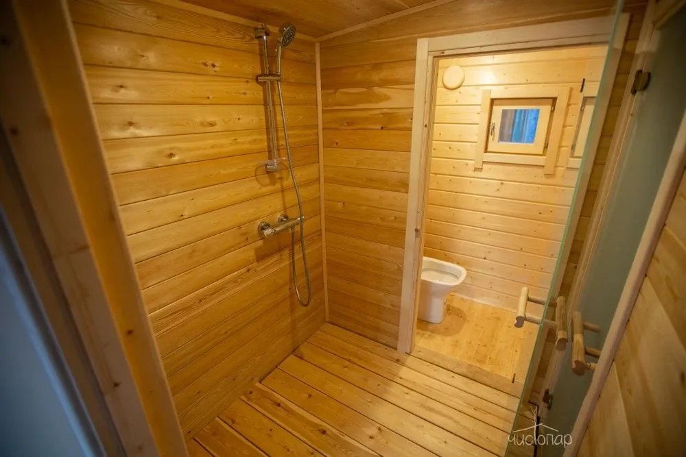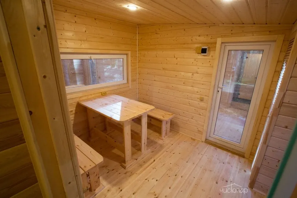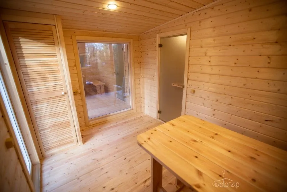 На территории комплекса находится русская баня, парилка в бане с панорамным окном с видом на лес.