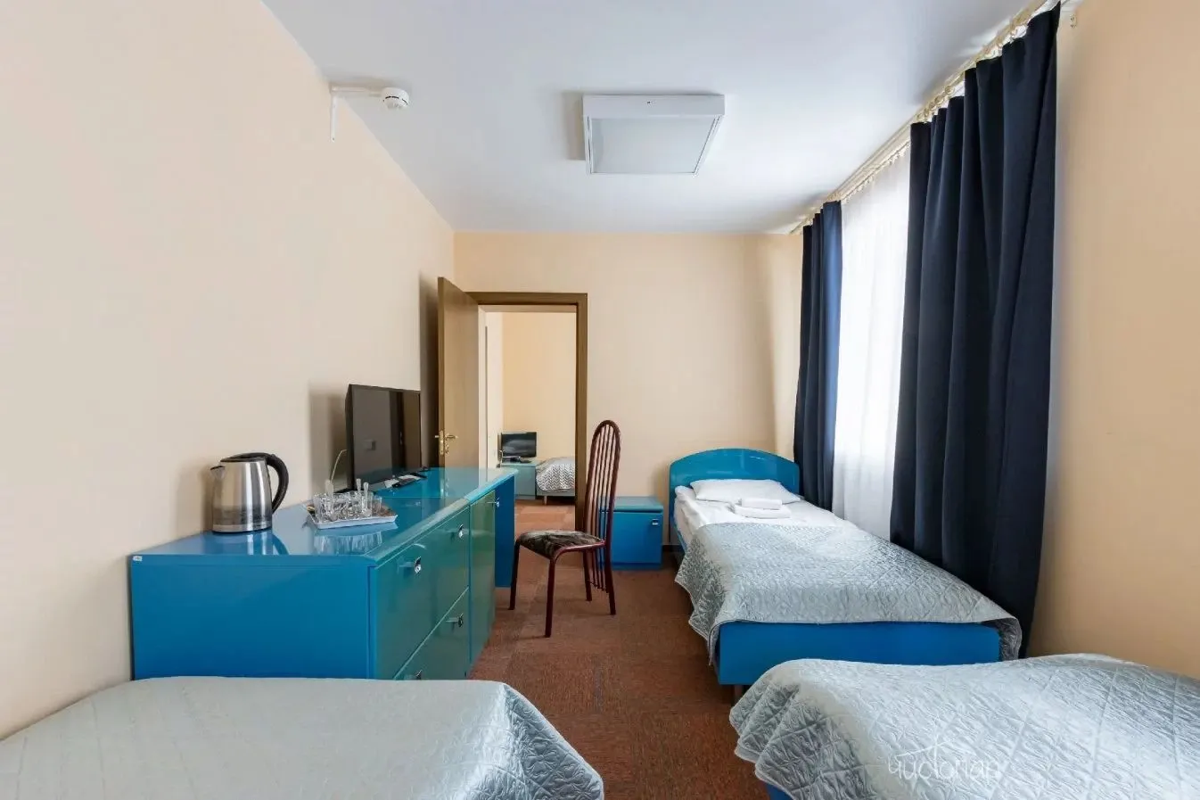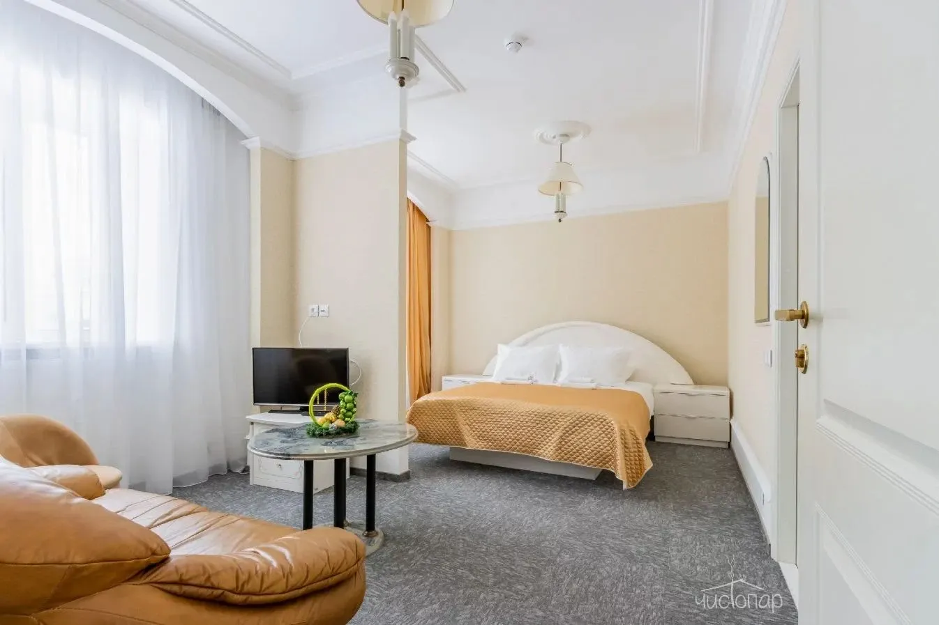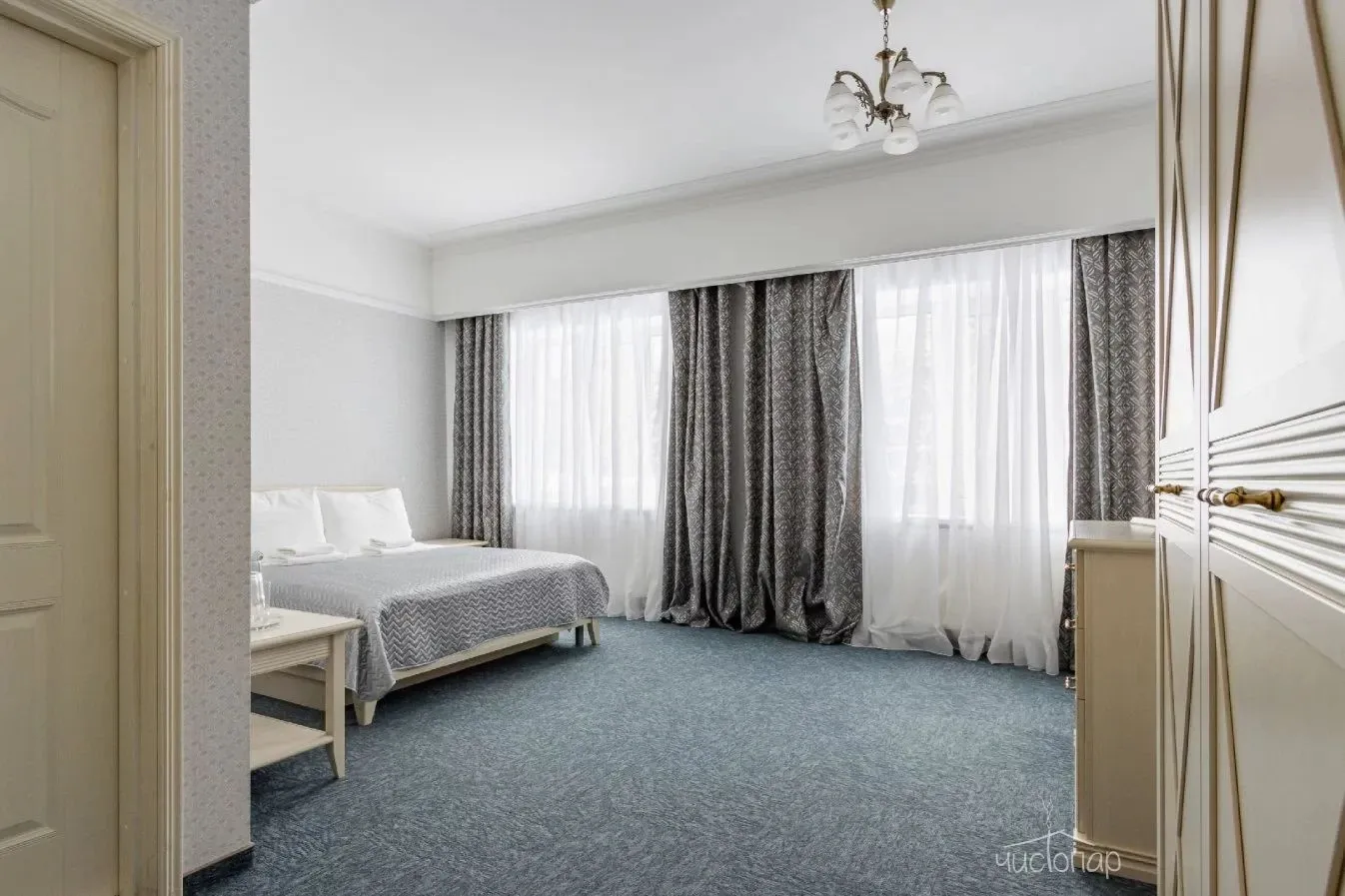 В номере: спальня с большой кроватью (160*200 см), вторая спальня с двумя полутора спальными кроватями , гостиная с мягкой кожаной мебелью и плоским ТВ, просторная прихожая, ванная комната с душевой кабиной и санузлом. Есть вся необходимая мебель, мини-холодильник, электрический чайник, туалетный и журнальный столики, пуф. Номера расположены на 2 этажах ВИП корпуса. В корпусе есть полностью оборудованная кухня и лаунж зона.Читать далее