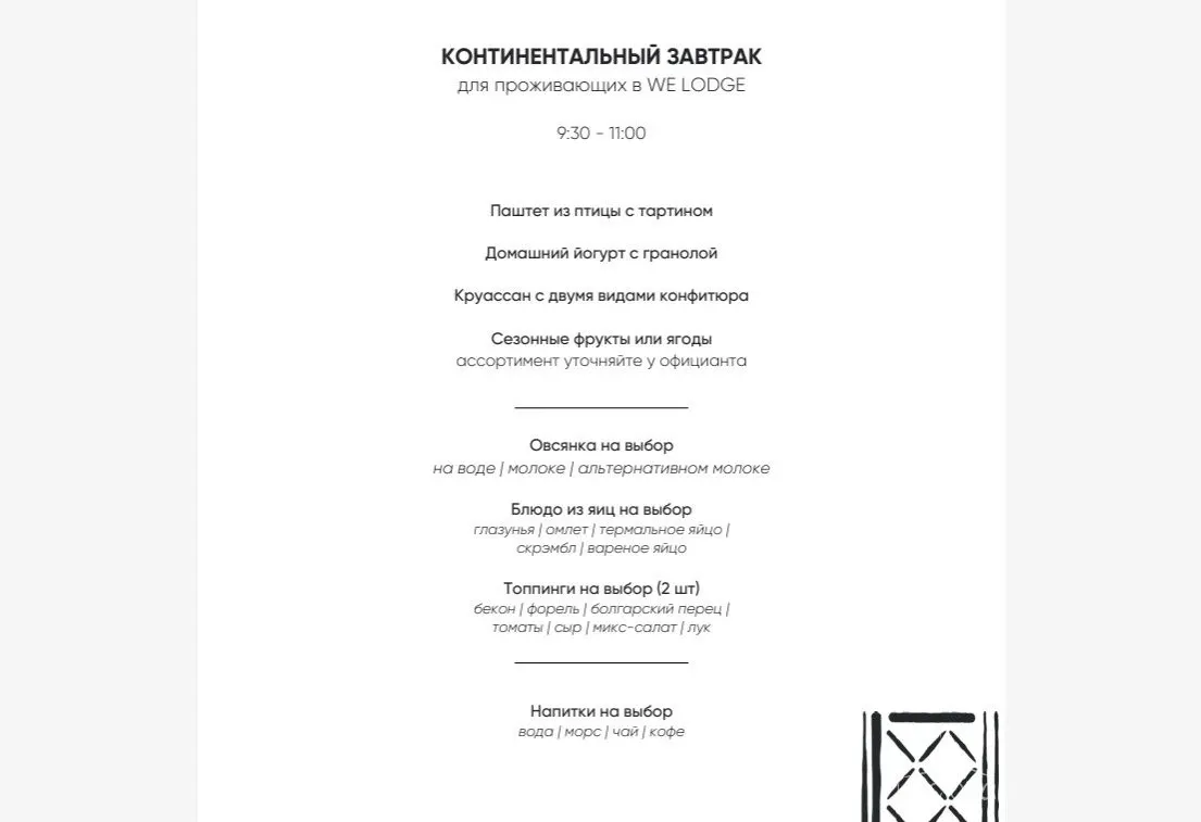 WE LODGE — это загородный клуб, в первую очередь ориентированный на комфортное проживание гостей. Помните, лодж, зоны BBQ и прилегающая к ним территория — это приватная зона, просим туда не заходить.