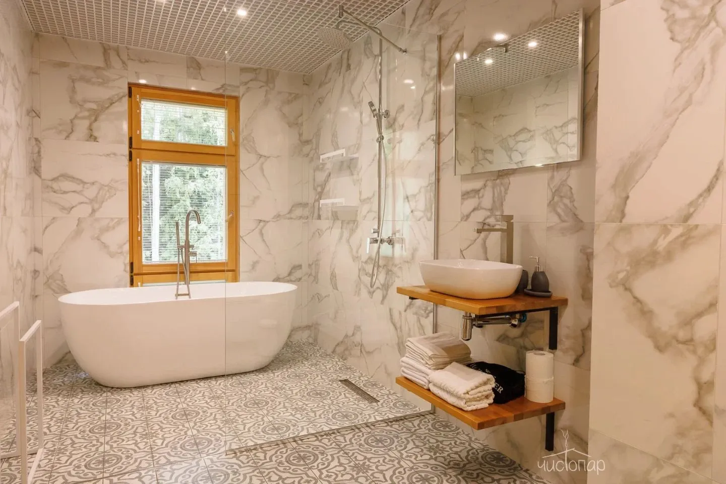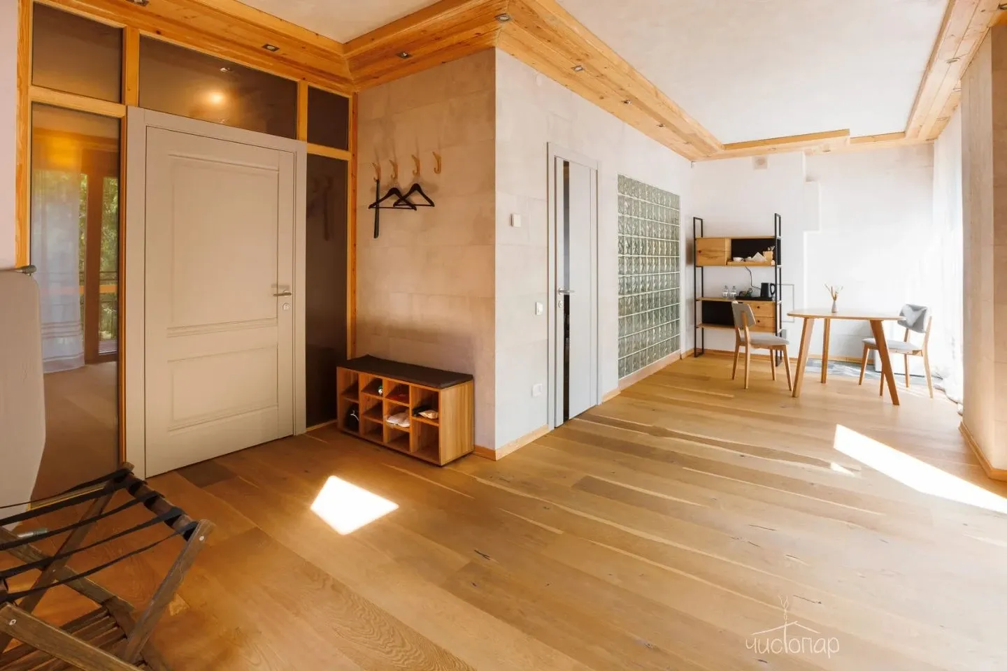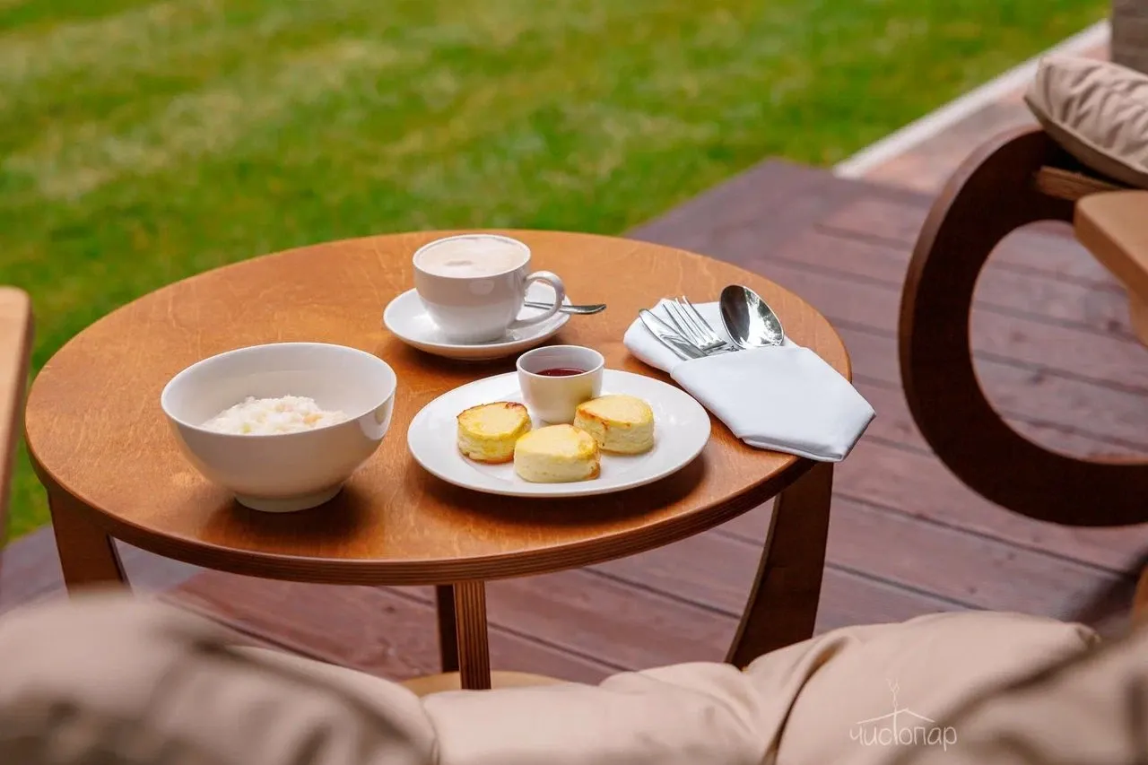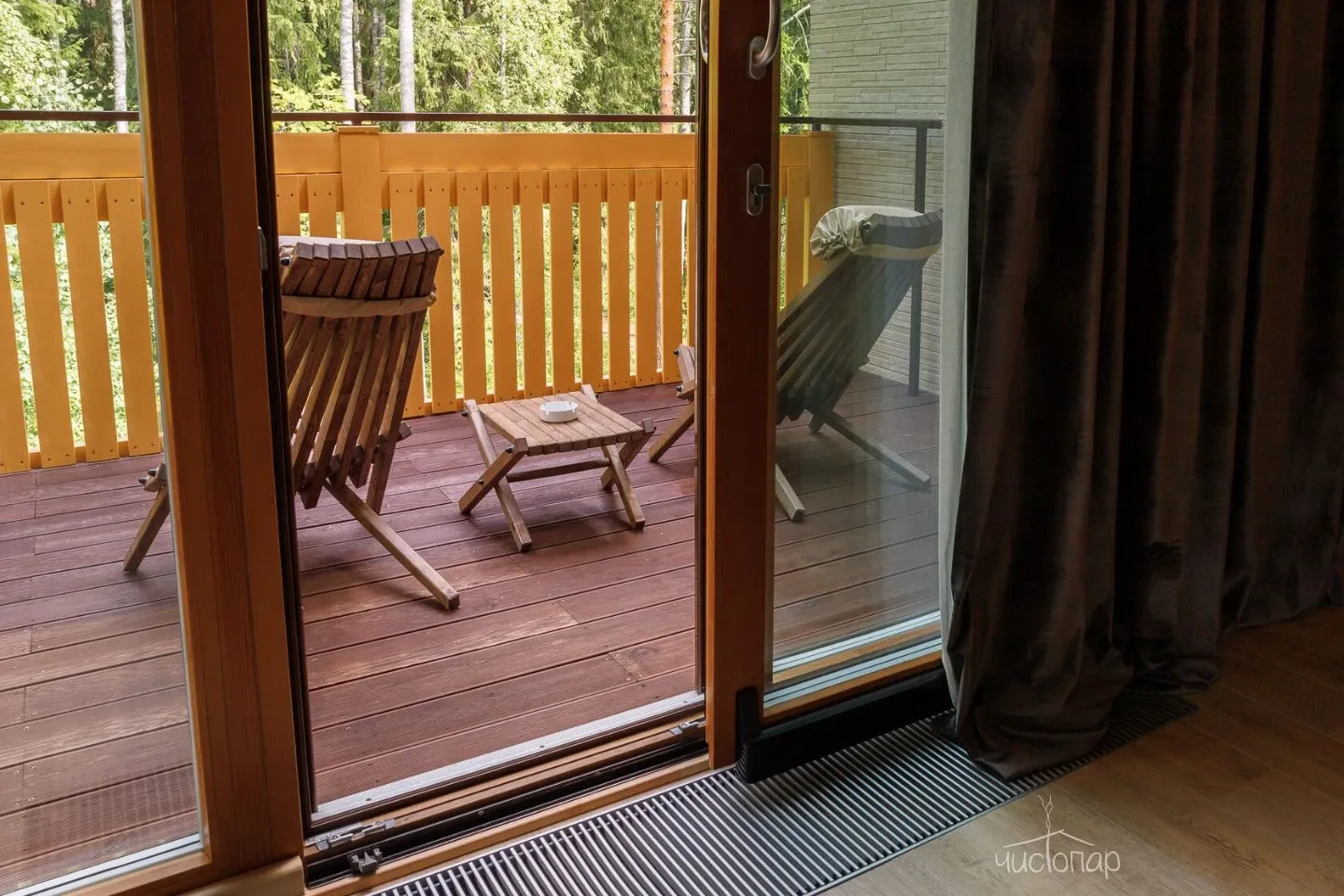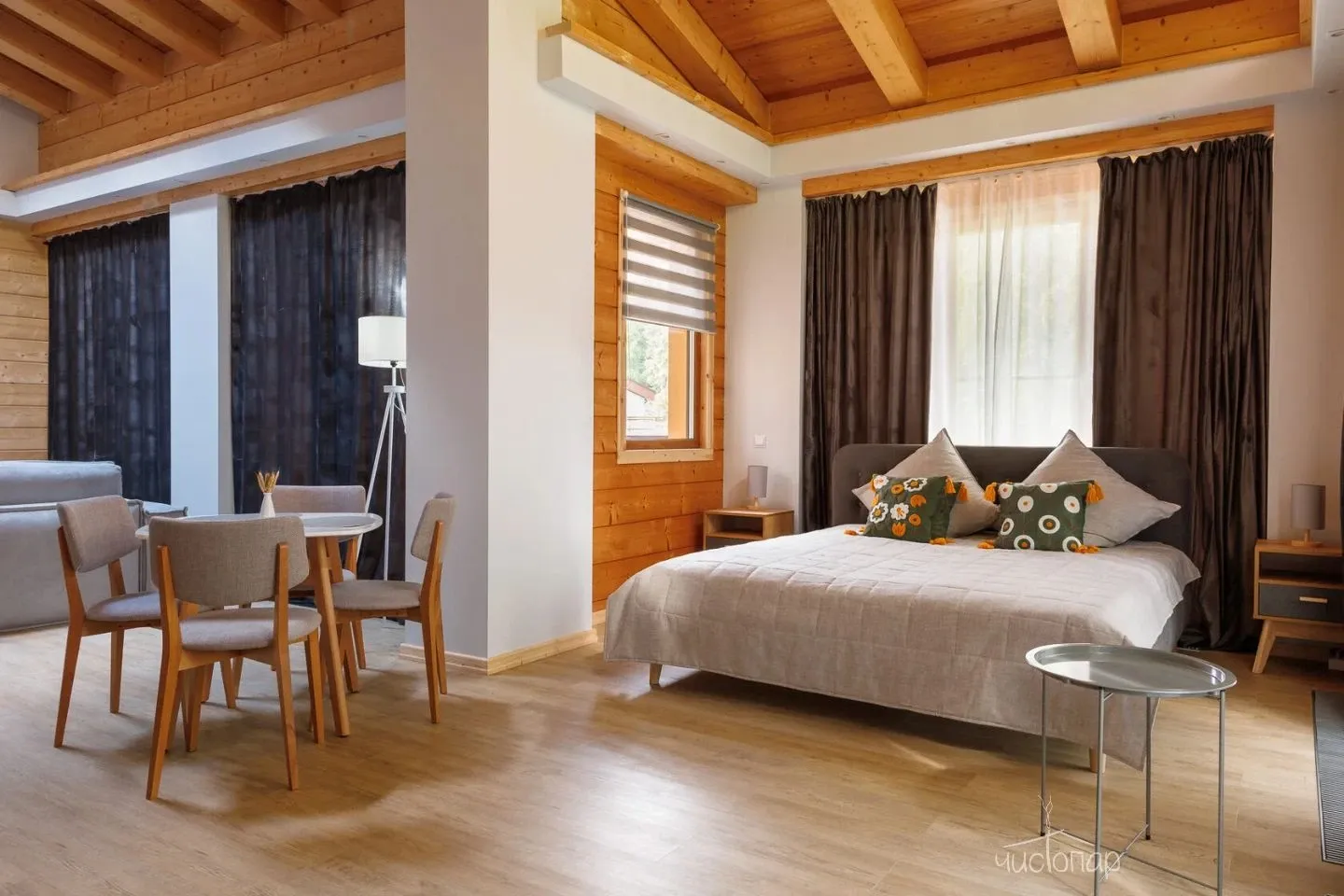 Проживание с пользованием кедровой бочкой, бассейном и джакузиДля проживания гостям предоставлены шале классической архитектуры и индивидуальным дизайном комнат. В основе дизайна и отделки лежат природные материалы: дерево, камень, хлопок и лён. Вне зависимости от типа размещения для комфорта: просторная ванная комната, телевизор, кондиционер, wi-fi и собственная терраса, постельное белье и косметика премиум сегмента. В стоимость проживания включен завтрак.