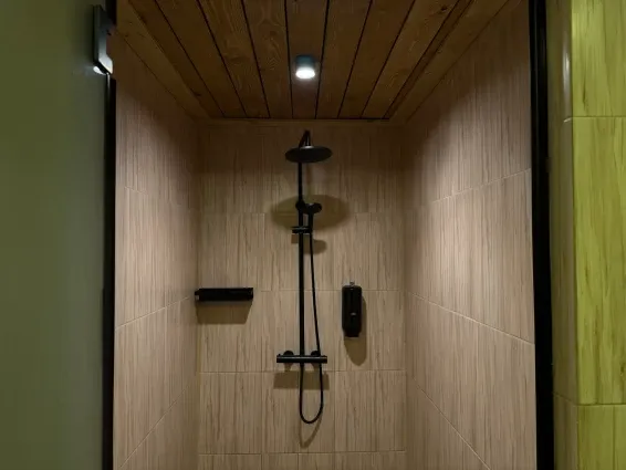 Уютная баня для небольшой компании. Одноэтажная баня с камином в гостиной зоне, уютной зоной отдыха с мебелью из массива дерева, удобным диваном, круглым столом и телевизором. Имеет просторную парную, в зоне помывочной — две душевые и обливные вёдра.