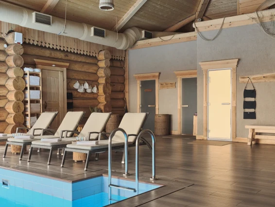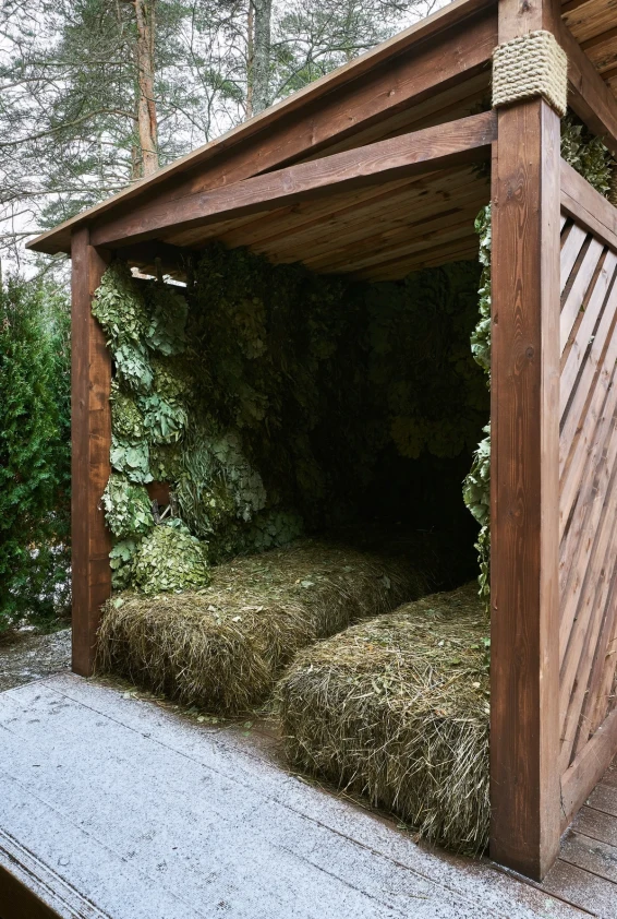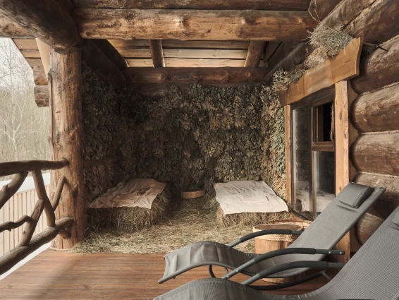 Удобства: две купели, просторная гостиная для отдыха, сеновал, раздевалка