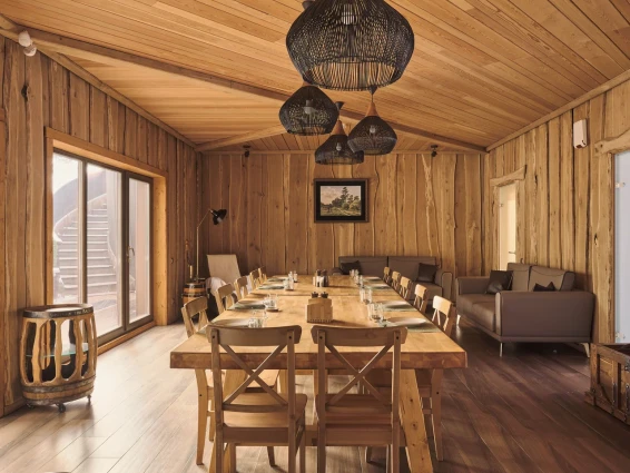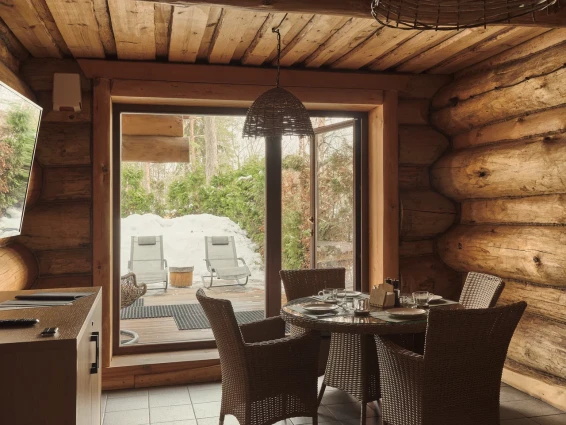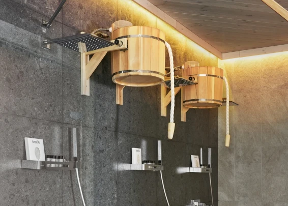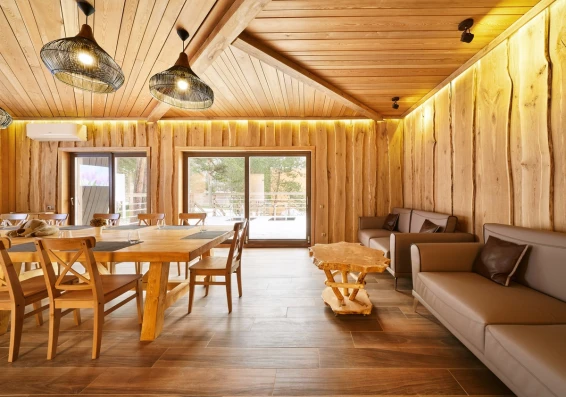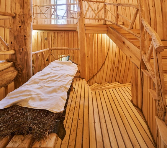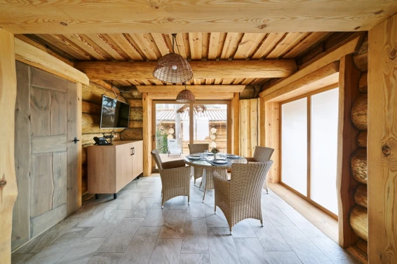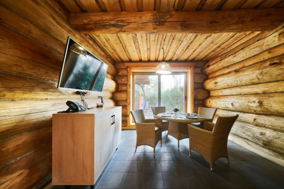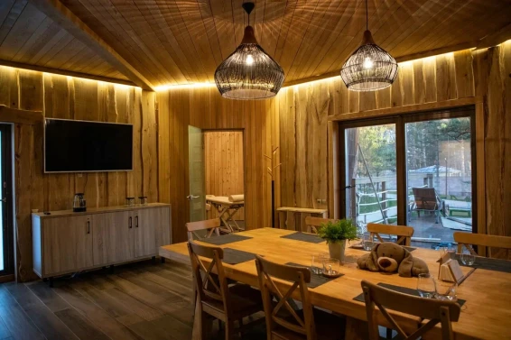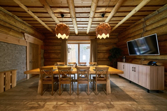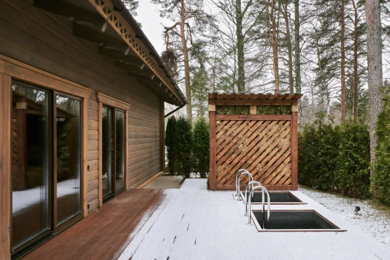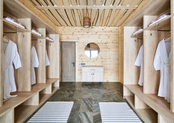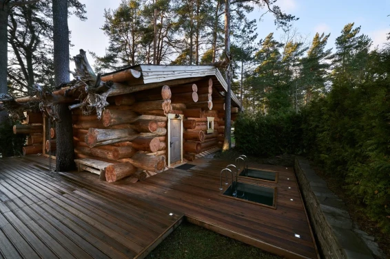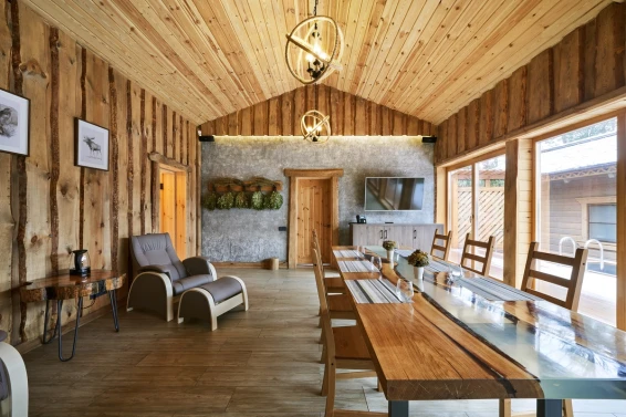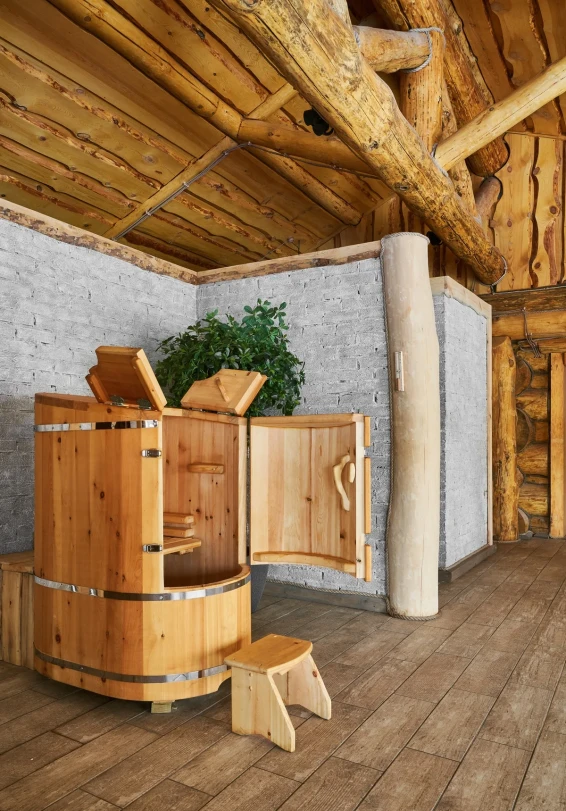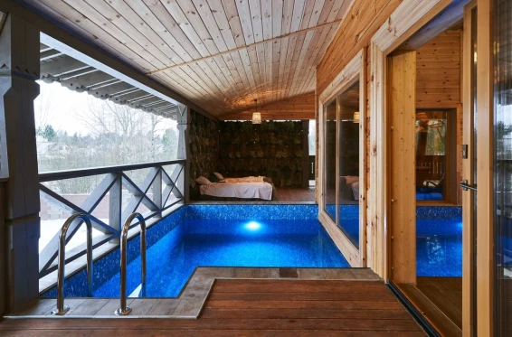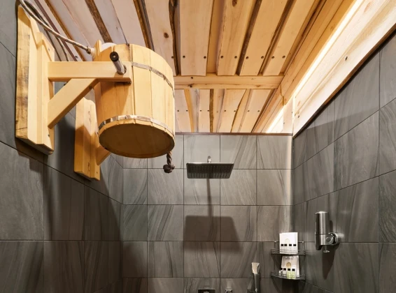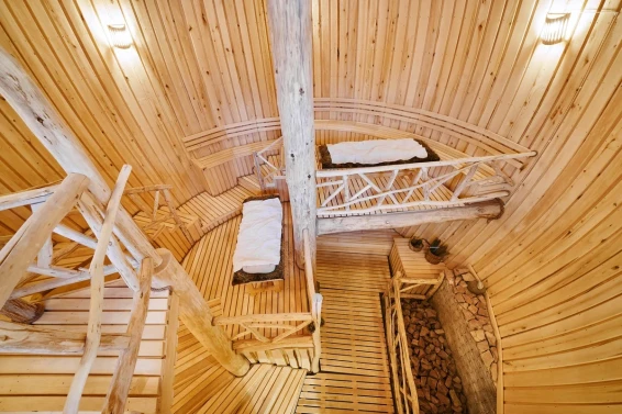 Удобства: терраса с двум купелями; душевые: стандартная, тропическая, «холодная бочка»; просторная гостиная для отдыха; сеновал; комната для СПА-процедур и массажа; раздевалка для большой компании.