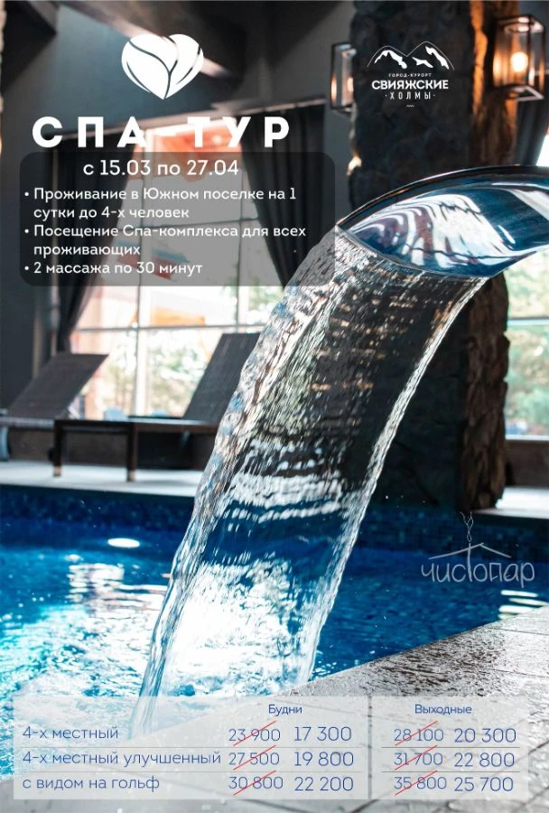 Всесезонный город-курорт "Свияжские холмы". Здесь для гостей работает WELLNESS CENTRE с настоящей финской сауной, хамамом, травяной и соляной саунами. Большой закрытый 20-метровый бассейн, летний уличный бассейн, детский бассейн, джакузи.