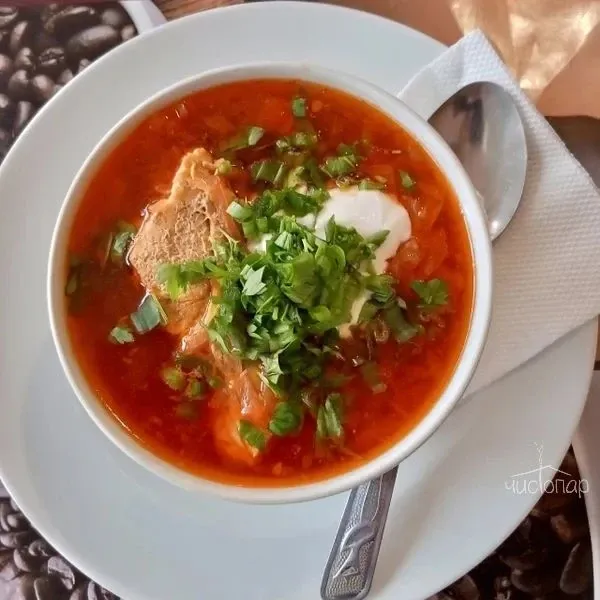 - на первое борщ, солянка, гороховый суп- пюре, куриный бульон с домашней лапшой.
