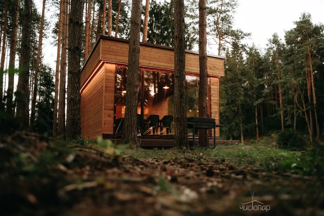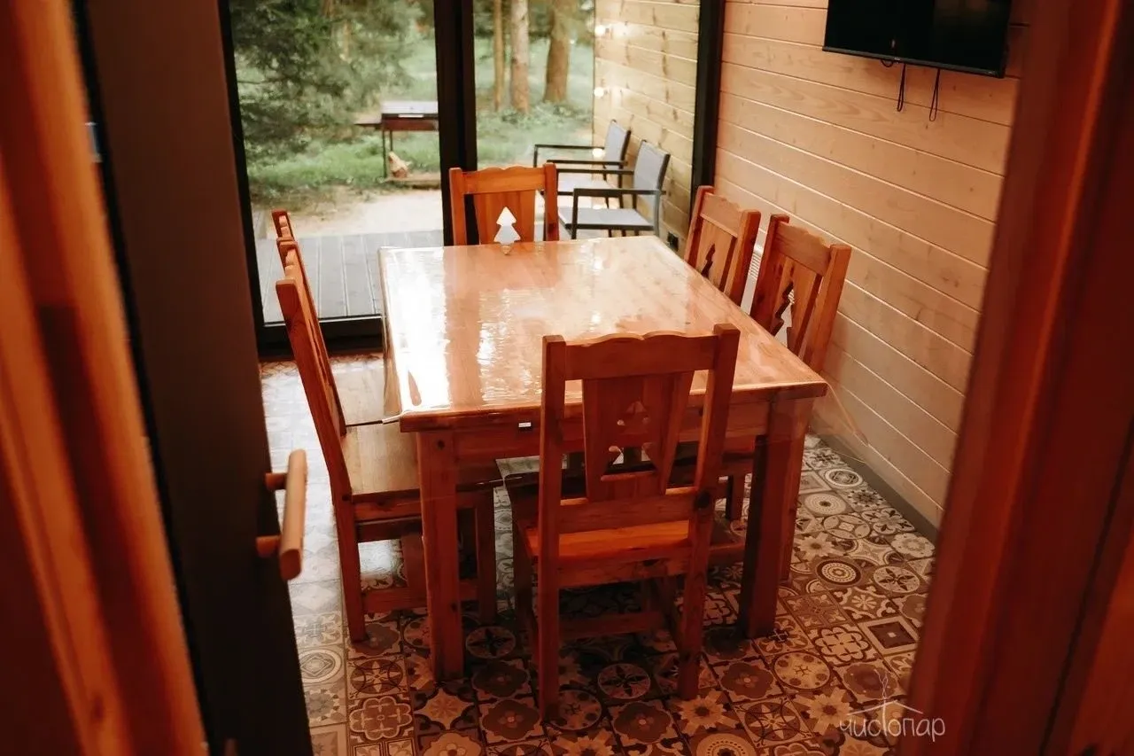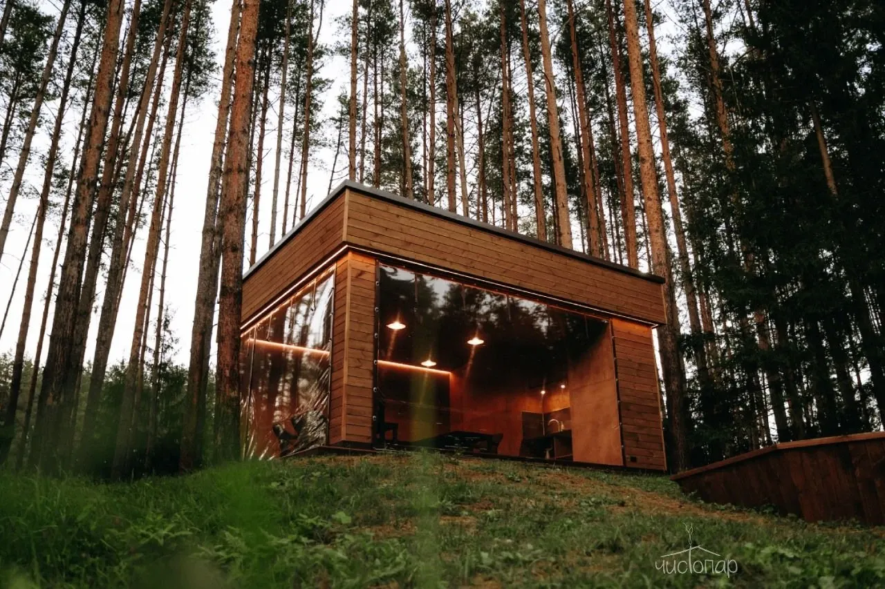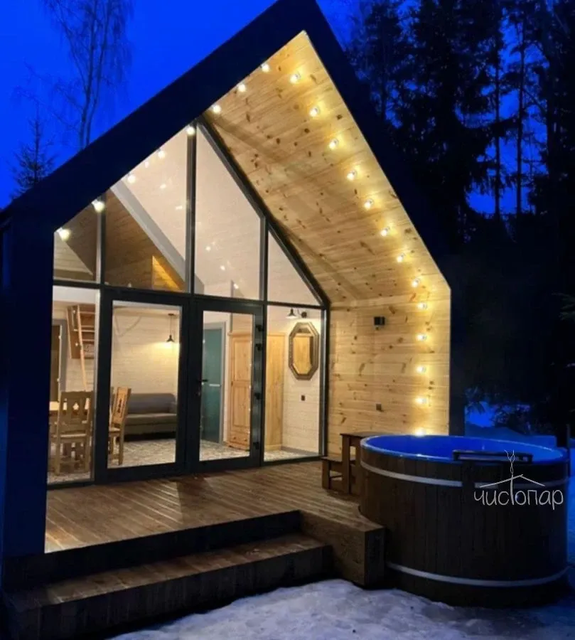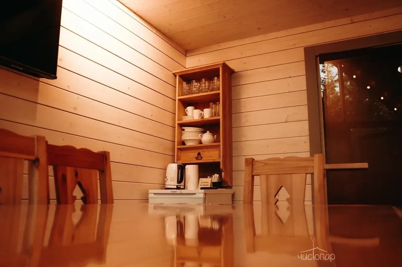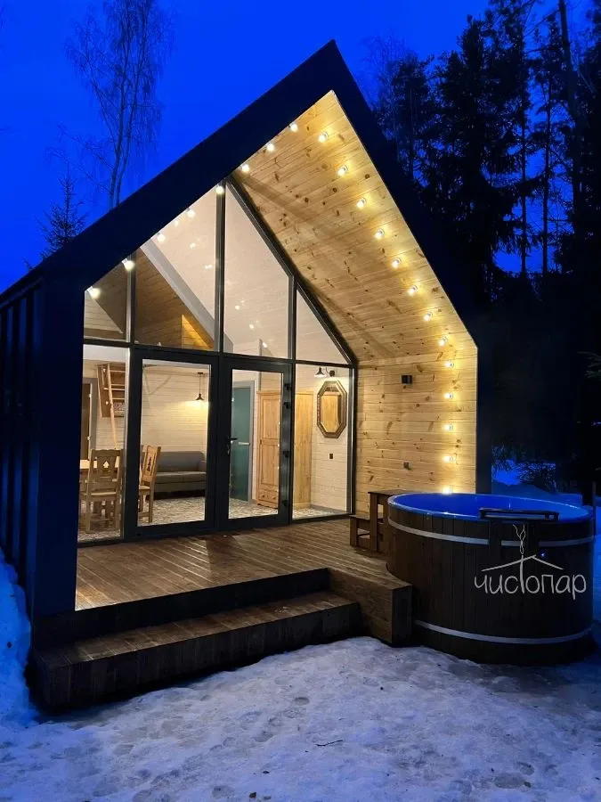 Дом имеет планировку студии и рассчитан на 2 спальных места. Интерьер студии максимально приближен к окружающей природе: вся мебель и предметы сделаны из дерева и экологичных материалов. Главной зоной комфорта в доме является джакузи, установленное у панорамного окна. В доме есть "Алиса" и система умного дома. Управлять светом и включить музыку можно сказав "Алисе" нужную команду. В потолок вмонтирована акустическая система. Панорамные окна дома открывают вид на реку Орша и создают особый уют, пропуская максимальное количество света. В доме расположена функциональная кухня с мойкой, варочной панелью, посудомоечной машиной, микроволновой печью, электрическим чайником, холодильником и набором посуды. На кухне расположен обеденный стол на 4 персоны. В центре дома просторная гостиная с креслами, двуспальной кроватью с удобными матрацами, Smart TV. Особый уют придает биокамин. Для размещения детей до 2 лет мы предлагаем воспользоваться детской кроваткой (по запросу). В доме работает Wi-Fi. Санузел укомплектован индивидуальными средствами гигиены: зубная паста и щетка, шампунь, гель для душа; полотенца, фен. В доме есть кондиционер, подоконники с подогревом. Снаружи коттеджа оборудована отдельная зона отдыха с мангалом, шампурами и решеткой. В доме применена отделка старинной доской 19 века.