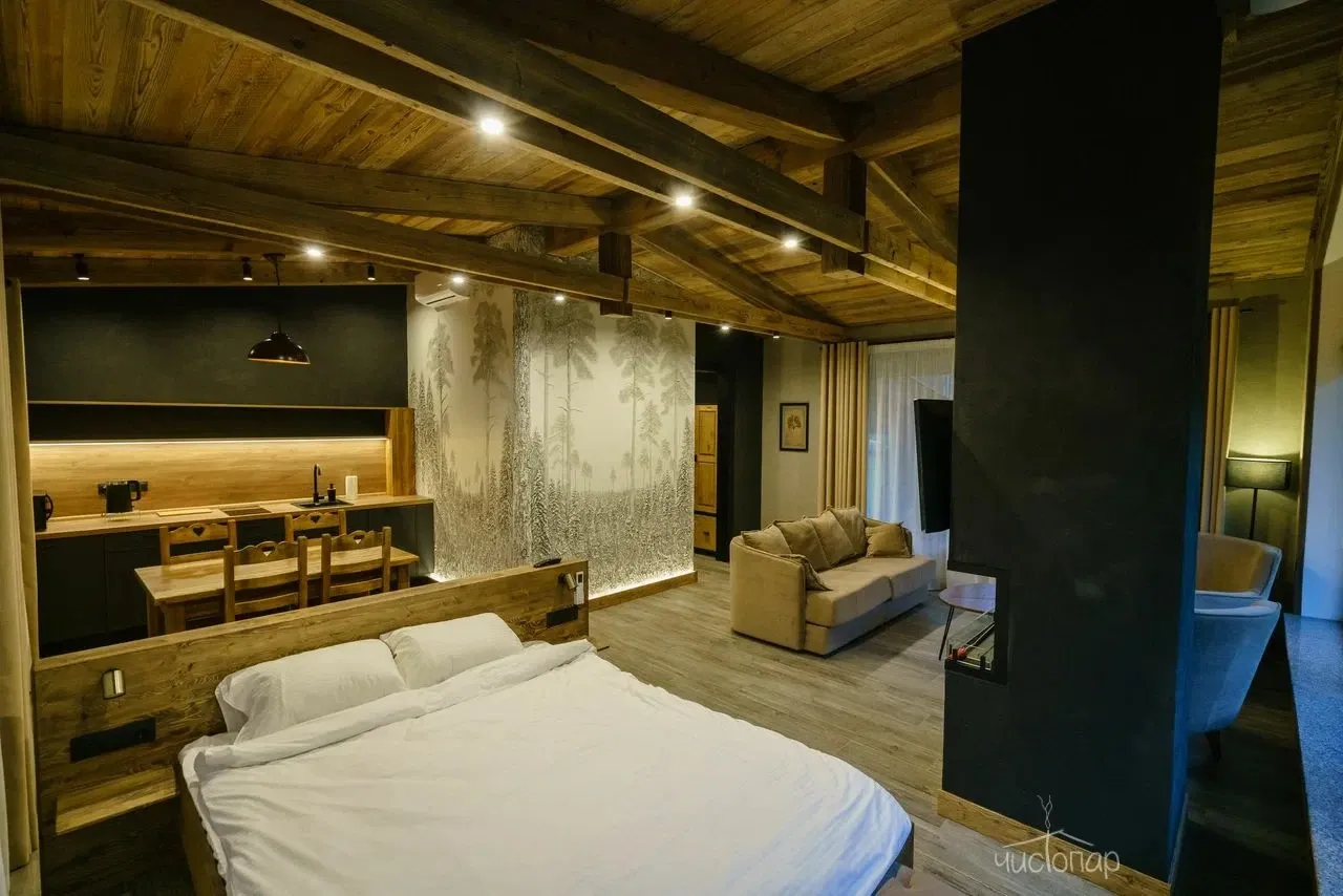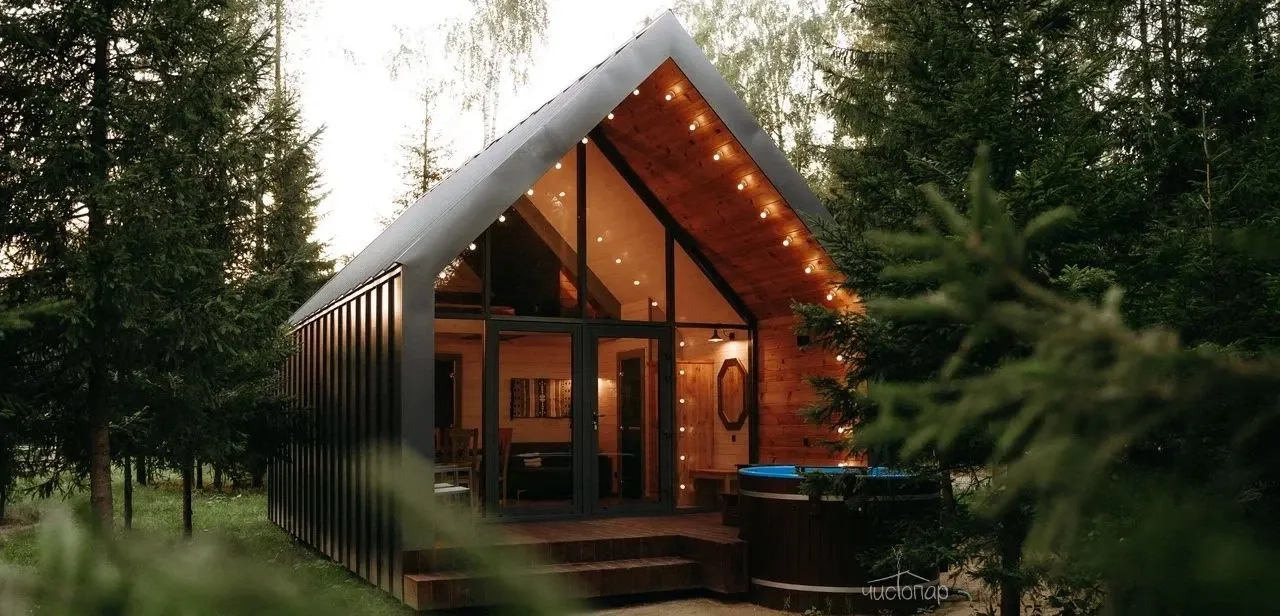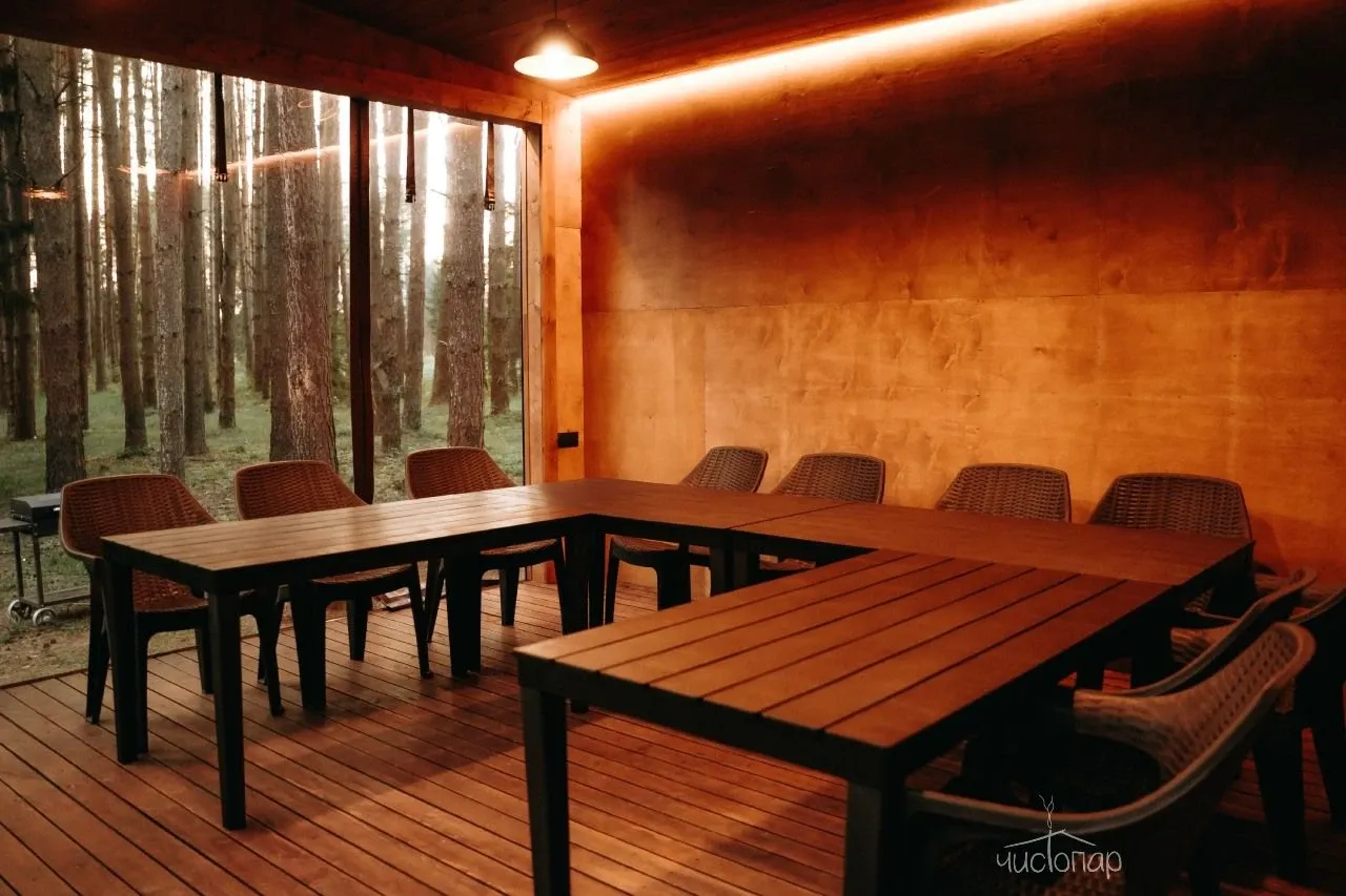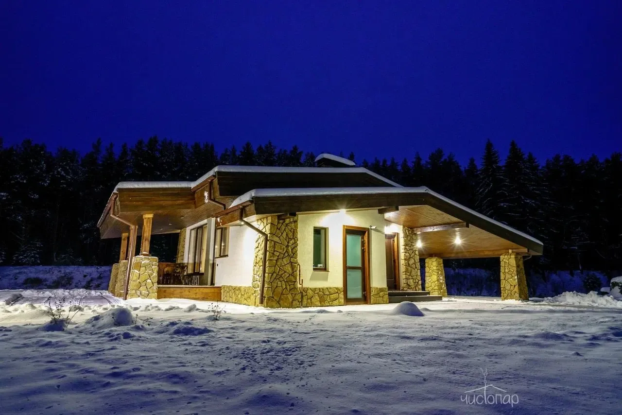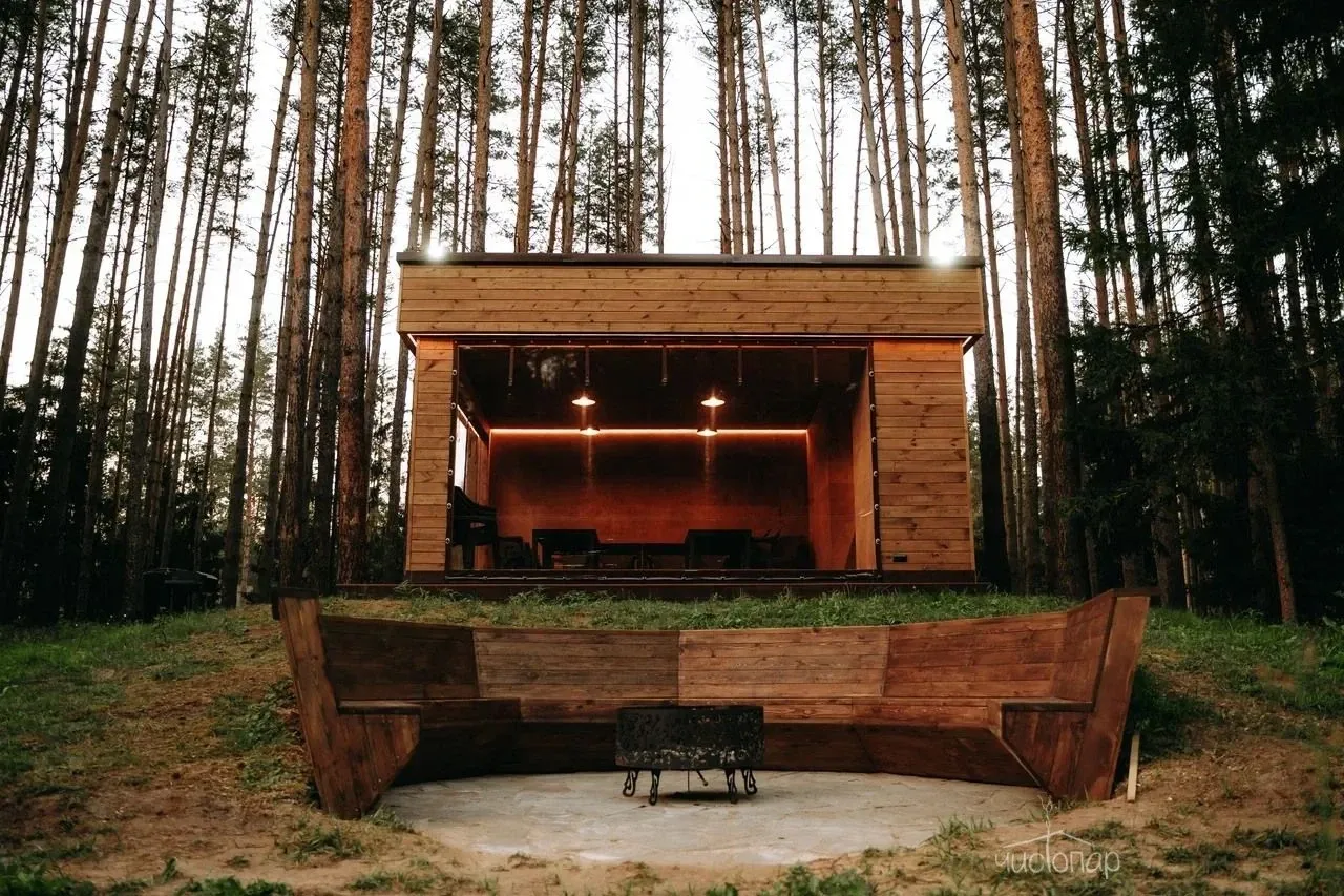 Дом имеет планировку студии и рассчитан на 2 спальных места. Интерьер студии максимально приближен к окружающей природе: вся мебель и предметы сделаны из дерева и экологичных материалов. Главной зоной комфорта в доме является джакузи, установленное у панорамного окна. В доме есть "Алиса" и система умного дома. Управлять светом и включить музыку можно сказав "Алисе" нужную команду. В потолок вмонтирована акустическая система. Панорамные окна дома открывают вид на реку Орша и создают особый уют, пропуская максимальное количество света. В доме расположена функциональная кухня с мойкой, варочной панелью, посудомоечной машиной, микроволновой печью, электрическим чайником, холодильником и набором посуды. На кухне расположен обеденный стол на 4 персоны. В центре дома просторная гостиная с креслами, двуспальной кроватью с удобными матрацами, Smart TV. Особый уют придает биокамин. Для размещения детей до 2 лет мы предлагаем воспользоваться детской кроваткой (по запросу). В доме работает Wi-Fi. Санузел укомплектован индивидуальными средствами гигиены: зубная паста и щетка, шампунь, гель для душа; полотенца, фен. В доме есть кондиционер, подоконники с подогревом. Снаружи коттеджа оборудована отдельная зона отдыха с мангалом, шампурами и решеткой. В доме применена отделка старинной доской 19 века.