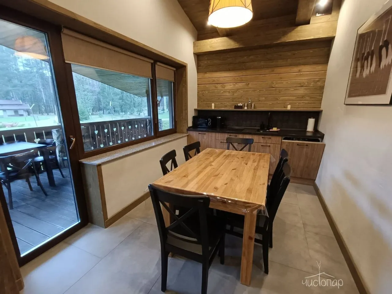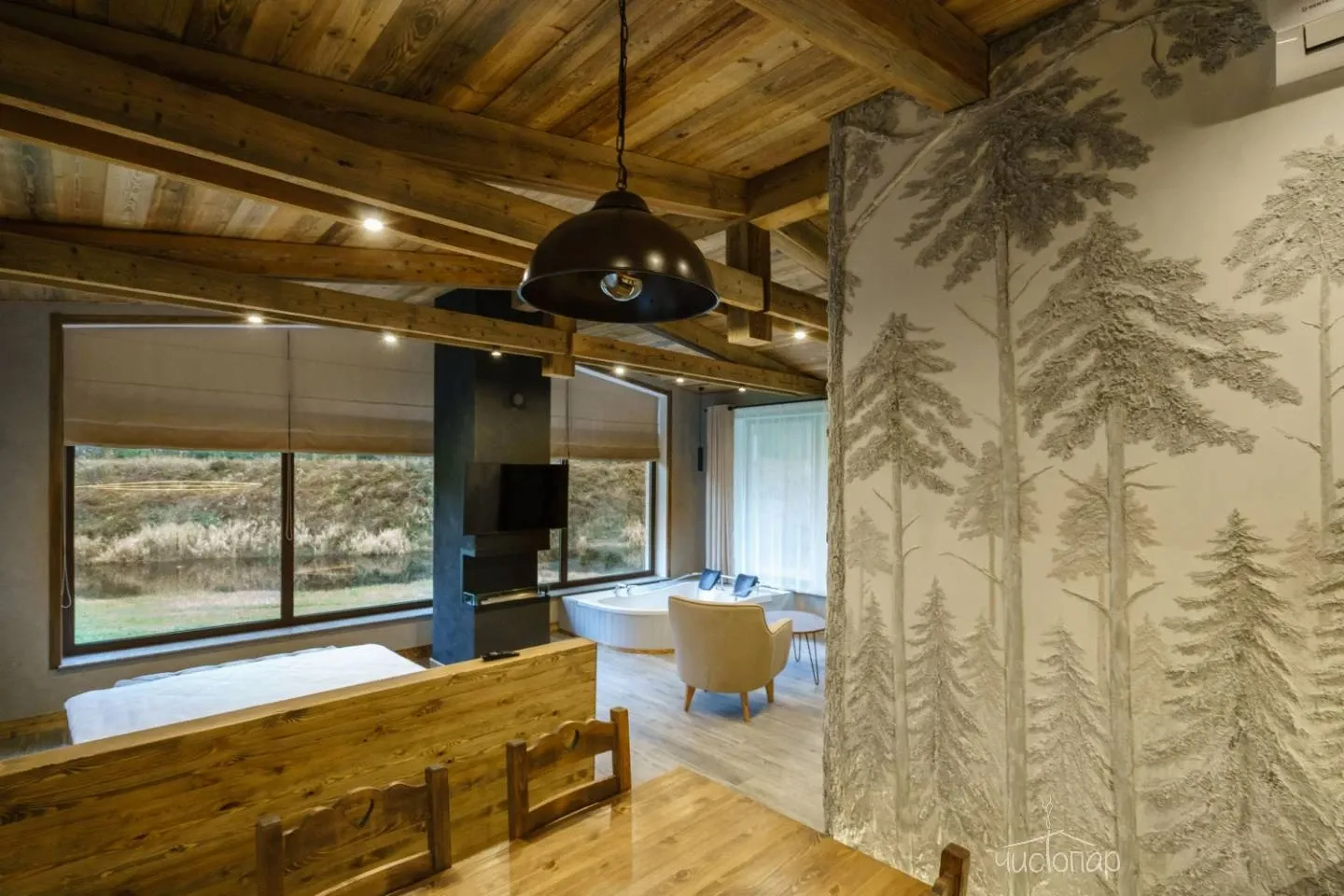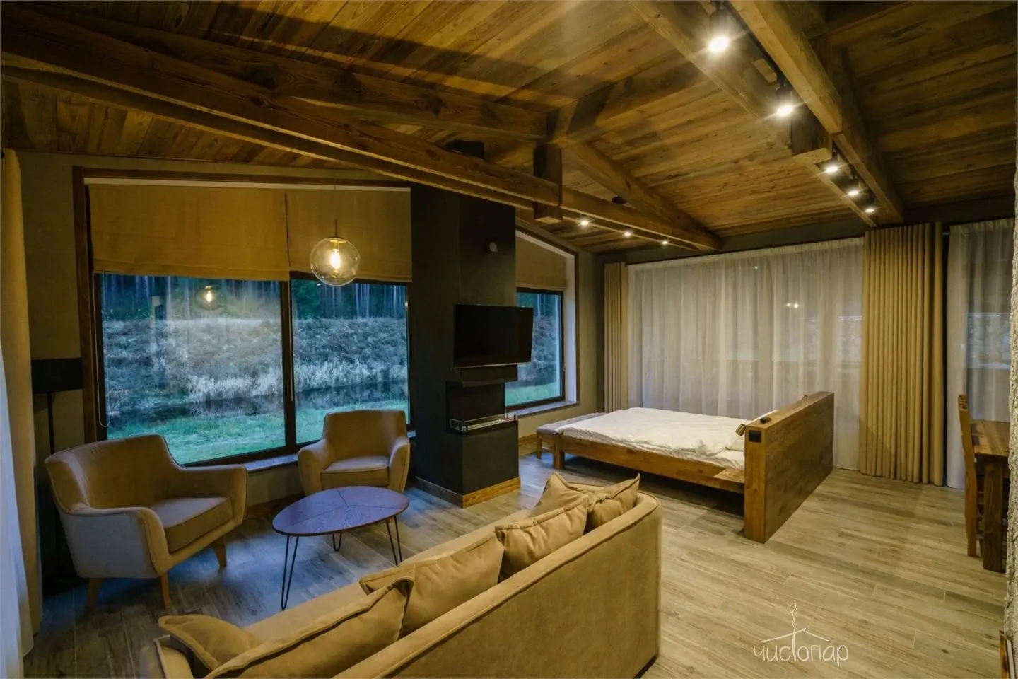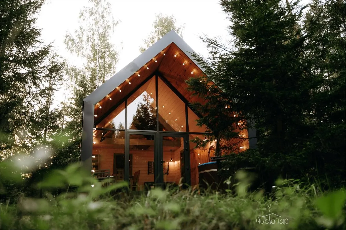Дом имеет планировку студии и рассчитан на 2 спальных места. Интерьер студии максимально приближен к окружающей природе: вся мебель и предметы сделаны из дерева и экологичных материалов. Главной зоной комфорта в доме является джакузи, установленное у панорамного окна. В доме есть "Алиса" и система умного дома. Управлять светом и включить музыку можно сказав "Алисе" нужную команду. В потолок вмонтирована акустическая система. Панорамные окна дома открывают вид на реку Орша и создают особый уют, пропуская максимальное количество света. В доме расположена функциональная кухня с мойкой, варочной панелью, посудомоечной машиной, микроволновой печью, электрическим чайником, холодильником и набором посуды. На кухне расположен обеденный стол на 4 персоны. В центре дома просторная гостиная с креслами, двуспальной кроватью с удобными матрацами, Smart TV. Особый уют придает биокамин. Для размещения детей до 2 лет мы предлагаем воспользоваться детской кроваткой (по запросу). В доме работает Wi-Fi. Санузел укомплектован индивидуальными средствами гигиены: зубная паста и щетка, шампунь, гель для душа; полотенца, фен. В доме есть кондиционер, подоконники с подогревом. Снаружи коттеджа оборудована отдельная зона отдыха с мангалом, шампурами и решеткой. В доме применена отделка старинной доской 19 века.