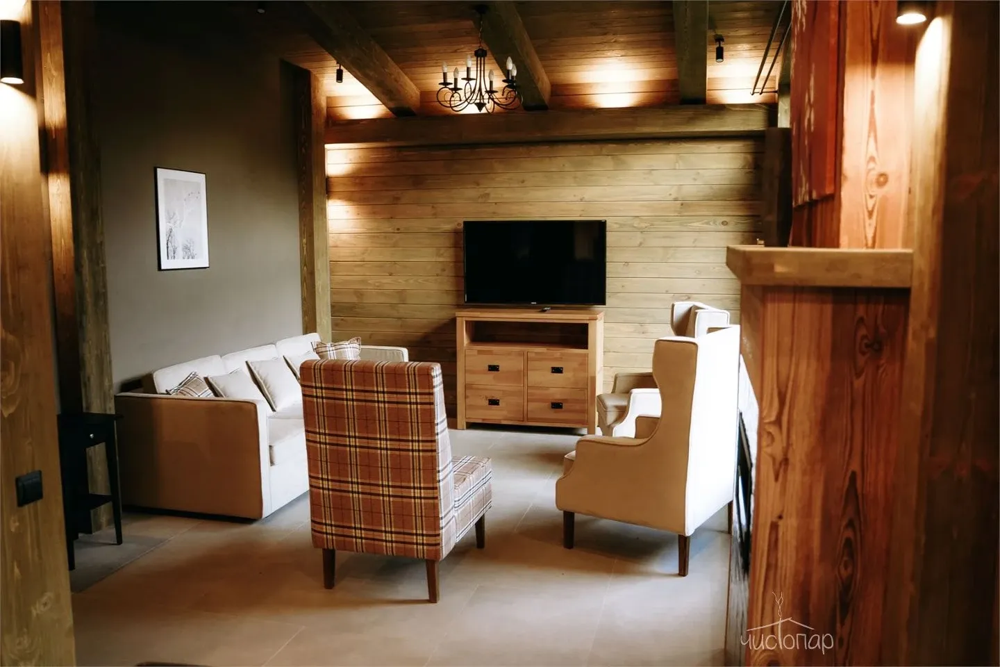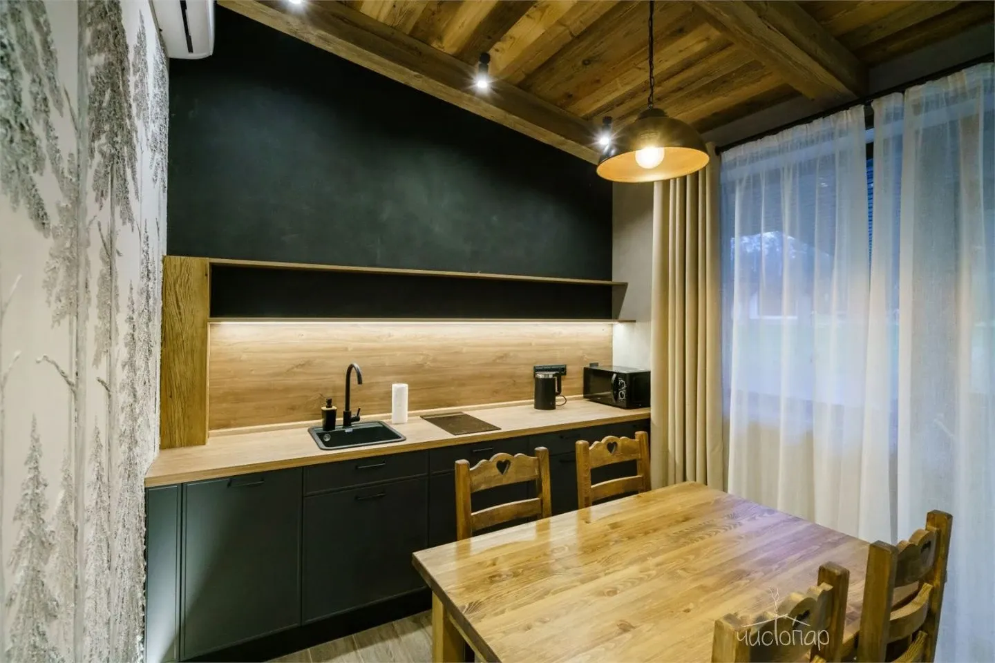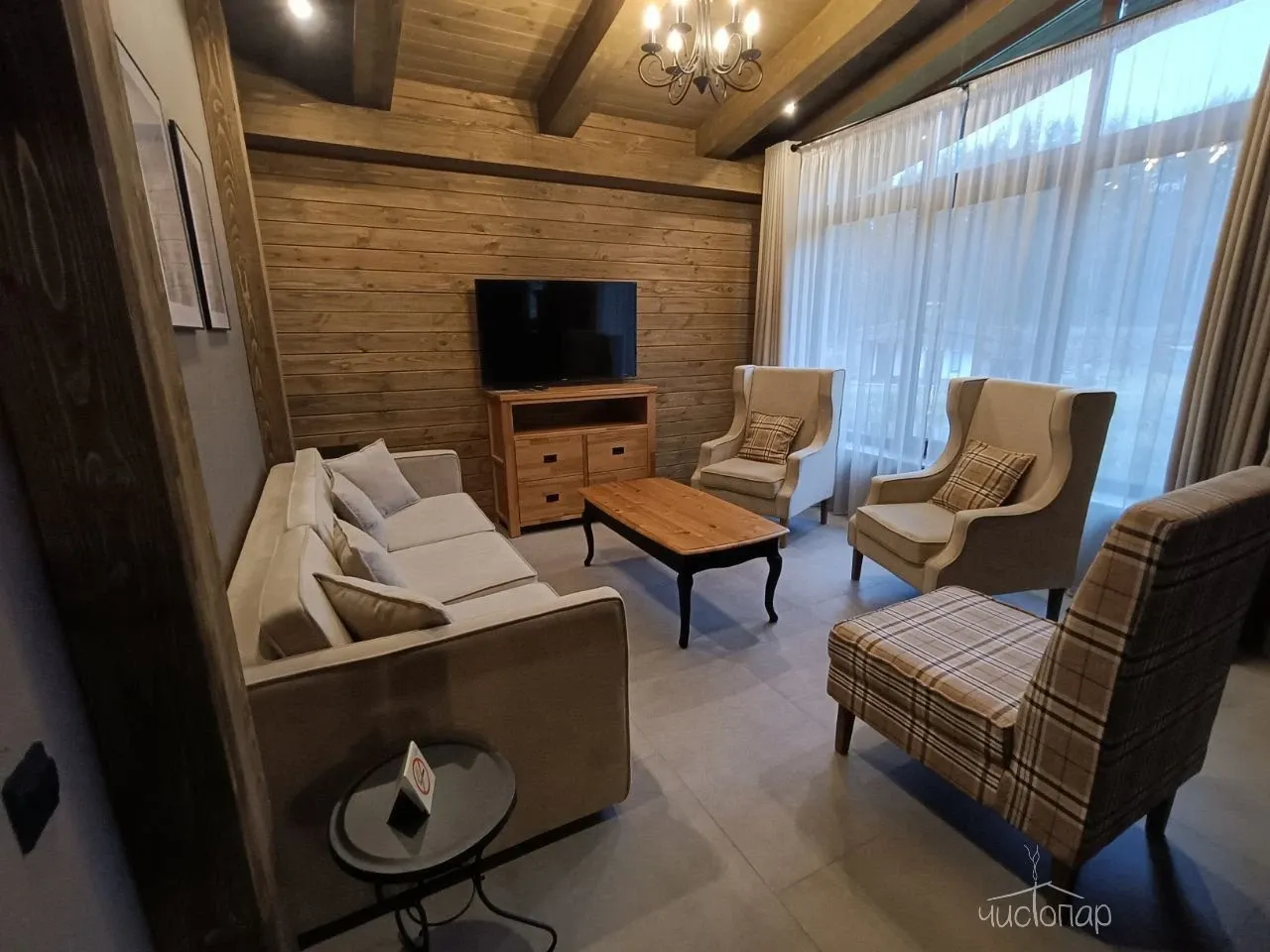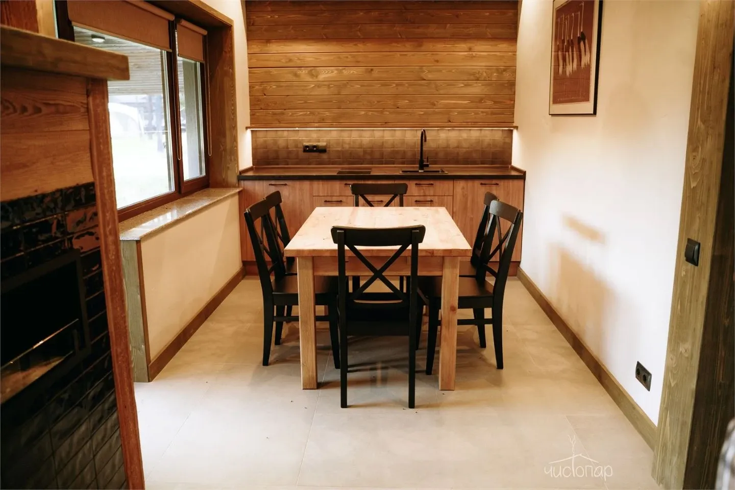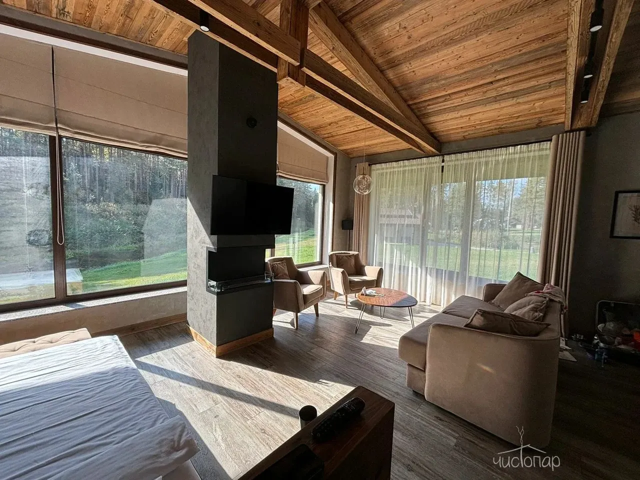 Дом имеет планировку студии и рассчитан на 2 спальных места. Интерьер студии максимально приближен к окружающей природе: вся мебель и предметы сделаны из дерева и экологичных материалов. Главной зоной комфорта в доме является джакузи, установленное у панорамного окна. В доме есть "Алиса" и система умного дома. Управлять светом и включить музыку можно сказав "Алисе" нужную команду. В потолок вмонтирована акустическая система. Панорамные окна дома открывают вид на реку Орша и создают особый уют, пропуская максимальное количество света. В доме расположена функциональная кухня с мойкой, варочной панелью, посудомоечной машиной, микроволновой печью, электрическим чайником, холодильником и набором посуды. На кухне расположен обеденный стол на 4 персоны. В центре дома просторная гостиная с креслами, двуспальной кроватью с удобными матрацами, Smart TV. Особый уют придает биокамин. Для размещения детей до 2 лет мы предлагаем воспользоваться детской кроваткой (по запросу). В доме работает Wi-Fi. Санузел укомплектован индивидуальными средствами гигиены: зубная паста и щетка, шампунь, гель для душа; полотенца, фен. В доме есть кондиционер, подоконники с подогревом. Снаружи коттеджа оборудована отдельная зона отдыха с мангалом, шампурами и решеткой. В доме применена отделка старинной доской 19 века.