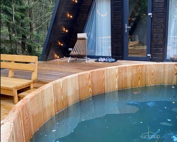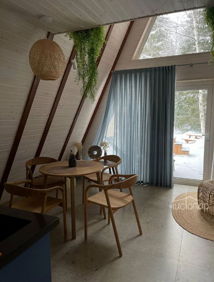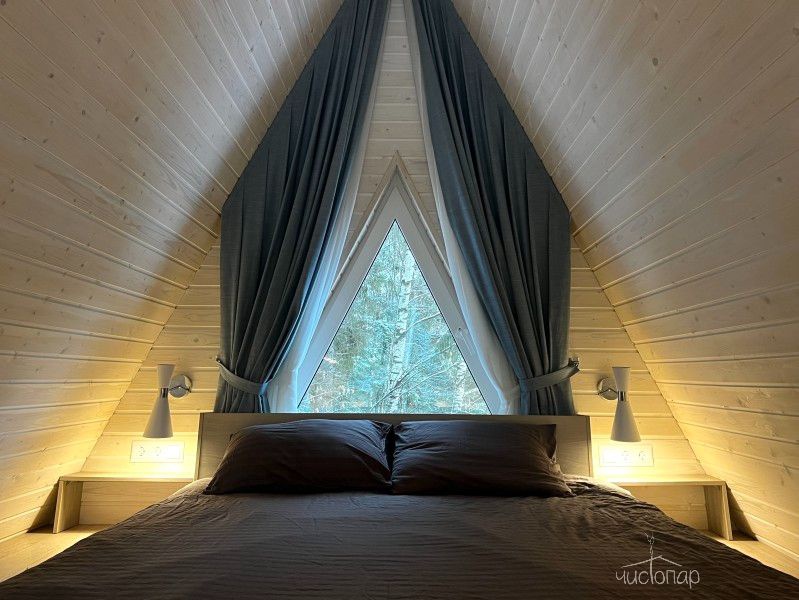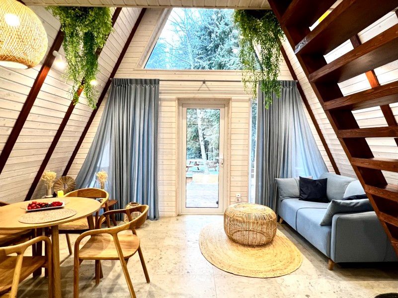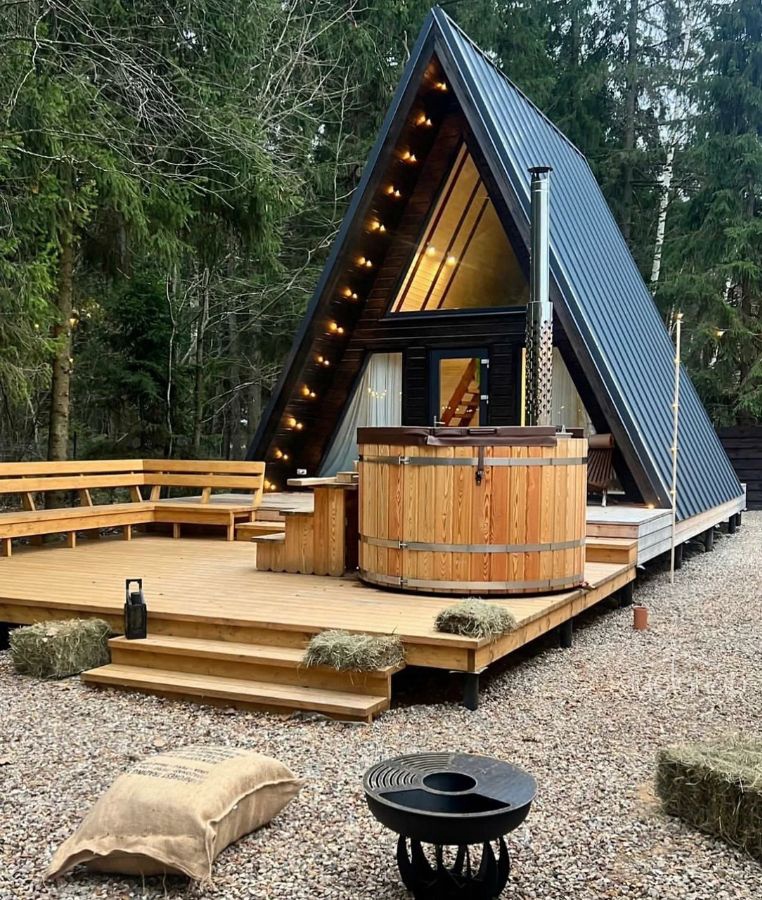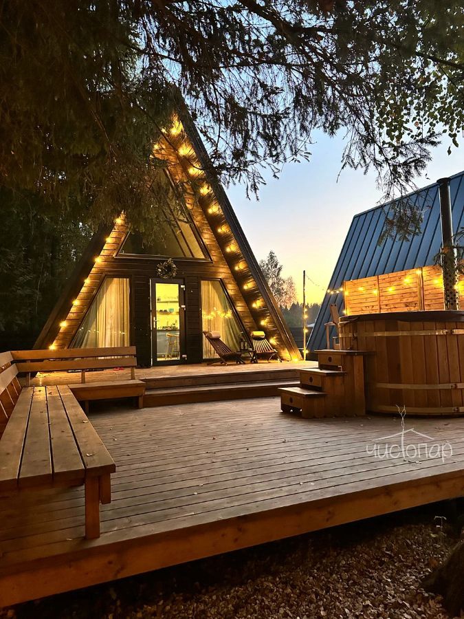 В треугольных домиках с горячими купелями или банным чаном, расположенных на территории, можно насладиться тишиной и спокойствием в окружении соснового и березового леса. Внутри А-фреймов уютно, красиво, есть все необходимое для комфортного проживания.
