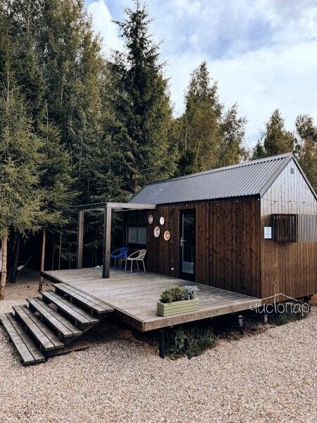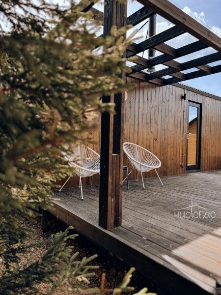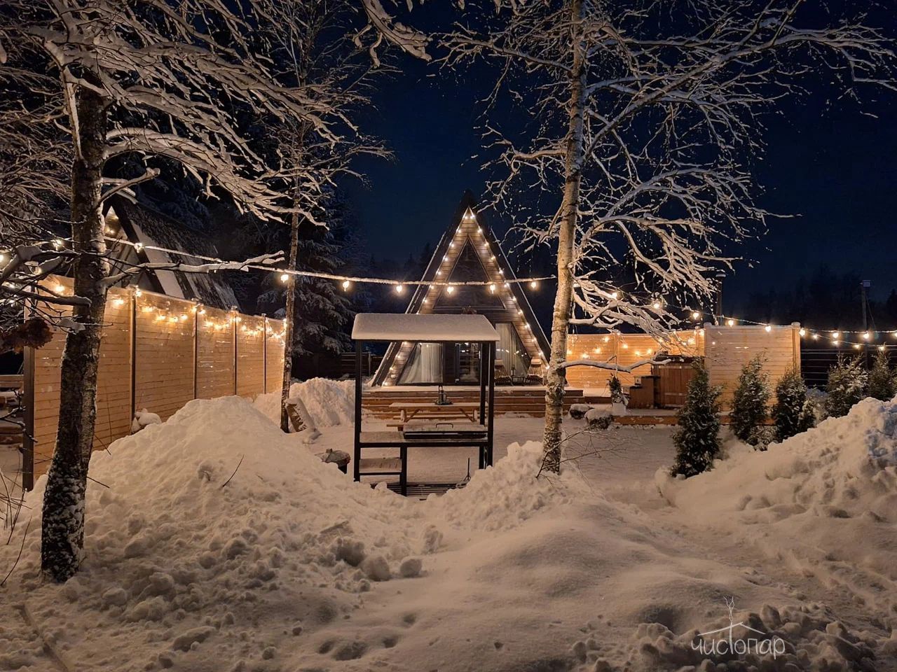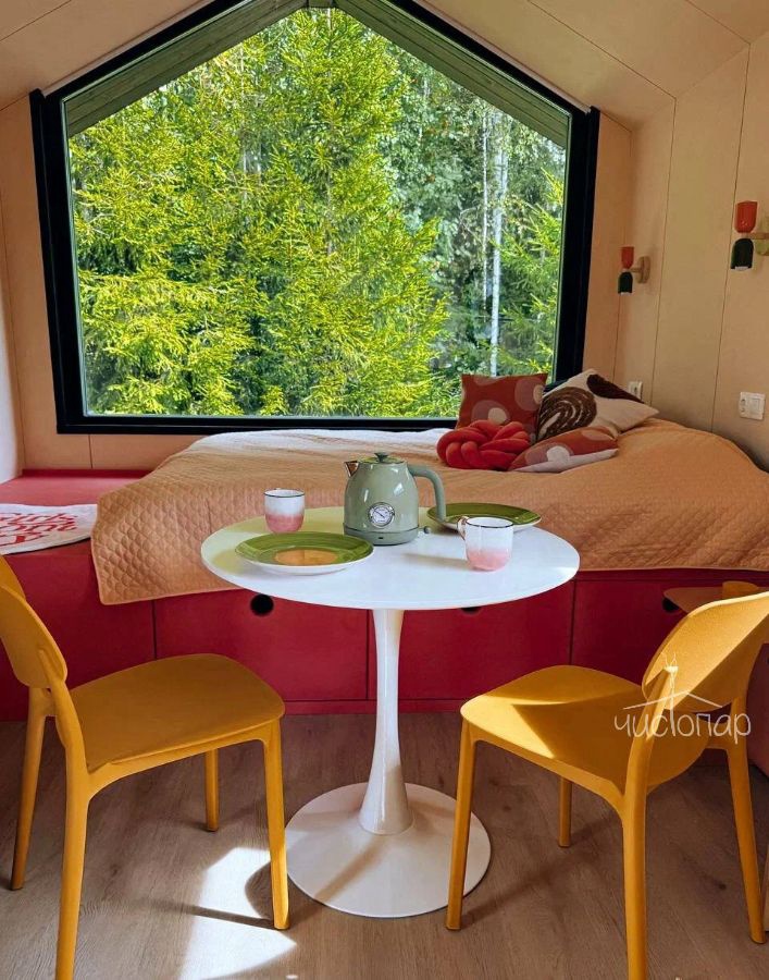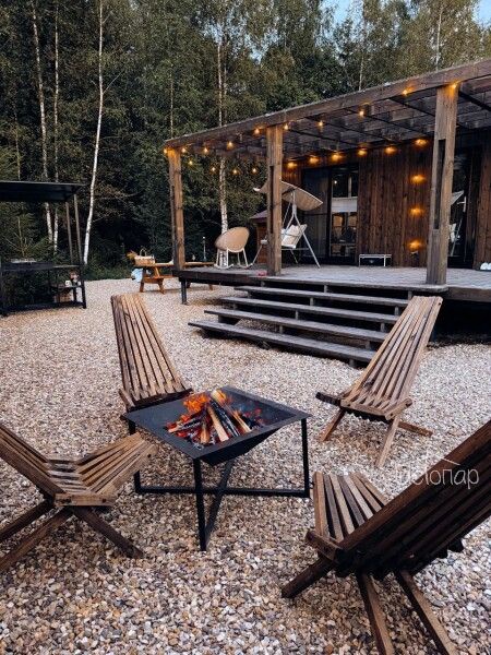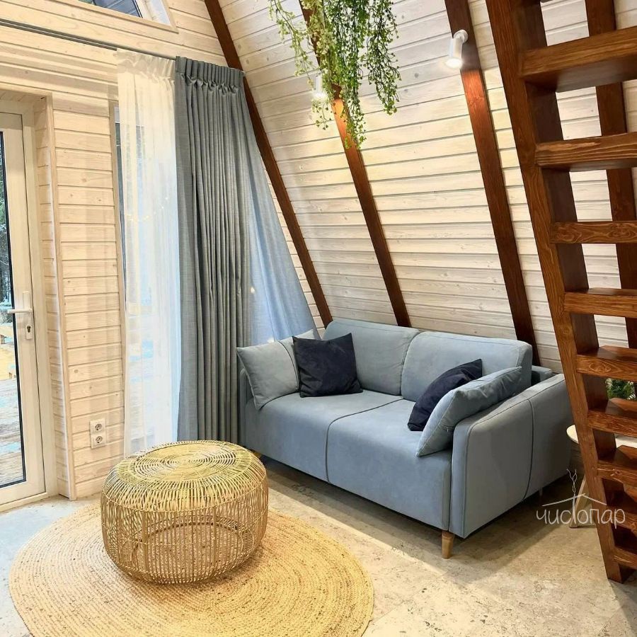 В треугольных домиках с горячими купелями или банным чаном, расположенных на территории, можно насладиться тишиной и спокойствием в окружении соснового и березового леса. Внутри А-фреймов уютно, красиво, есть все необходимое для комфортного проживания.