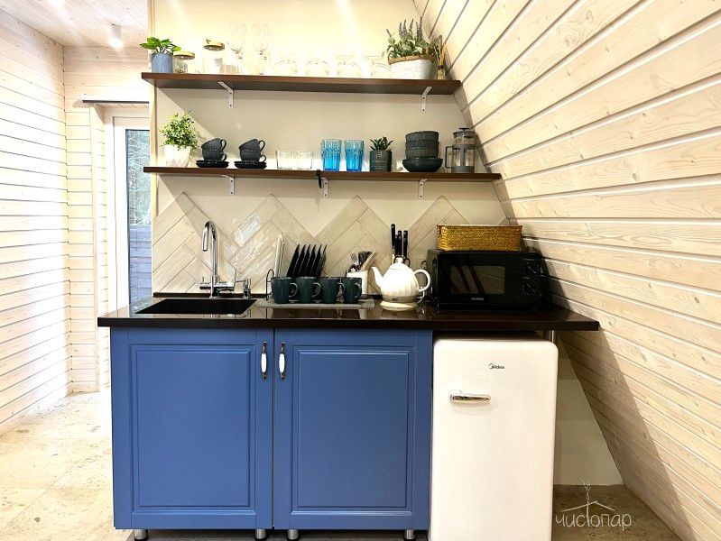 • Кухня оснащена индукционной плитой, холодильником, микроволновой печью, кофемолкой, туркой и необходимой посудой,