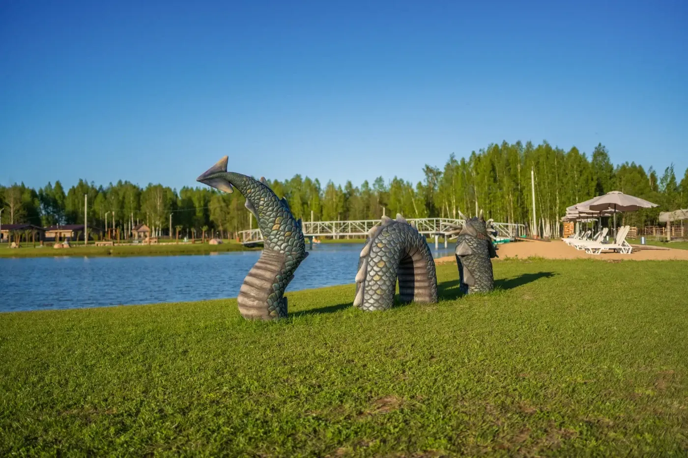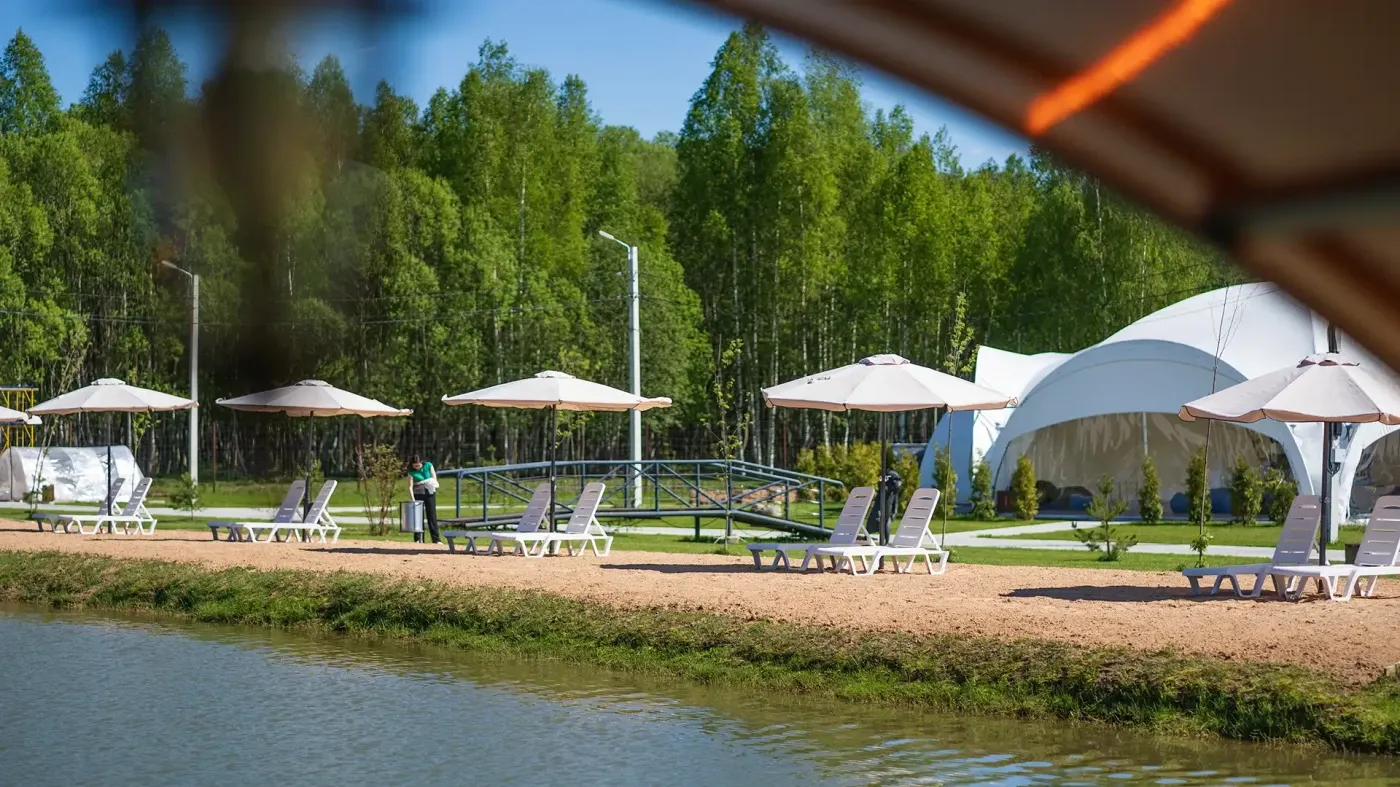 • пляж с лежаками и зонтиками на озере