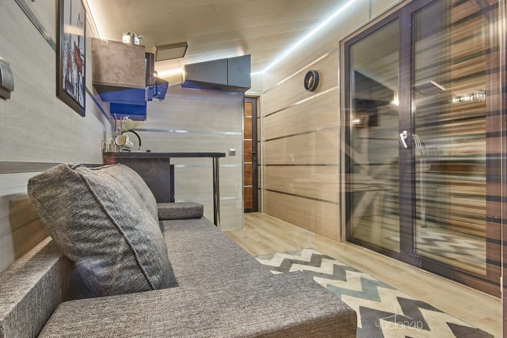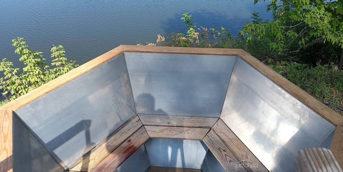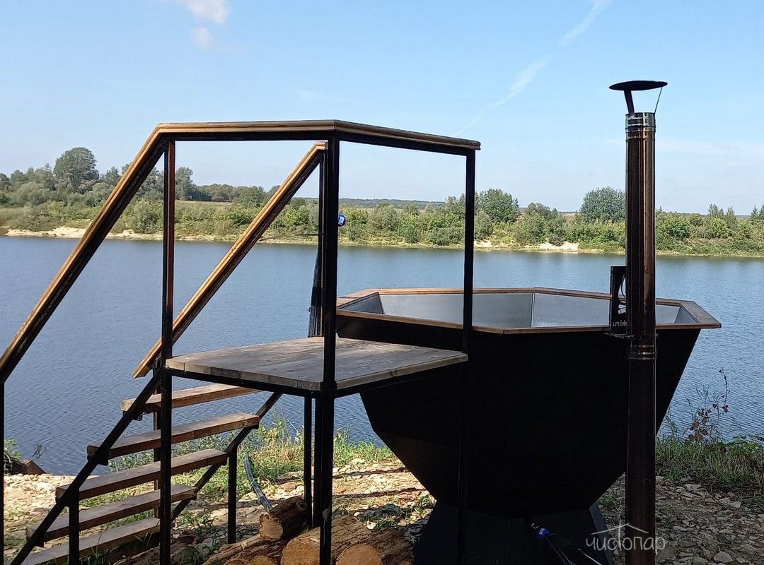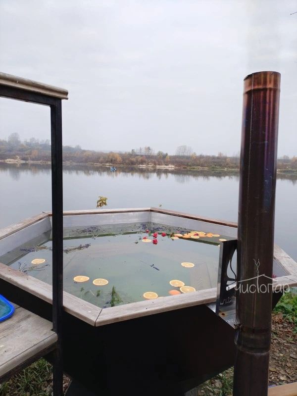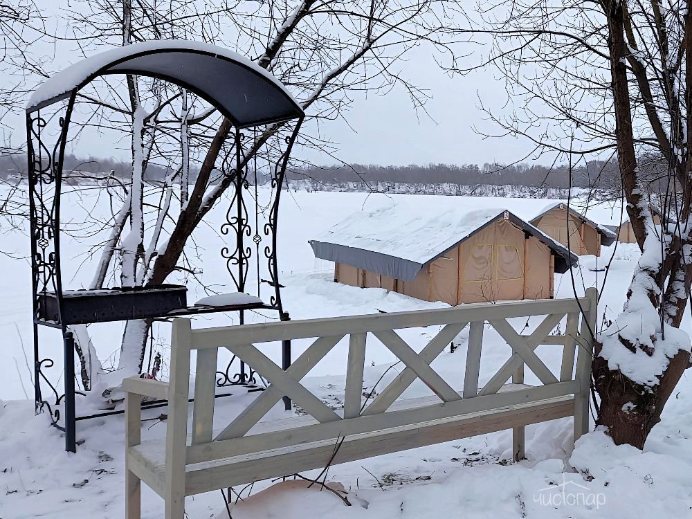 На берегу глэмпинга имеется русская баня, которая построена в симбиозе современного стиля "барнхаус" и классического осинового сруба из бревен большущего диаметра. Парилка с широкими осиновыми полками и легендарной чугунной печью «Ураган». Рядом с баней просторная беседка, банный чан. Панорамный вид на реку Оку. В зимнее время, для особых любителей устраивается настоящая прорубь, а в остальное время можно просто искупаться в реке, до неё всего 10 метров.