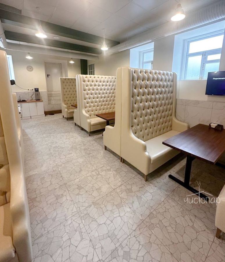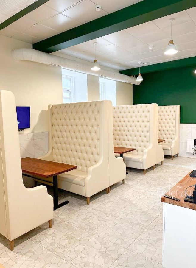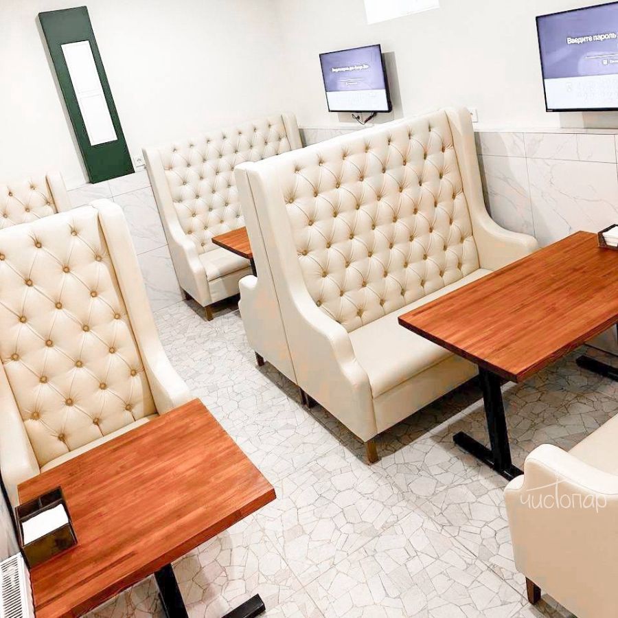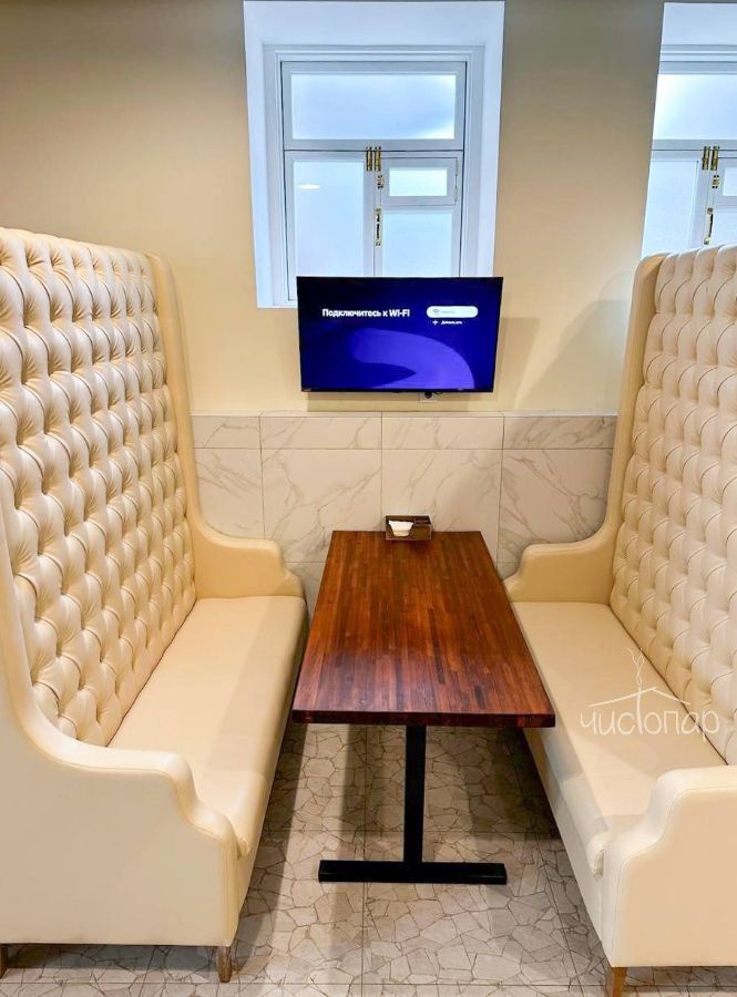 Для уютного отдыха в предбанном зале установлены мягкие и удобные диваны с высокими спинками, позволяющими создать эффект индивидуальной кабинки на 6 человек. В каждой кабинке есть удобный стол и телевизор.