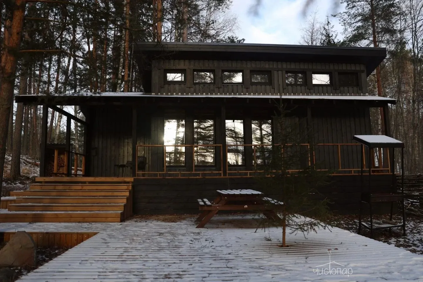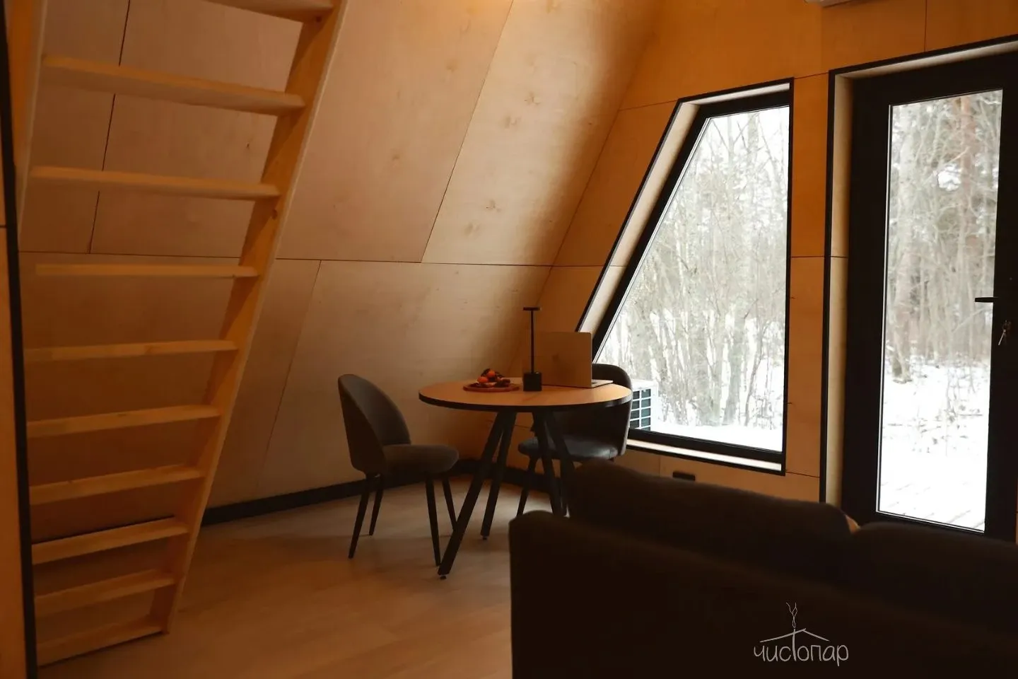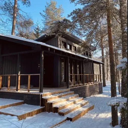 Дровяная баня-шале на скале с панорамной гостиной.
