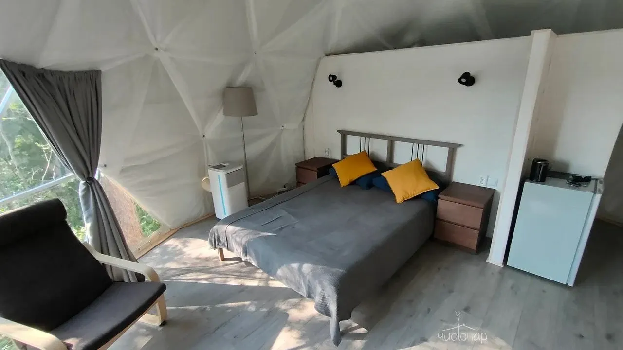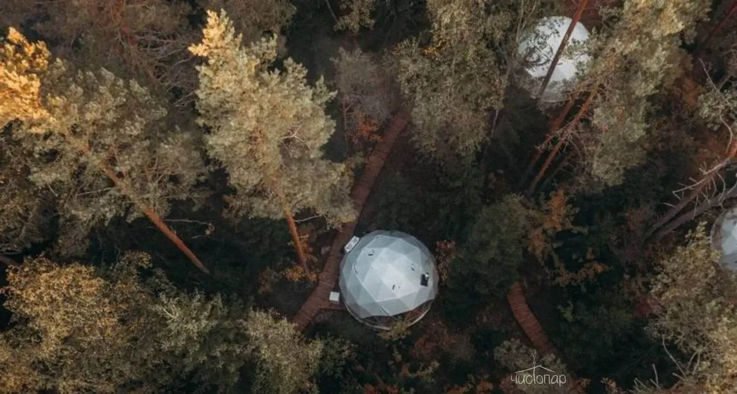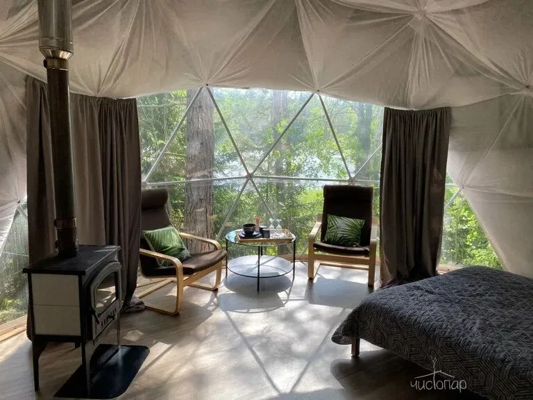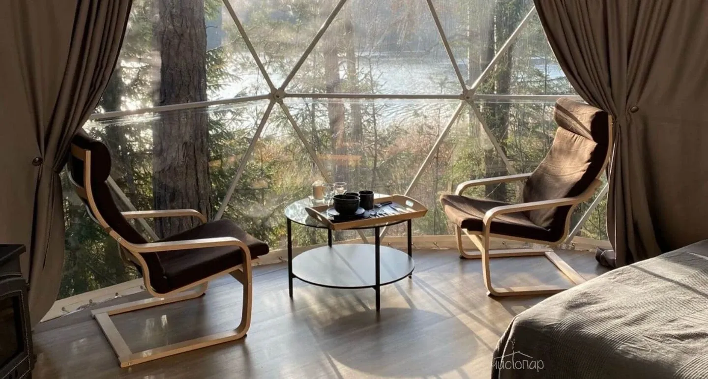 Утепленные сферы с видом на лес или озеро оснащены: печью-камином, теплыми полами, биотуалетом, холодильником, чайником, посудой и приборами.