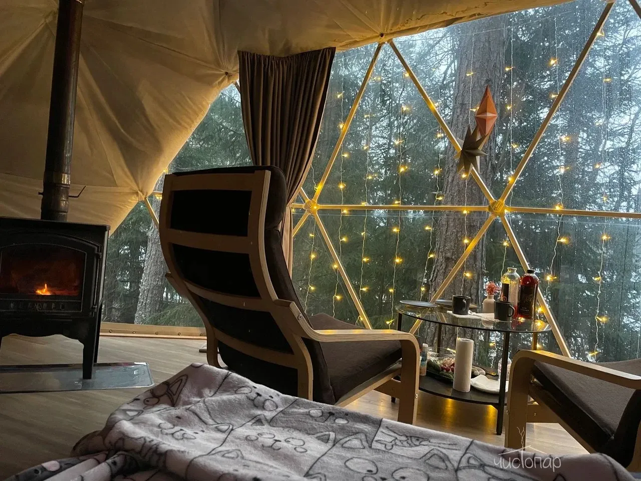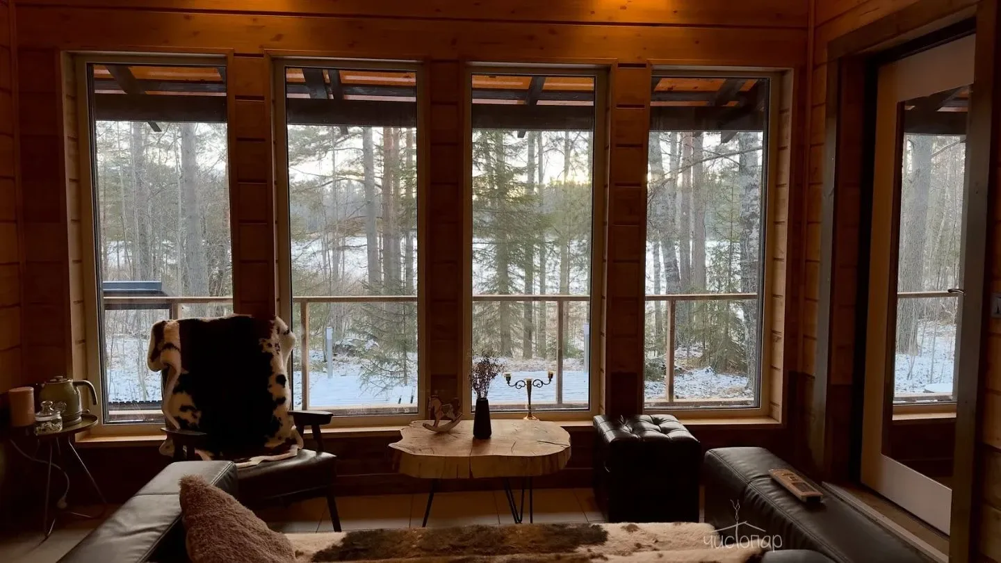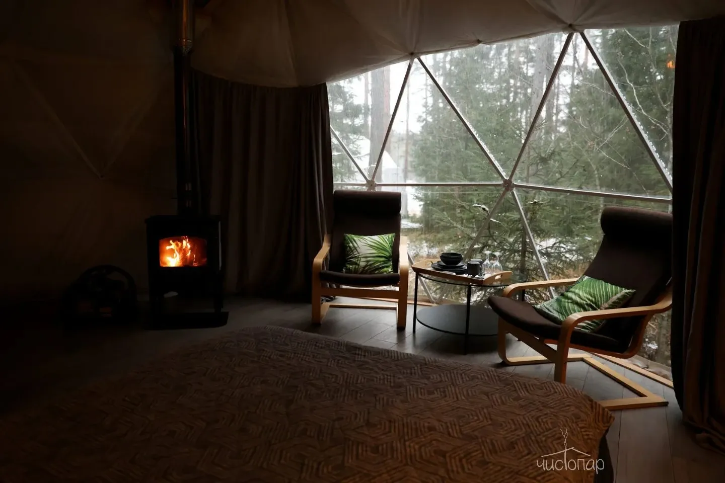 Утепленные сферы с видом на лес или озеро оснащены: печью-камином, теплыми полами, биотуалетом, холодильником, чайником, посудой и приборами.