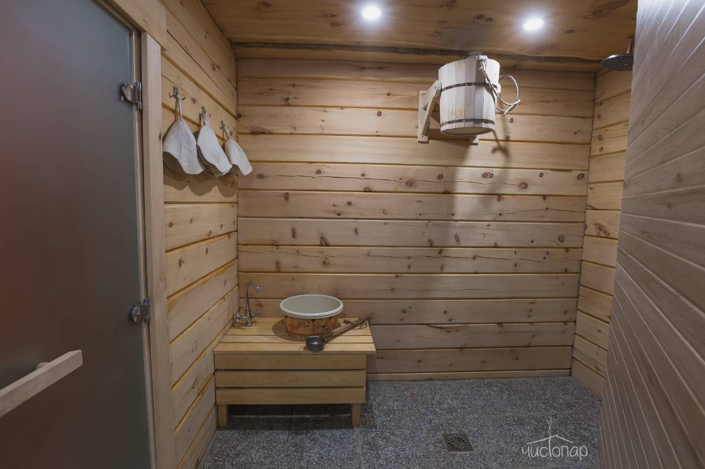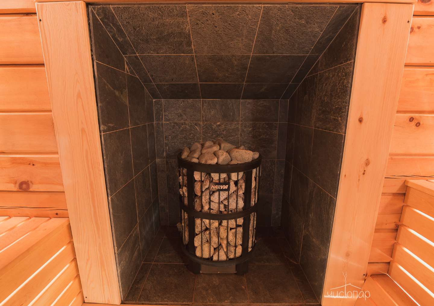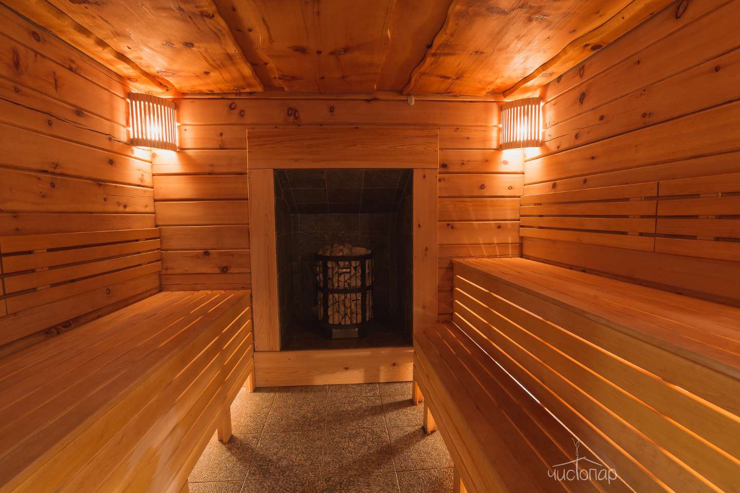 В парной вместительные полки для большой компании и безопасное расположение печки! Что очень важно нашим маленьким гостям.