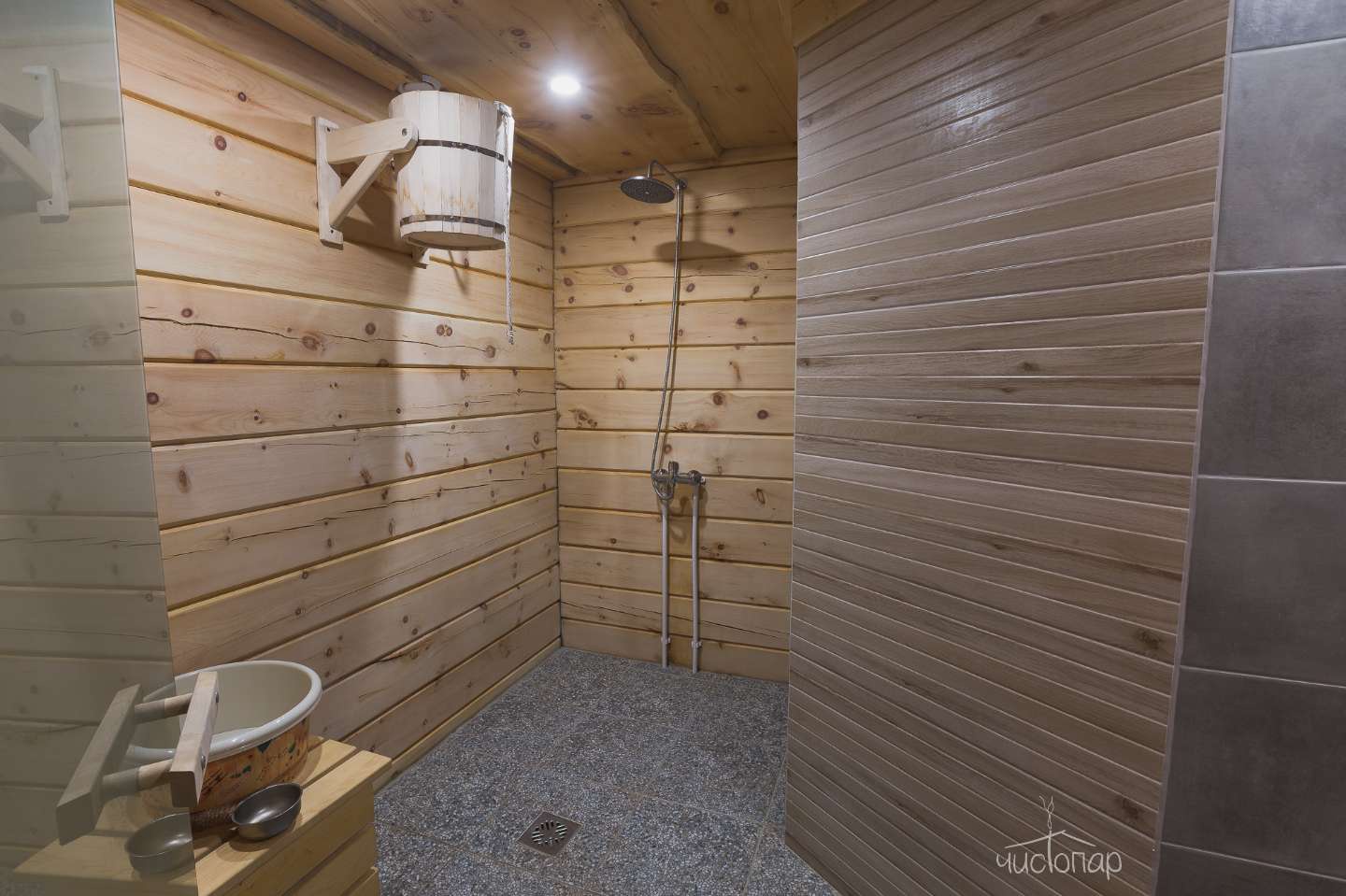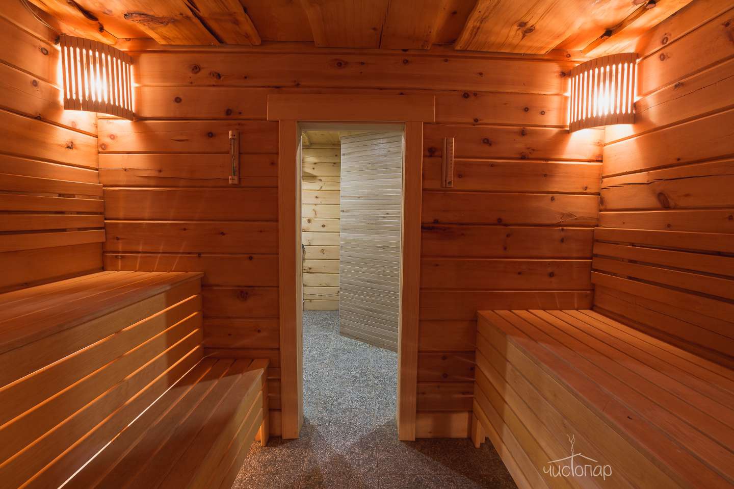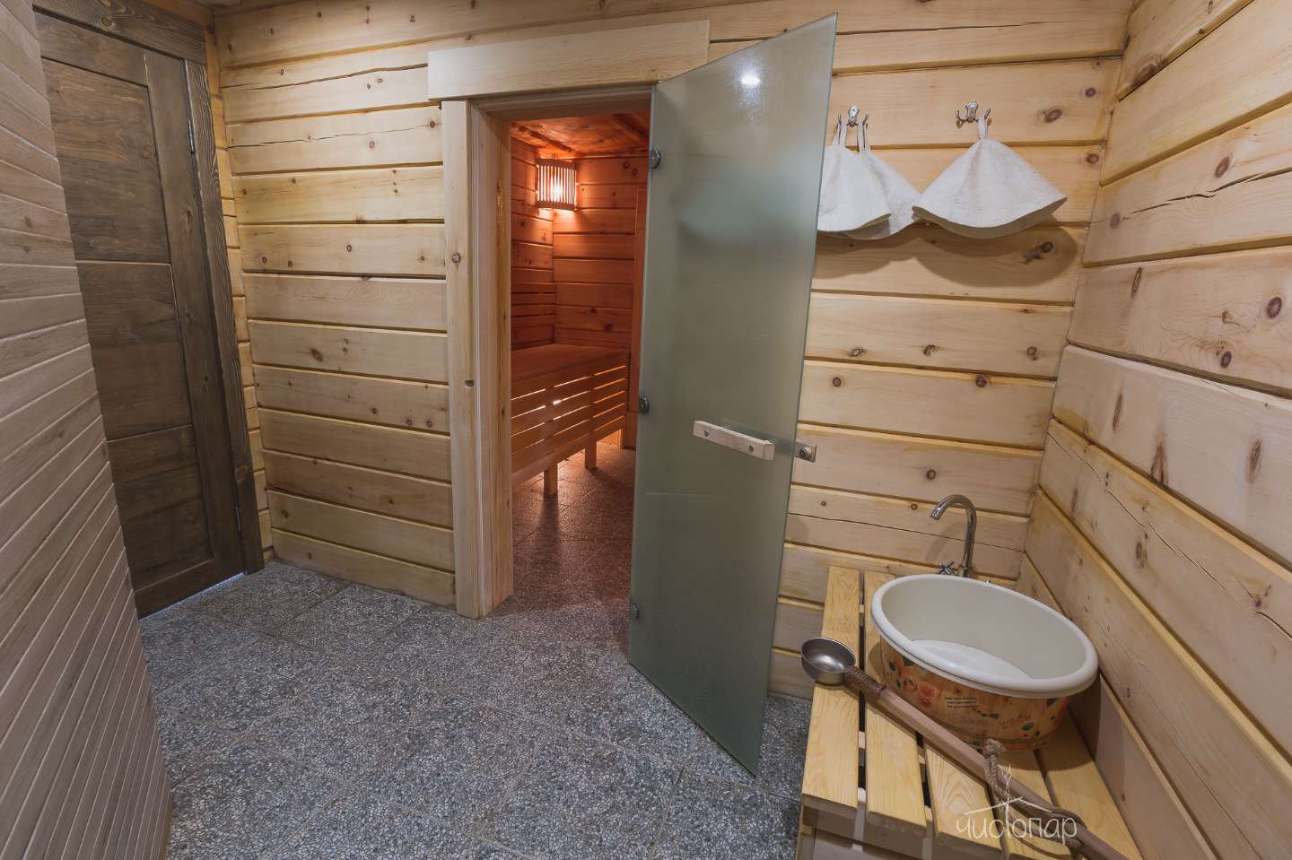 В парной вместительные полки для большой компании и безопасное расположение печки! Что очень важно нашим маленьким гостям.