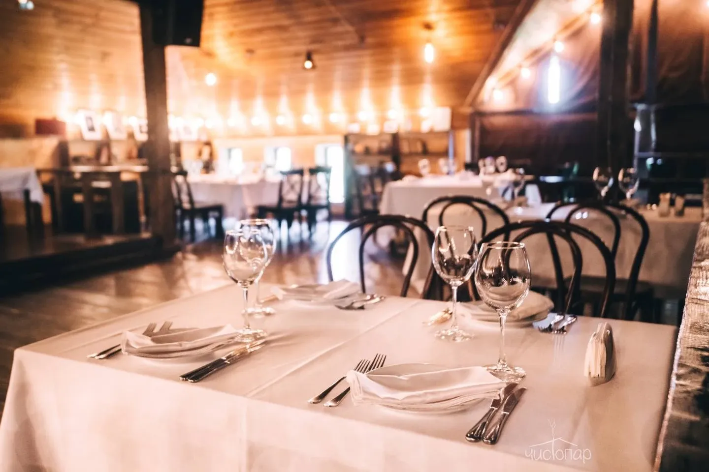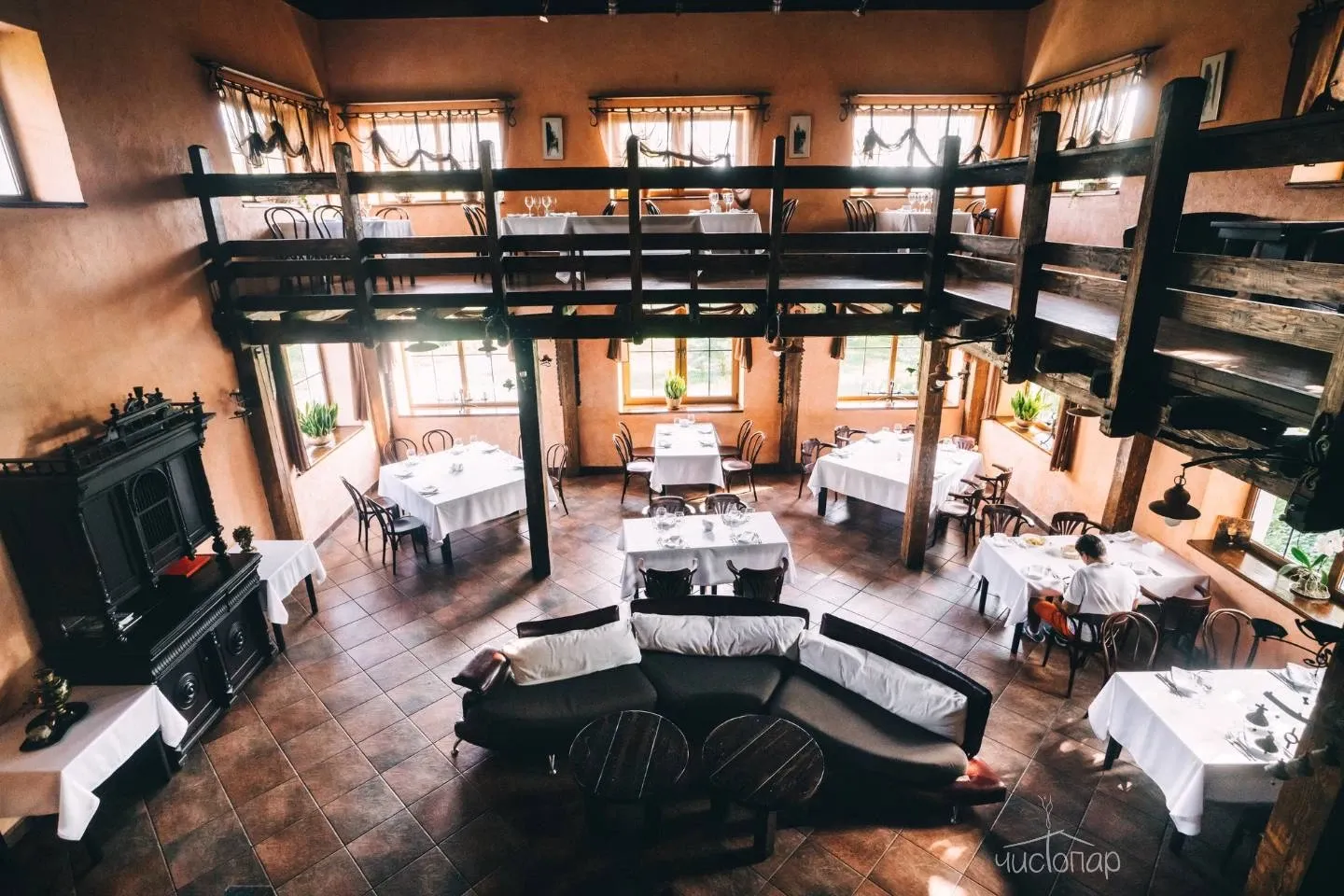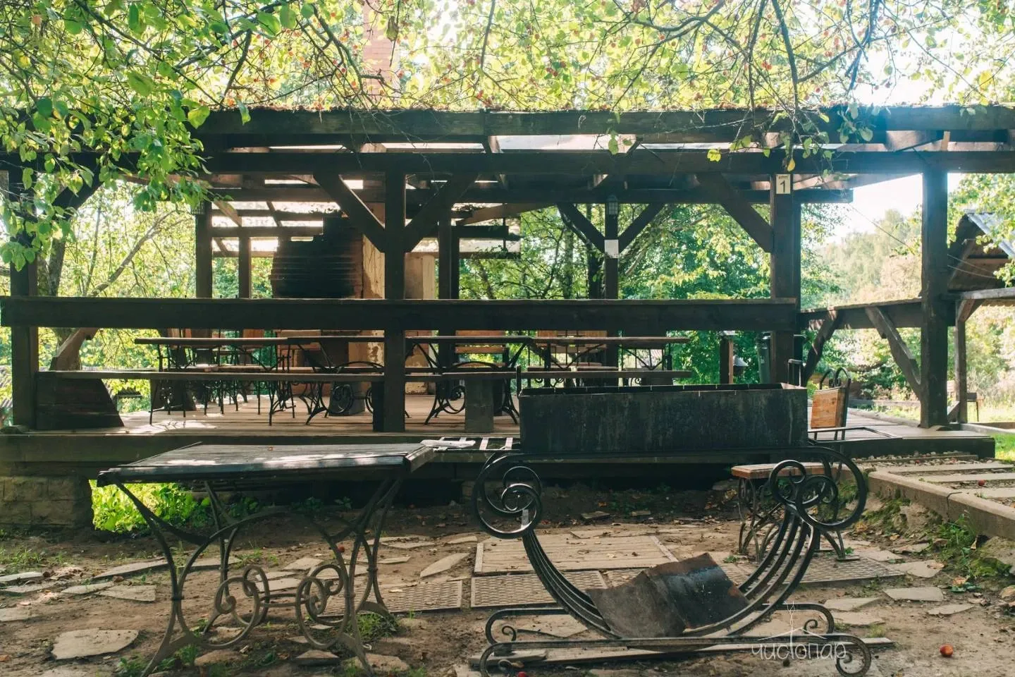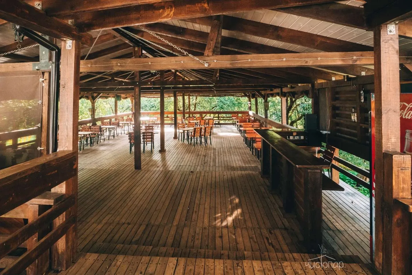На территории парк-отеля действует ресторан, который включает в себя три зоны: зал с камином, бар и летнюю террасу. Здесь можно организовать банкеты и праздники. Рядом с домиками оборудованы площадки для барбекю.