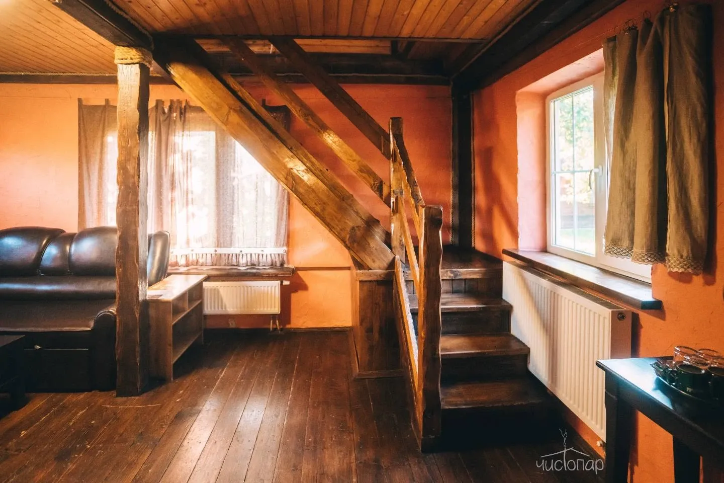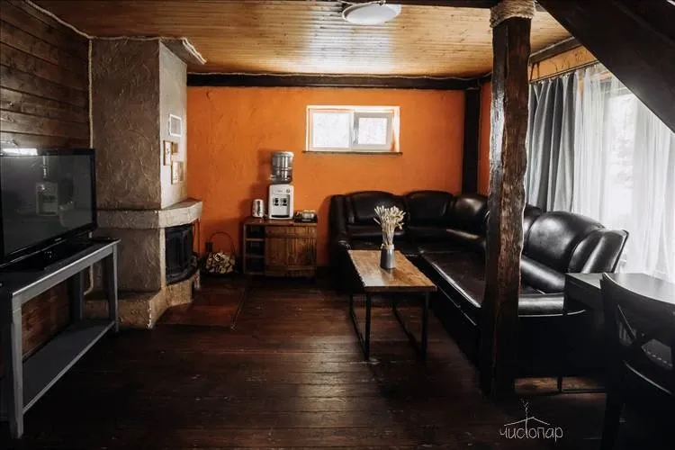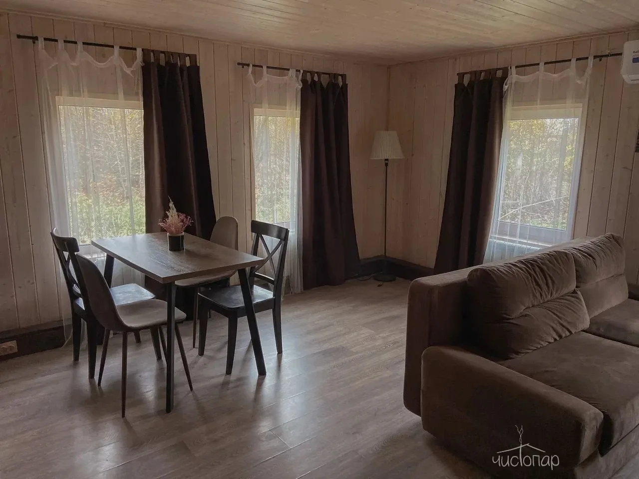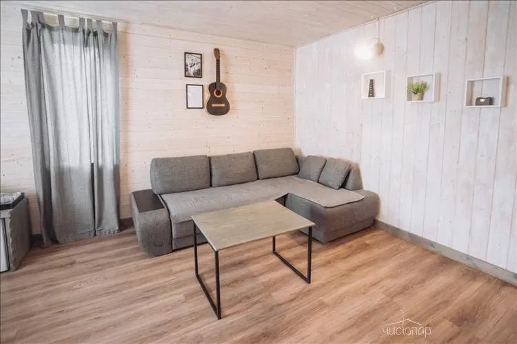 Двухэтажный дом с большой комнатой с кухонной зоной на первом этаже: диван (раскладывается, при необходимости, двуспальный), дополнительный диван, ТВ. Душевая комната на первом этаже, фен.