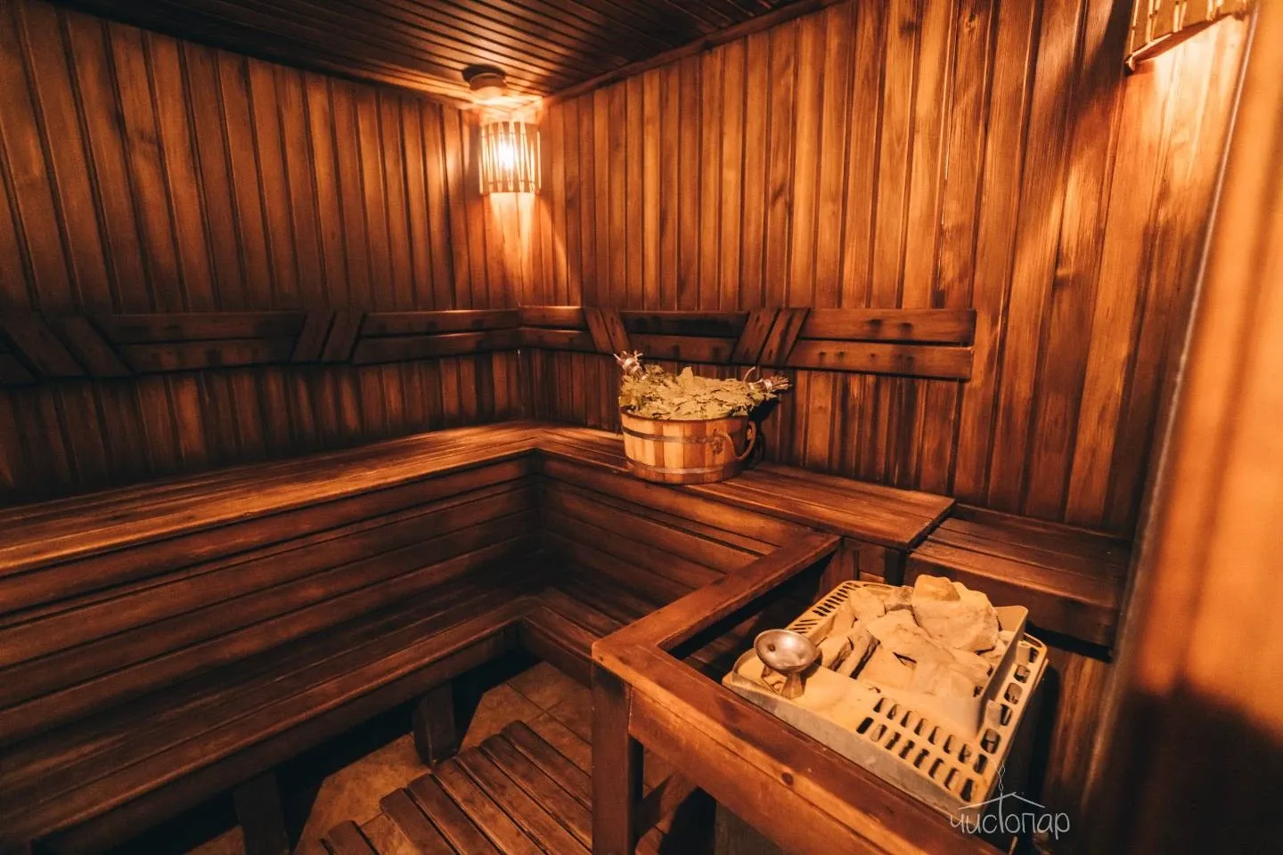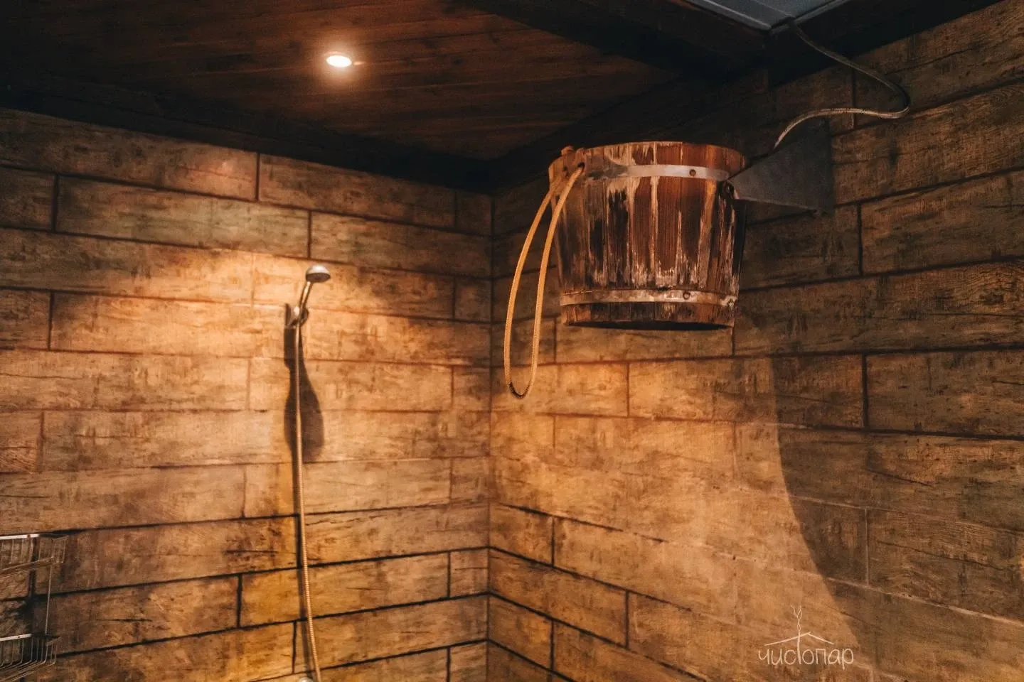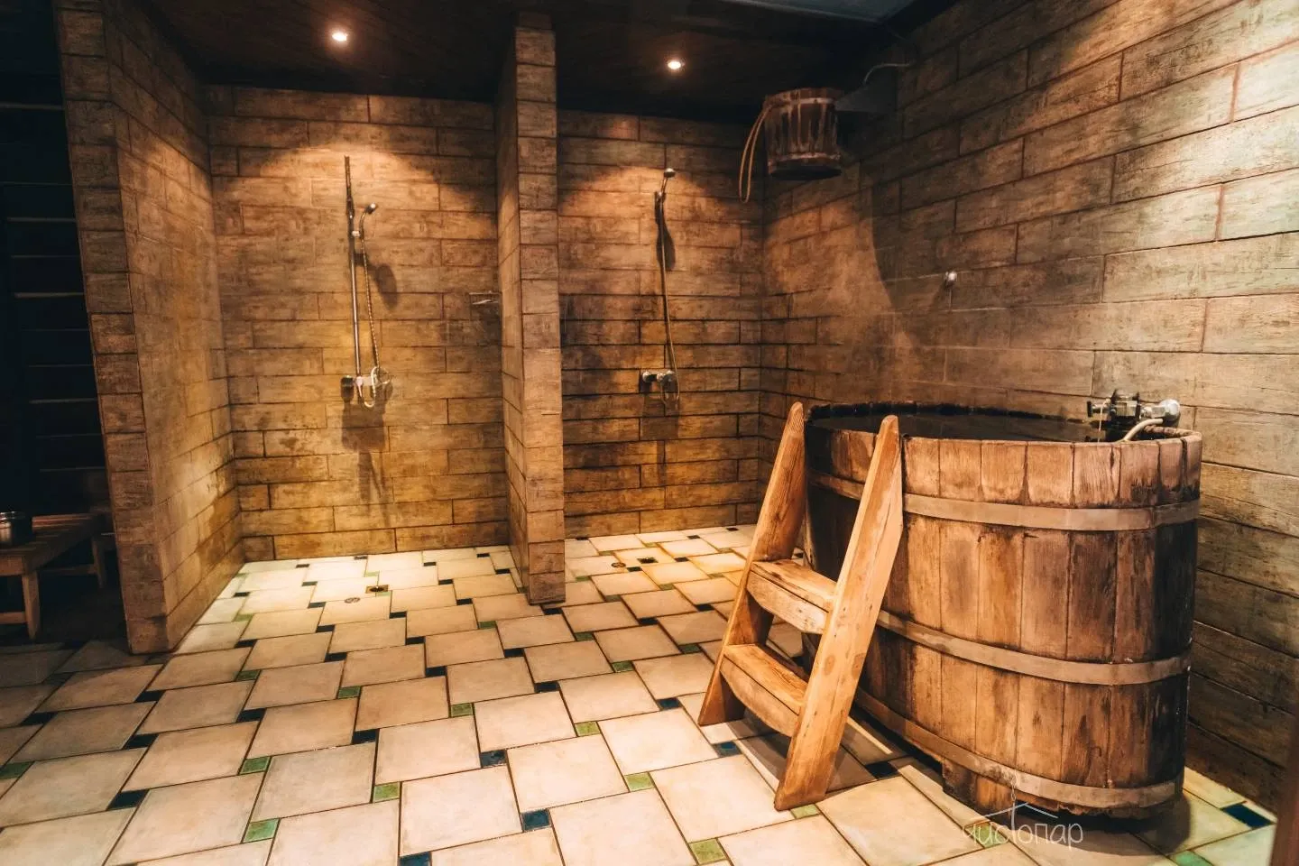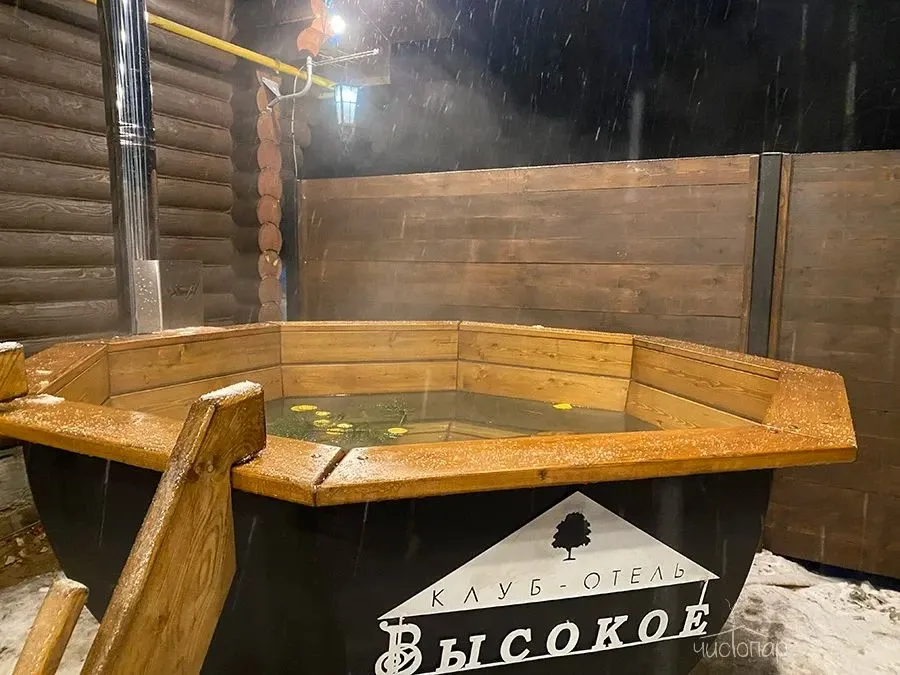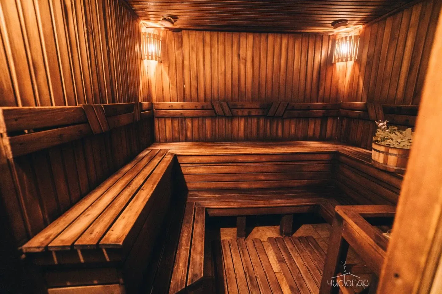 На территории отеля имеются две отдельные сауны под одной крышей: сауна с бассейном сухого типа и баня влажная с купелью и шок-ведром. Банный чан находится на огороженной площадке для отдыха с выходом из бани.