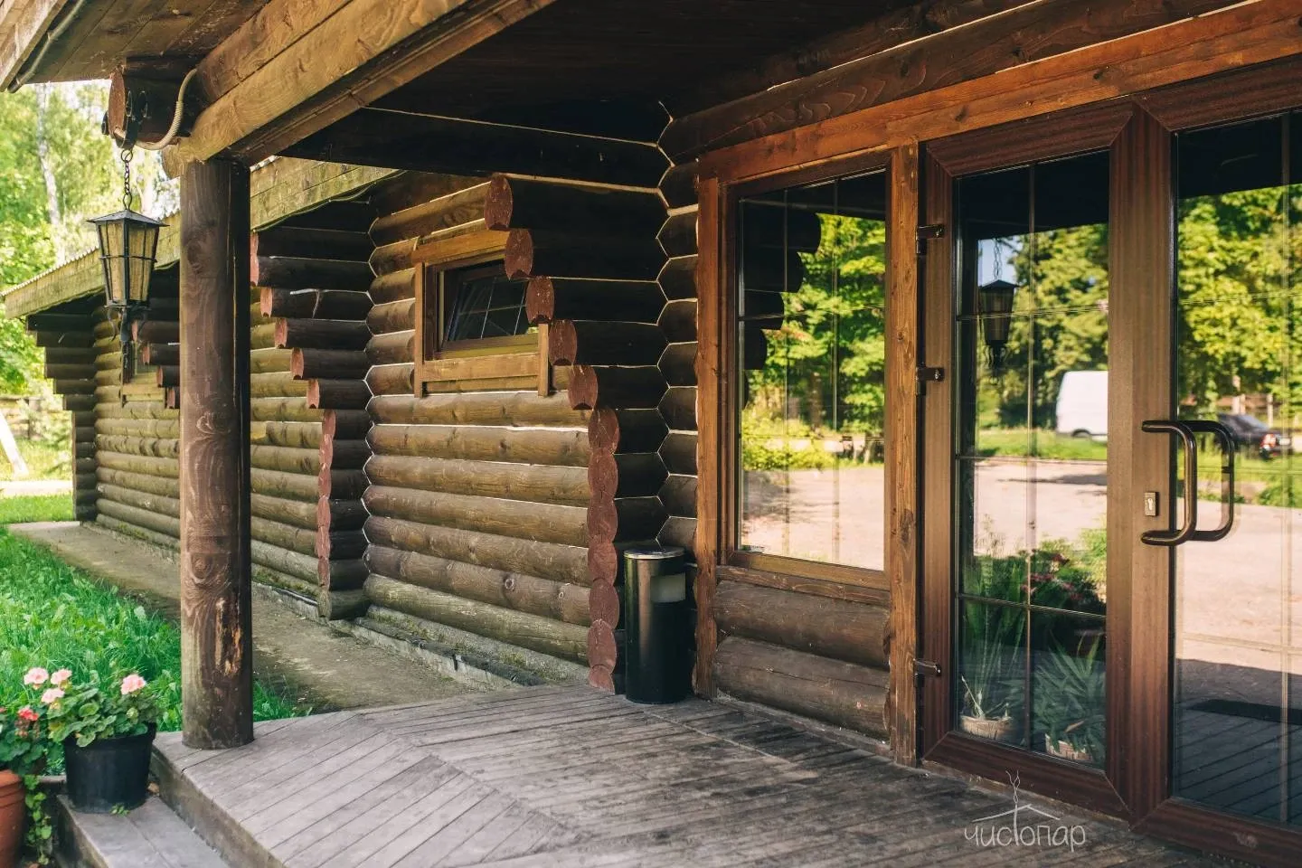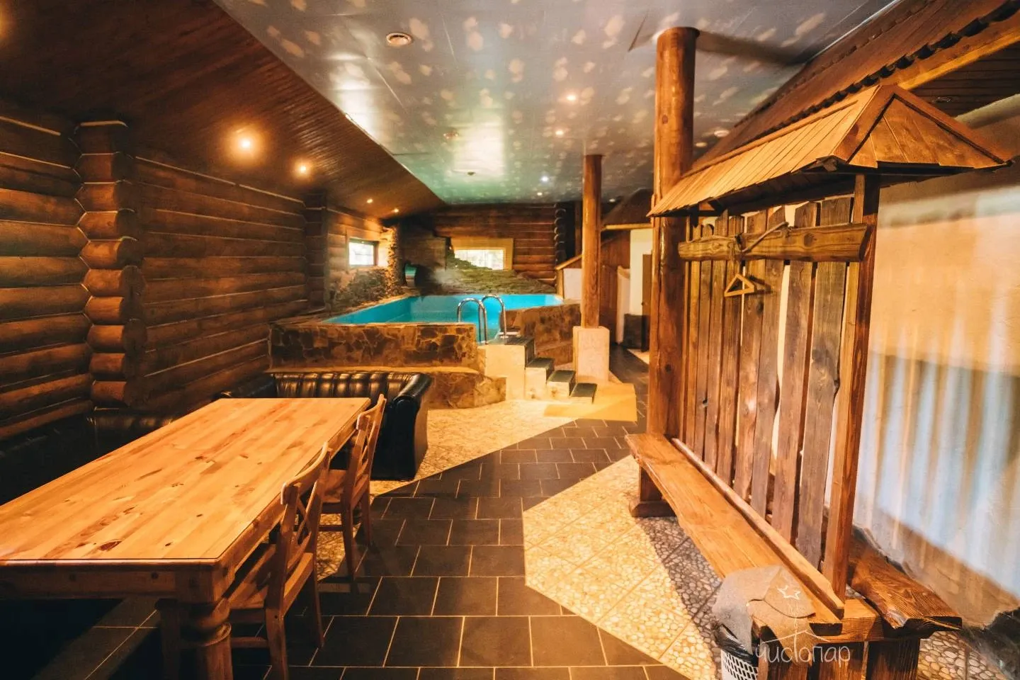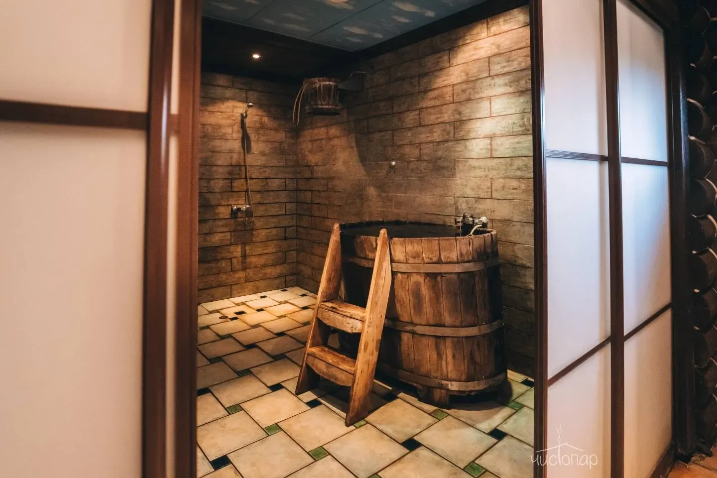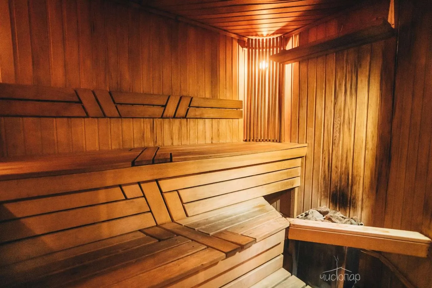 На территории отеля имеются две отдельные сауны под одной крышей: сауна с бассейном сухого типа и баня влажная с купелью и шок-ведром. Банный чан находится на огороженной площадке для отдыха с выходом из бани.