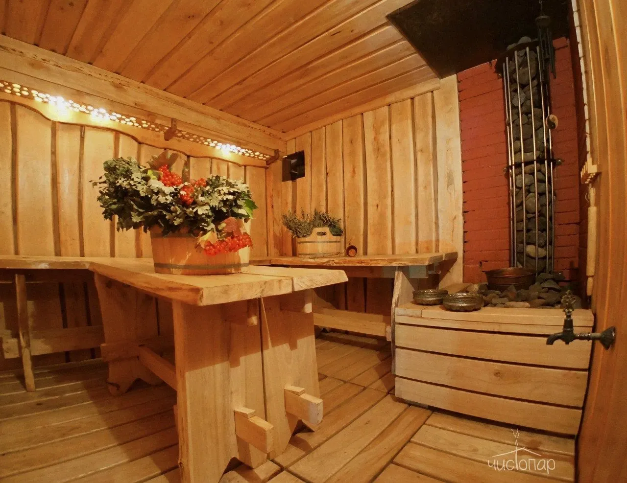 В стоимость аренды входит: жаркая русская парная на дровах, эвкалиптовый отвар для подачи, холодная купель, Чан на открытом огне, релаксационные качели, тапочки, полотенца, простыни, шапочки, целый термос травяного чая и Аромапарение.Читать далее