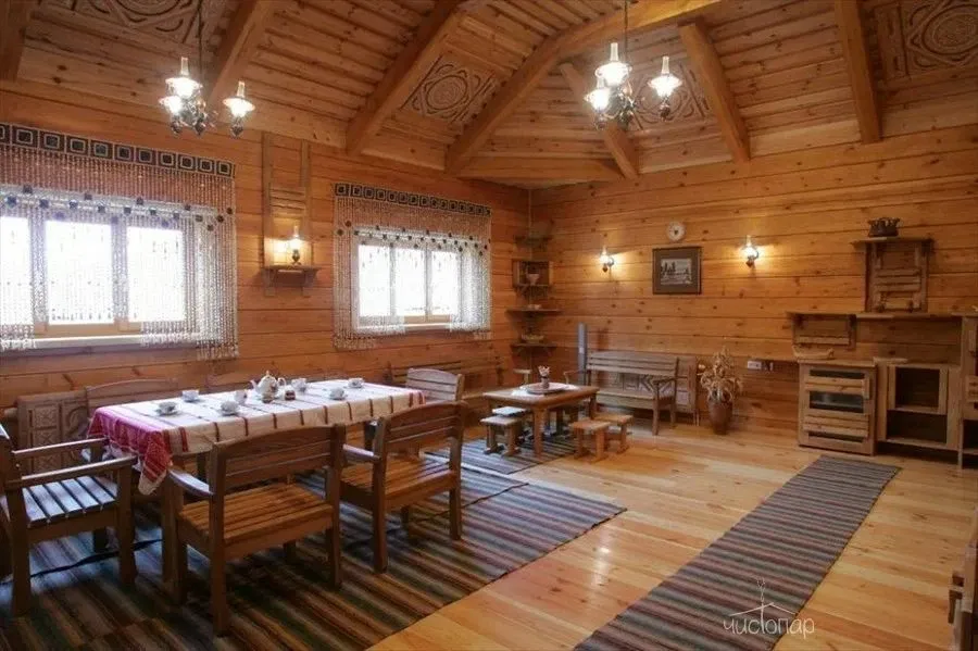 Русская баня выполнена из карельской лиственницы, гостям предлагается мягкое парение, кедровая бочка, комната отдыха.