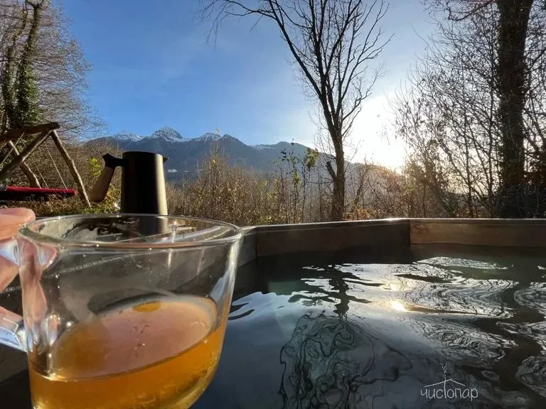 Банный комплекс расположен в прекрасном уединенном месте на горе среди леса. Природная красота вокруг восхитительна. Ледяная купель, наполненная прозрачной горной водой, предлагает потрясающий вид, которым можно наслаждаться во время освежающего погружения. Это было поистине уникальное и восхитительное ощущение.