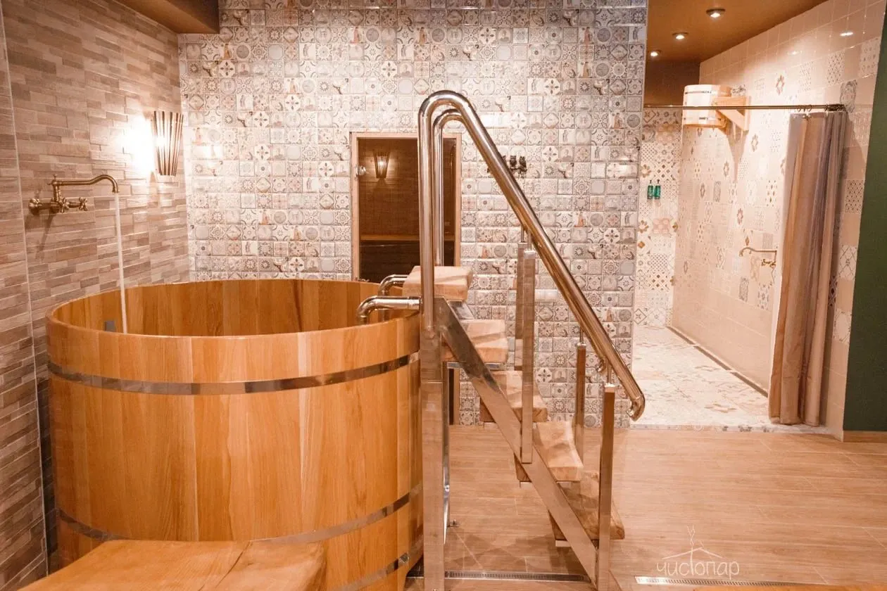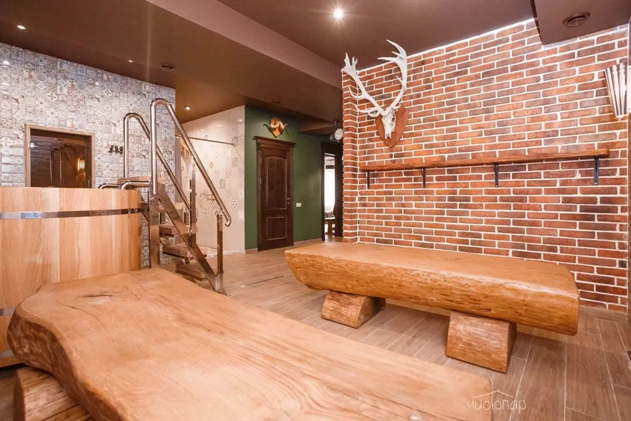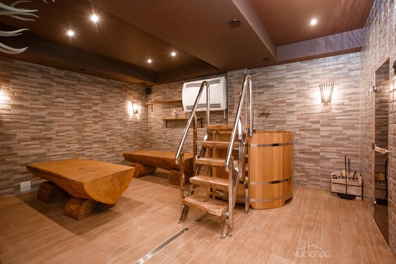Баня «Жар-птица» покорит своих гостей мебелью ручной работы из массива дуба, которая, в сочетании с современными решениями, создает уникальный интерьер. Обстановка бани полностью основана на использовании исключительно натуральных материалов: дерева и керамики. В отделке парной использовались разные породы липы, славящиеся своими полезными свойствами и благоприятным воздействием на организм человека.