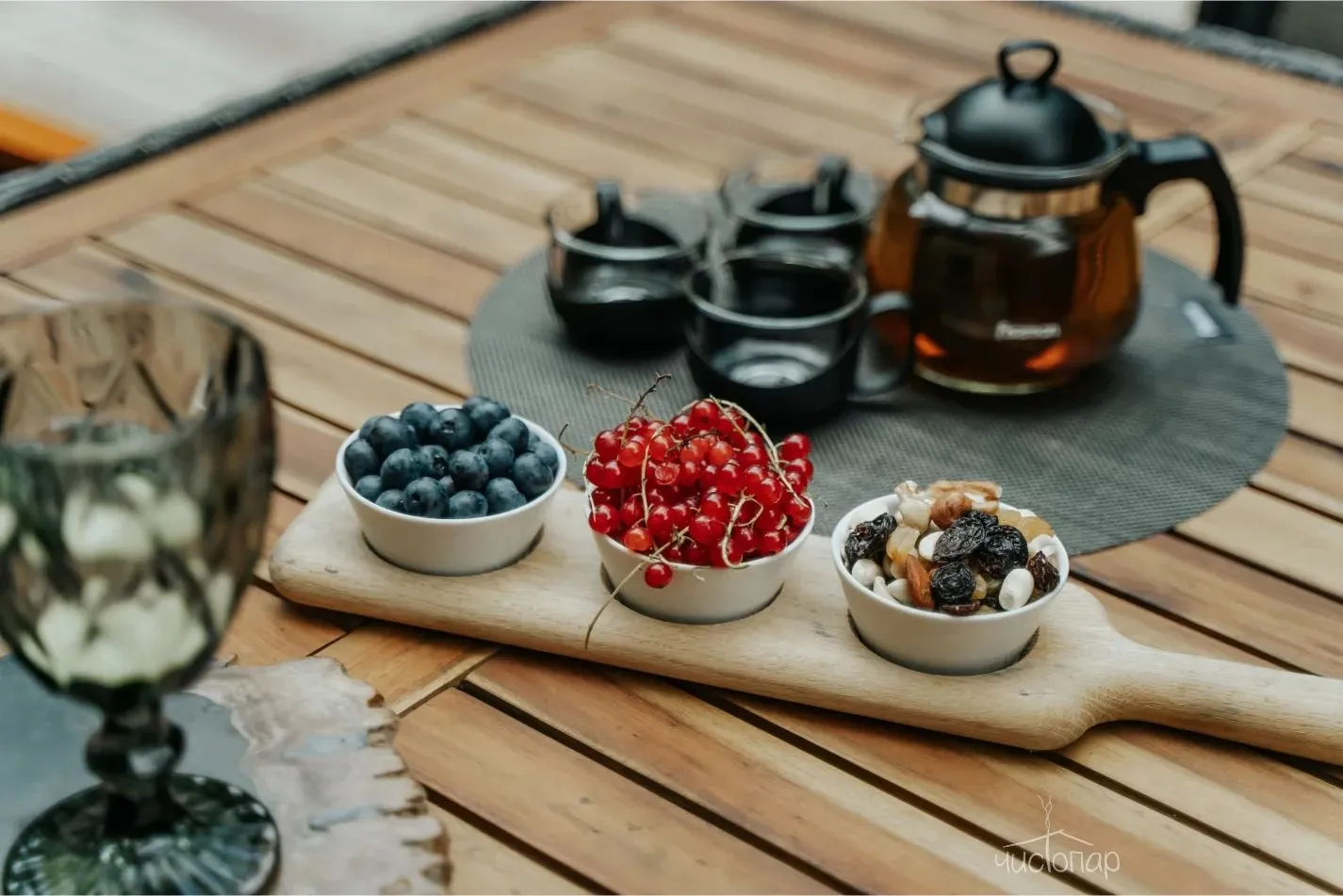 - горный чай ручного сбора, морс, квас, минеральная вода, орехи, сухофрукты, варенье, мёд.