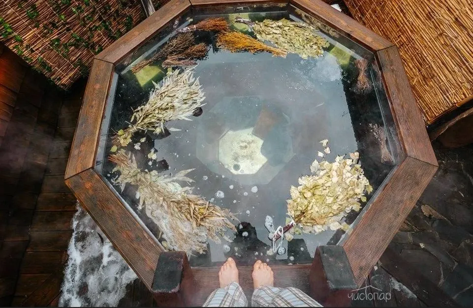 Банная программа для тех, кто предпочитает не торопиться. Можно погреться в парной, расслабиться в чане с тёплой водой на свежем воздухе.