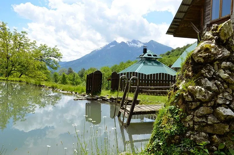 Русская баня на дровах с выходом в горное озеро и подогреваемой фито-купелью