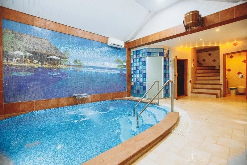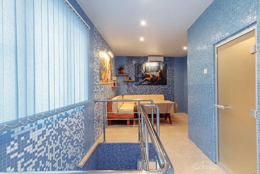 Услуги: открытый бассейн с джакузи и подогревом, зона отдыха, обливное ведро, во дворе есть мангал, место для пикника, лежаки, детский уголок, ТВ, караоке, настольные игры, банщик (по предварительной записи), веники: дуб, липа, береза, эвкалипт.