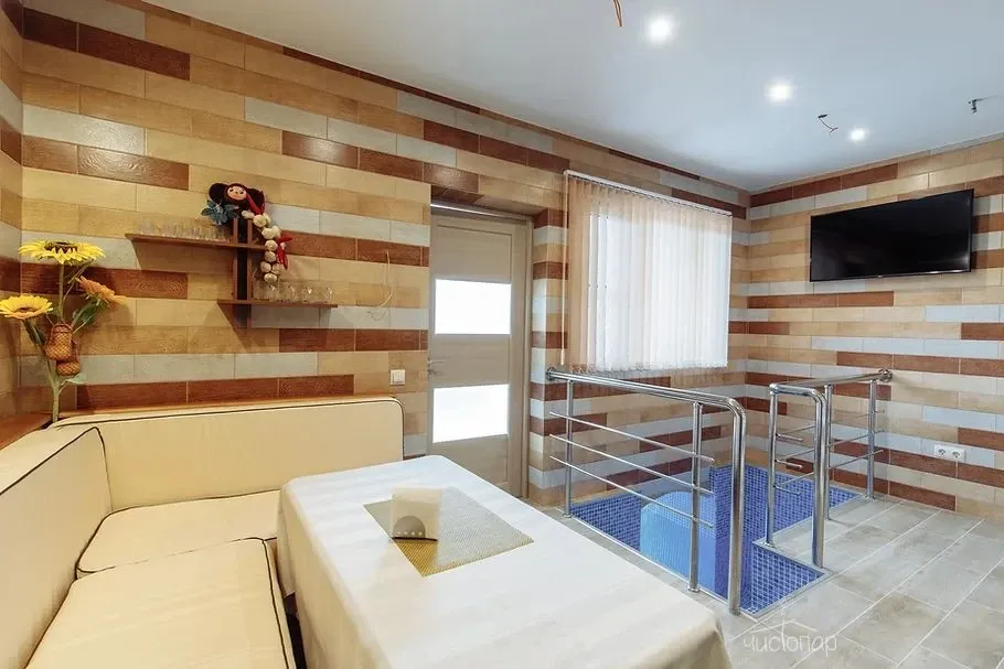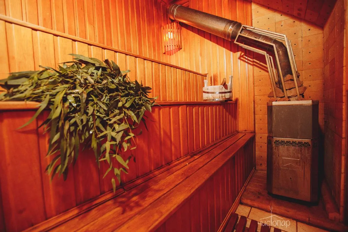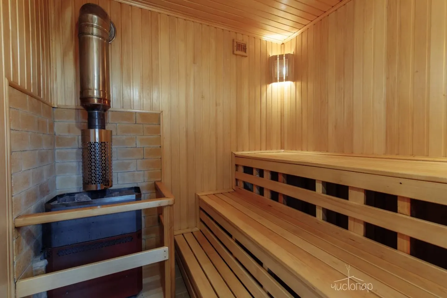 На первом этаже располагается русская парилка на дровах, посещение которой очень полезно для здоровья, помогает снять напряжение и избавиться от недомоганий. Любителям попариться предоставляются веники. По желанию, можно пригласить профессионального банщика, который сделает ваш отдых ещё приятнее. Обливание из ведра холодной водой вернет бодрость духа, а для тех, кто не готов к столь резкой смене температур есть бассейн с подогревом. В гостиной с удобным диваном во время застолья можно блеснуть перед друзьями вокальными данными, воспользовавшись установкой караоке с впечатляющим выбором песен. На втором этаже есть комната отдыха, оборудованная кондиционером с двуспальной кроватью и очень удобным мягким креслом. Гостям предлагается полезный и вкусный травяной чай с угощением и настольные игры. Чистые полотенца, простыни, шапочки и тапочки предоставляется гостям. К вашим услугам предлагается массажное кресло. Новинка: "Снежная комната" - помещение с настоящим сочинским снегом!