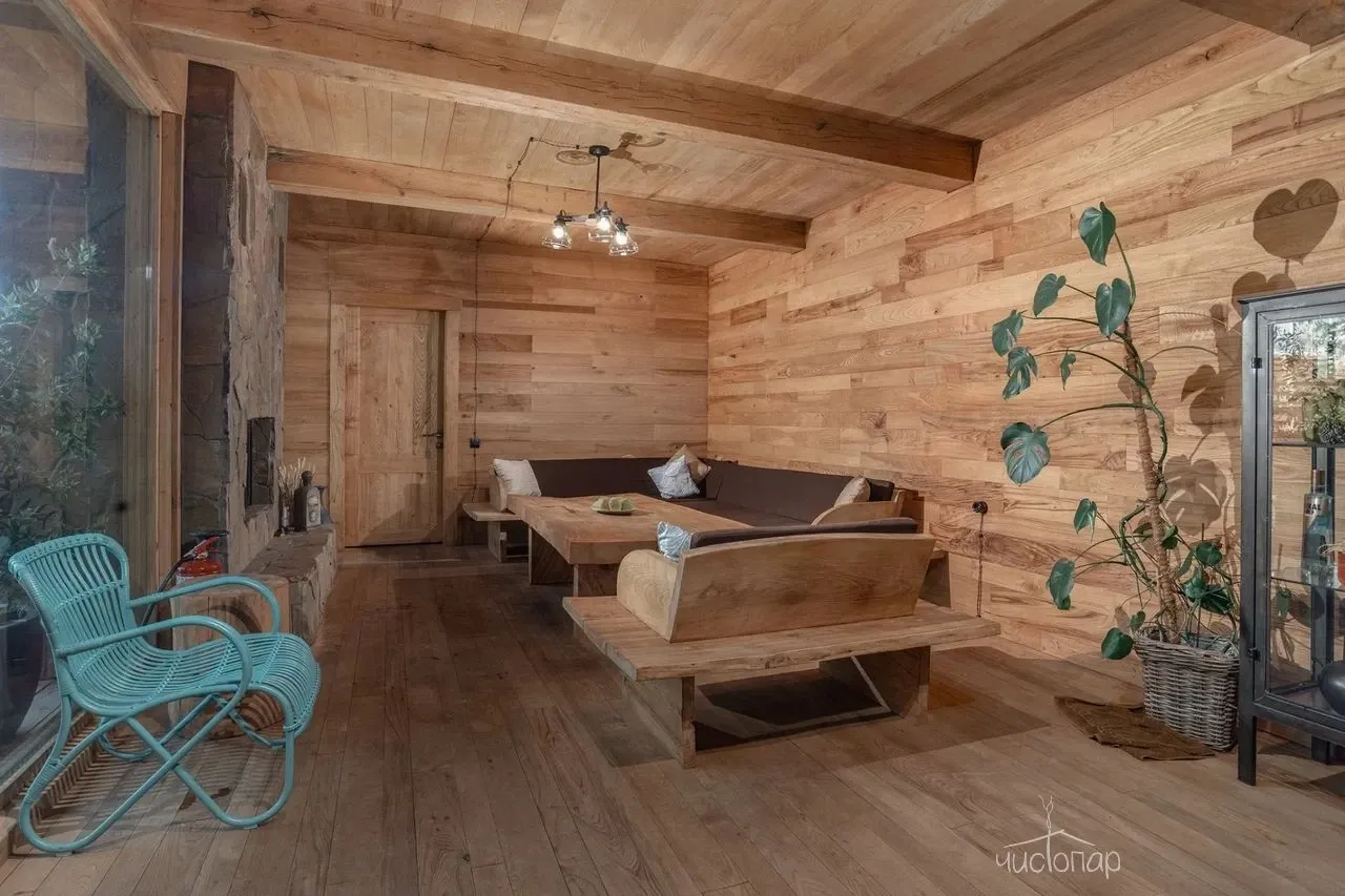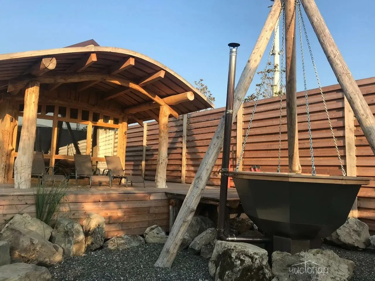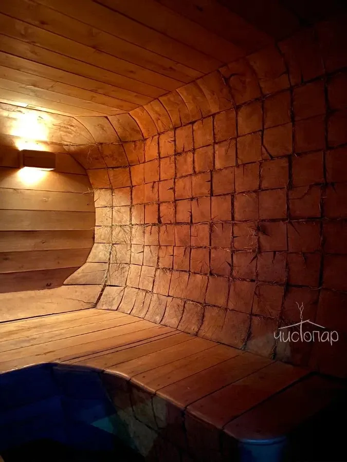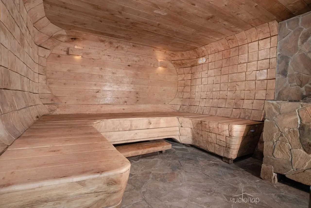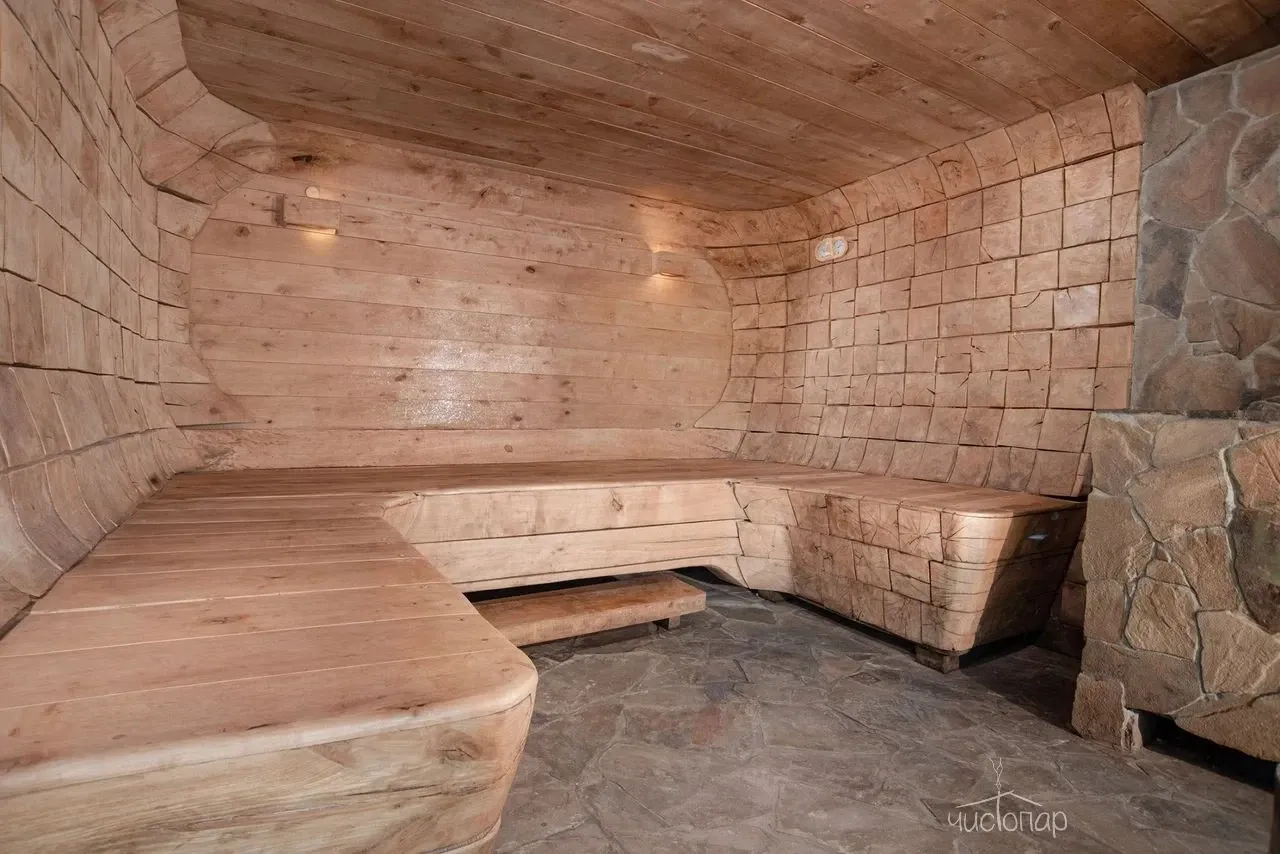 Большой банный комплекс рассчитан на комфортный отдых до 15 гостей. Выполнен в классическом стиле. На территории расположена большая деревянная купель с холодной водой и настоящий чан банника, который подогревается костром.