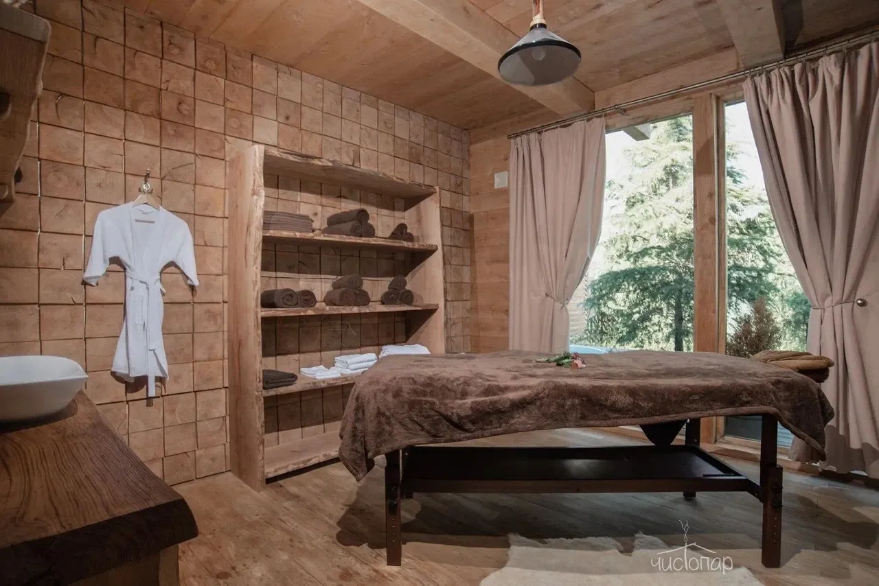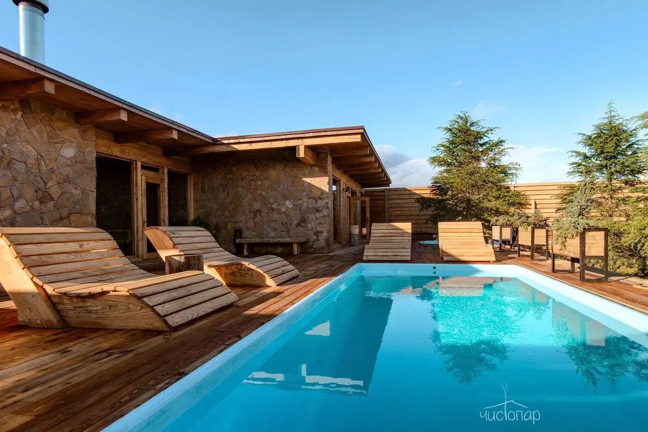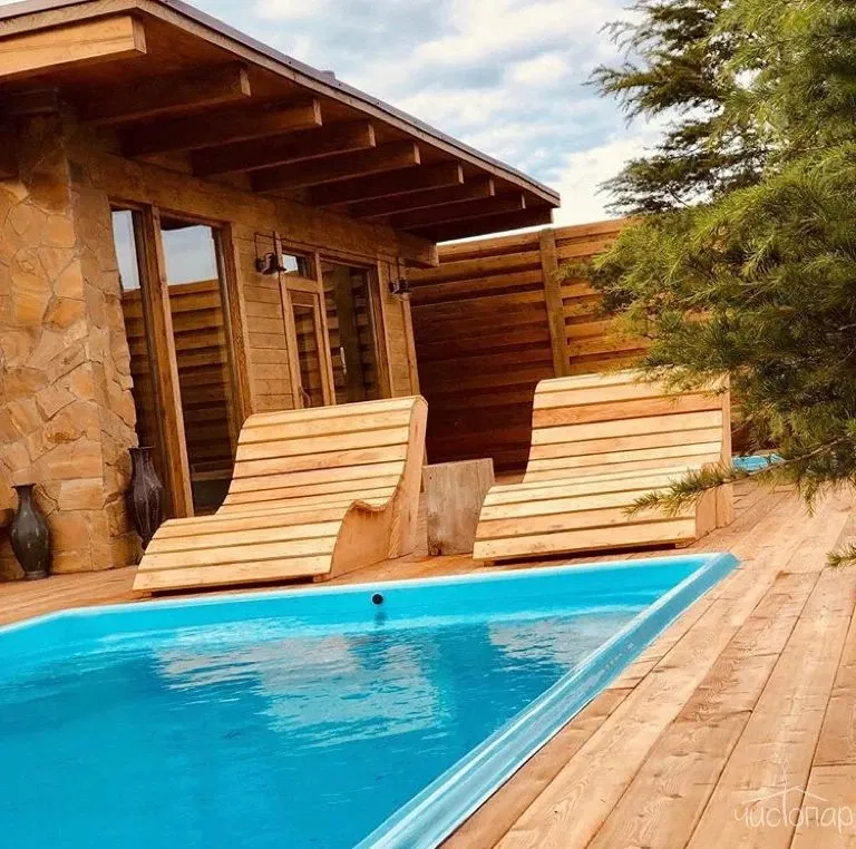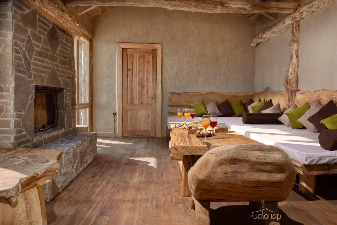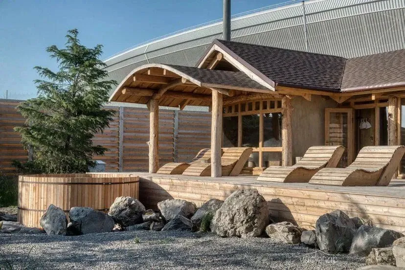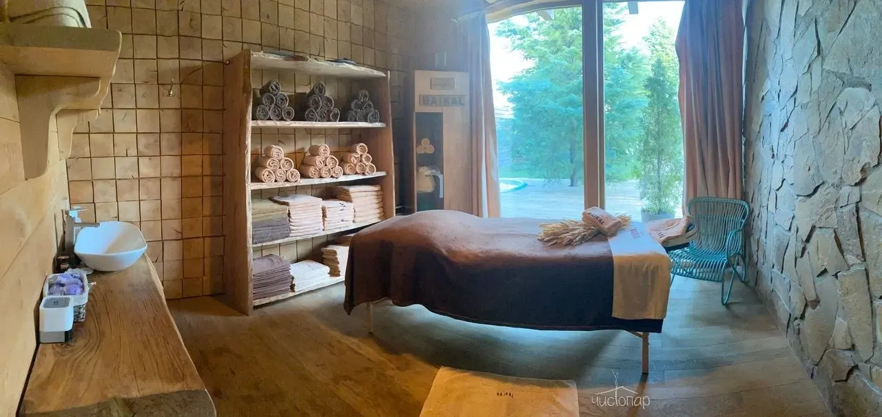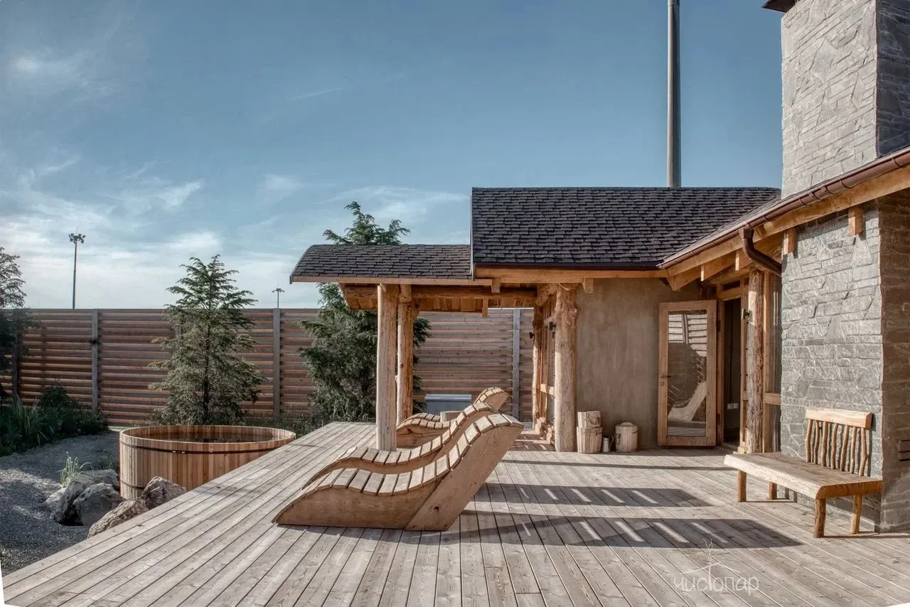 Малый банный комплекс рассчитан на комфортный отдых до 10 гостей. Выполнен в современном стиле из натуральных материалов: дерево и камень. На территории, под открытым небом, расположен бассейн и гидромассажный бассейн с подогревом.