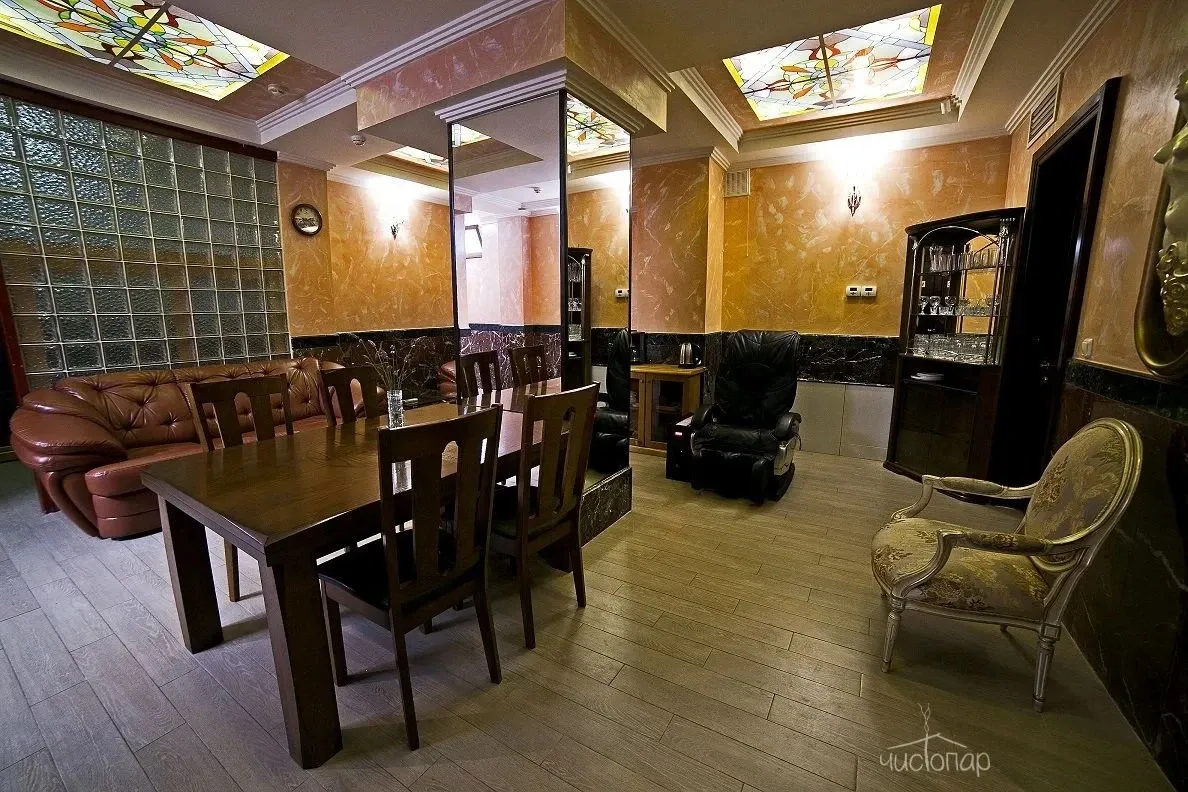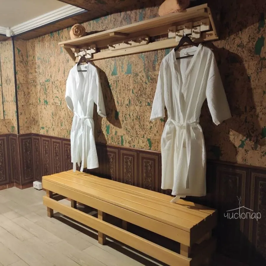 Пространство сауны рассчитано на компании до 15 человек. Для вас есть купель, а также душевые. Финскую парную для гостей разогревают до 90—110°C. За раз в ней могут находиться 6—8 человек. После тепловых процедур вы переместитесь в банкетную зону, оснащенную мягкой мебелью, кондиционером, ТВ, Wi-Fi, караоке, массажным креслом. Здесь же можно поиграть в настольные игры: нарды, карты, шашки, самостоятельно приготовить чай в настоящем самоваре. В мини-баре представлены освежающие напитки, пиво, мясные и сырные нарезки, закуски к пенному. Перед посещением, гостям бесплатно выдают банные принадлежности: одноразовые тапочки, простыни, полотенца, шапки для парилки.