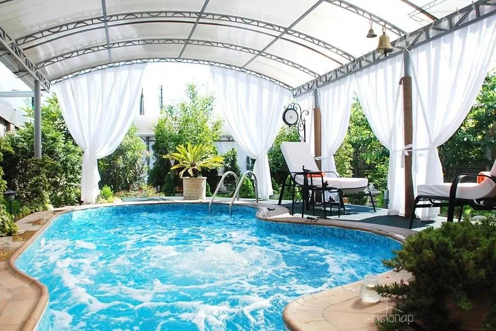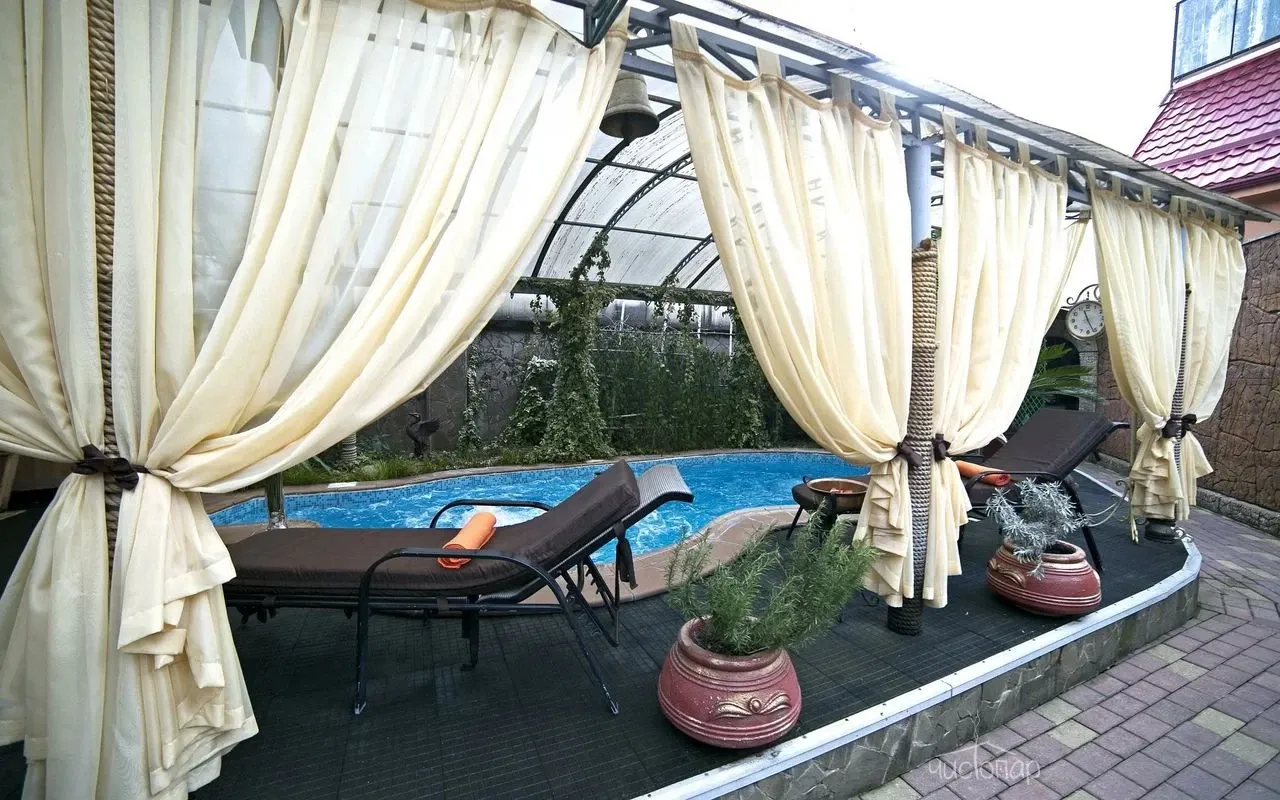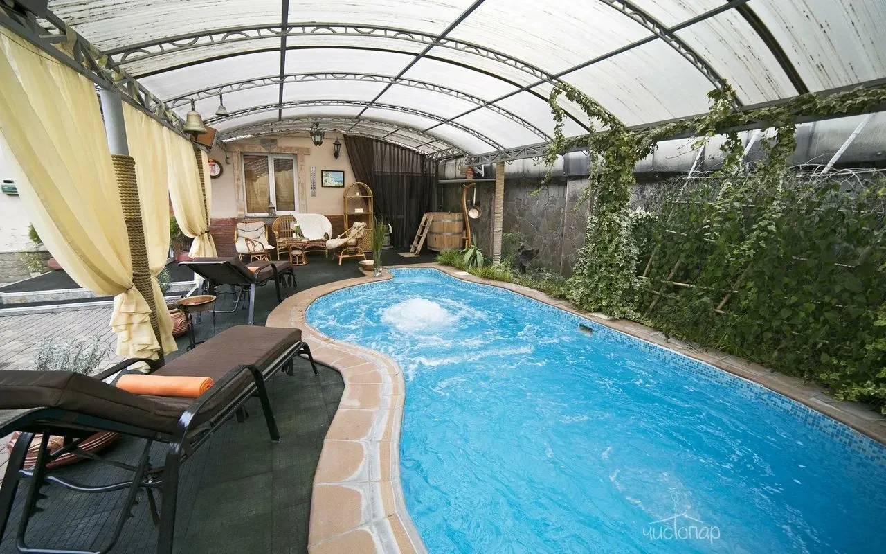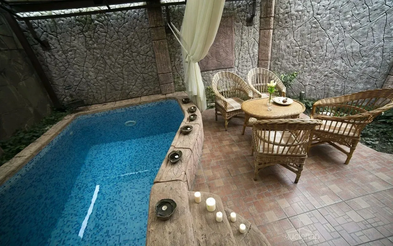 Комплекс включает в себя приватную территорию, бассейн с подогретой водой, купель, зону отдыха.