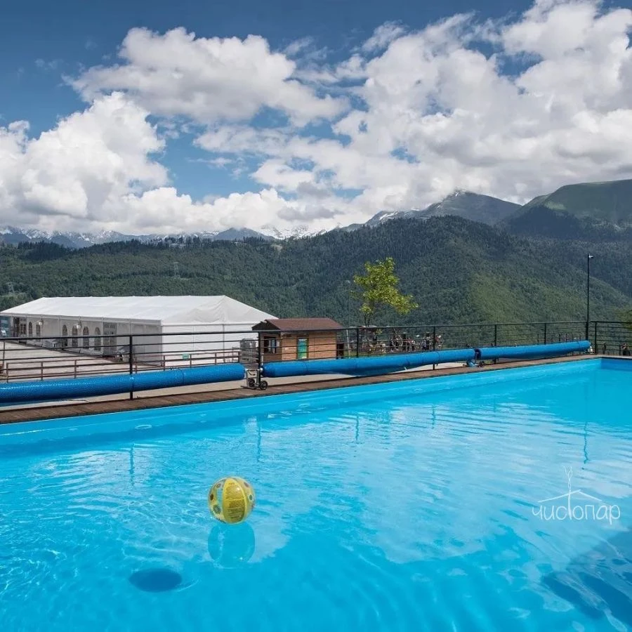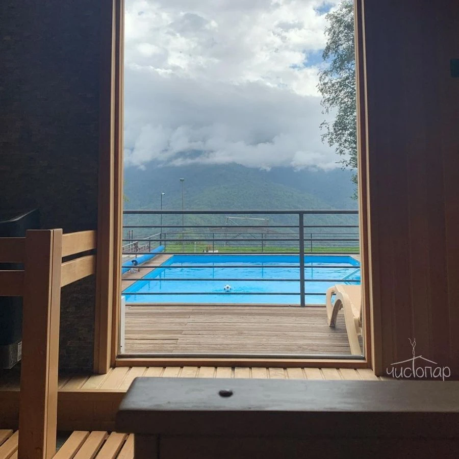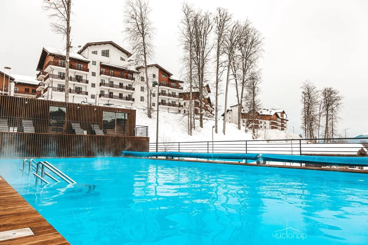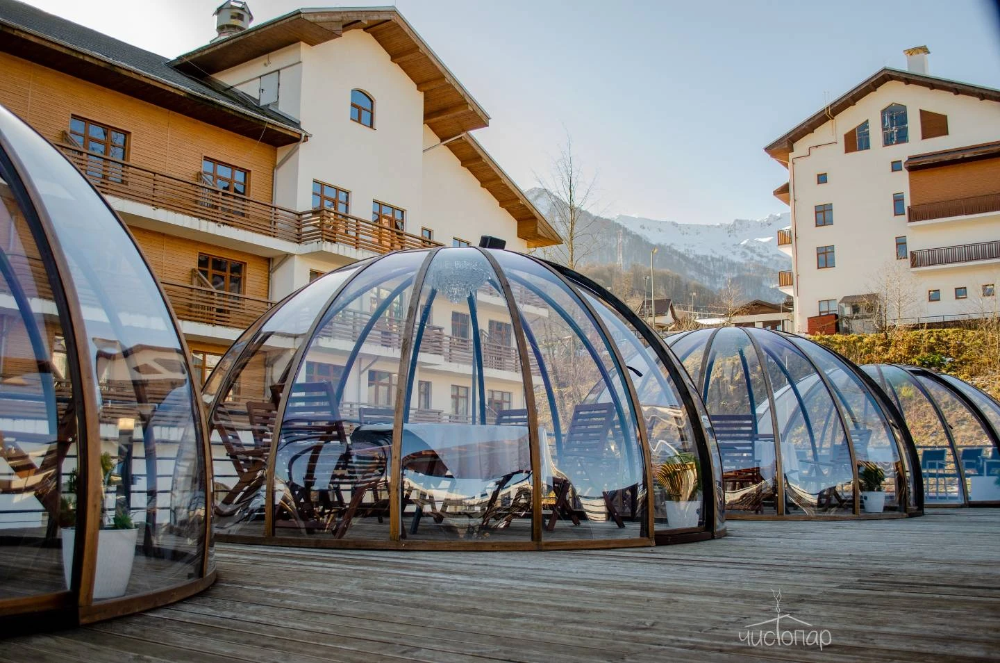 В парке есть круглогодичный подогреваемый бассейн с зоной лежаков под открытым небом, вместительная баня с панорамными окнами и видом на горы, гастробар, иглу-бар.