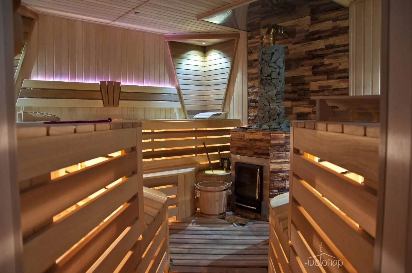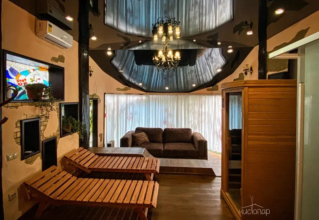 - Традиционная русская баня под веник, отделанная канадским кедром, что делает парение в ней по-настоящему целебным для здоровья и психоэмоционального состояния.