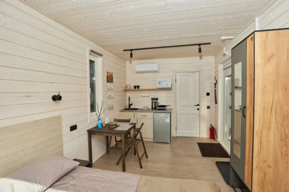 Комфорт студио (вторая береговая линия)Комфортный гостевой домик для двоих 18м2, с панорамным видом на Онежское озеро и сосны.