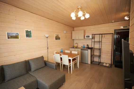 Дополнительное место предоставляется только в домиках категории "Комфорт с сауной" и "Комфорт плюс" на диване в гостиной комнате. Дополнительных мест в "Комфорт студио" нет.
