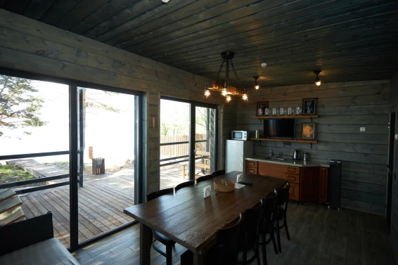 Каждый домик оснащен бесплатным Wi-fi, спутниковым телевидением, кухней с холодильником, плитой и микроволновкой; санузел с горячим душем; у каждого домика своя мангальная зона; также мы предоставляем парковочное место