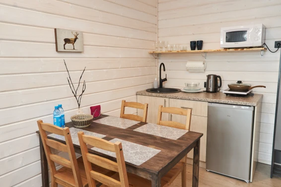 - кухня со всем необходимым (маленький холодильник, чайник, плита с одной конфоркой, микроволновка, посуда для приготовления и приема пищи);