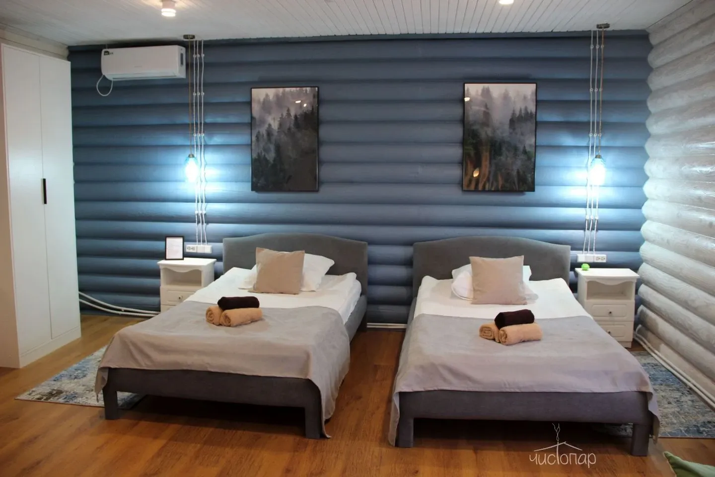 2 этаж: две спальни с 2-х спальной кроватью и 1,5 — спальными кроватями и шкафом. Зона отдыха со стилизованной деревянной мебелью.