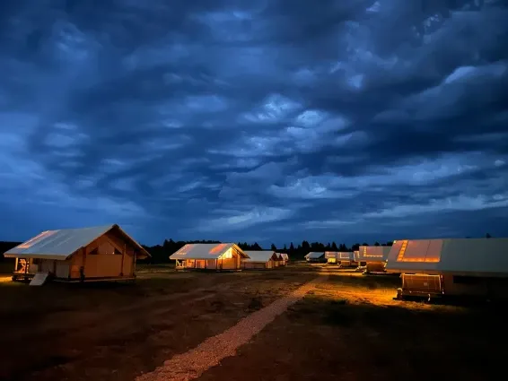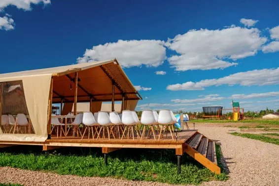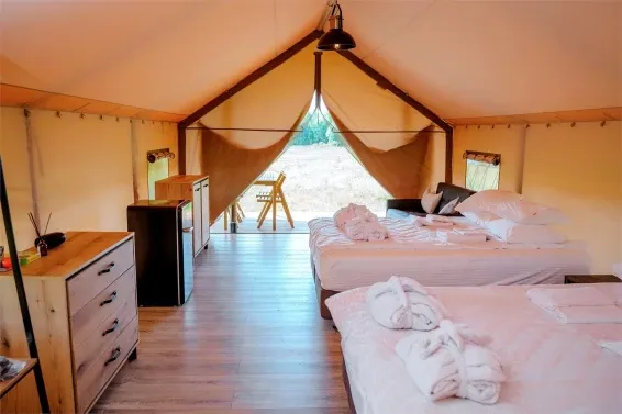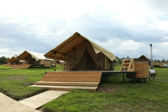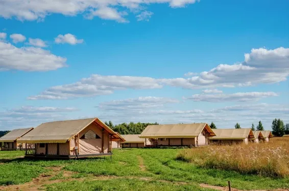 На охраняемой территории глэмпинга на 6 га расположены 12 комфортабельных, благоустроенных сафари-тентов, а также вся инфраструктура, необходимая для яркого и незабываемого отдыха на природе с семьей или друзьями.